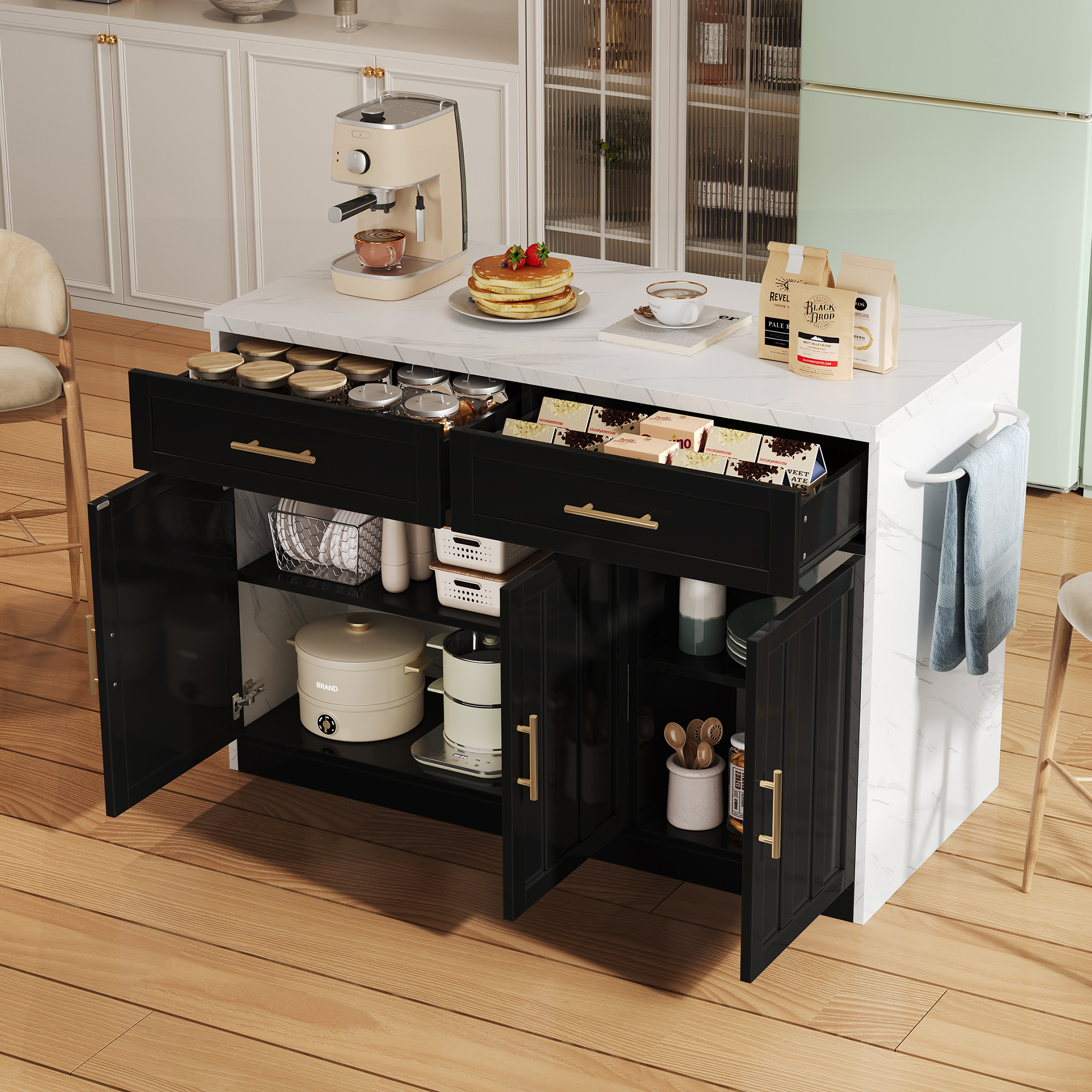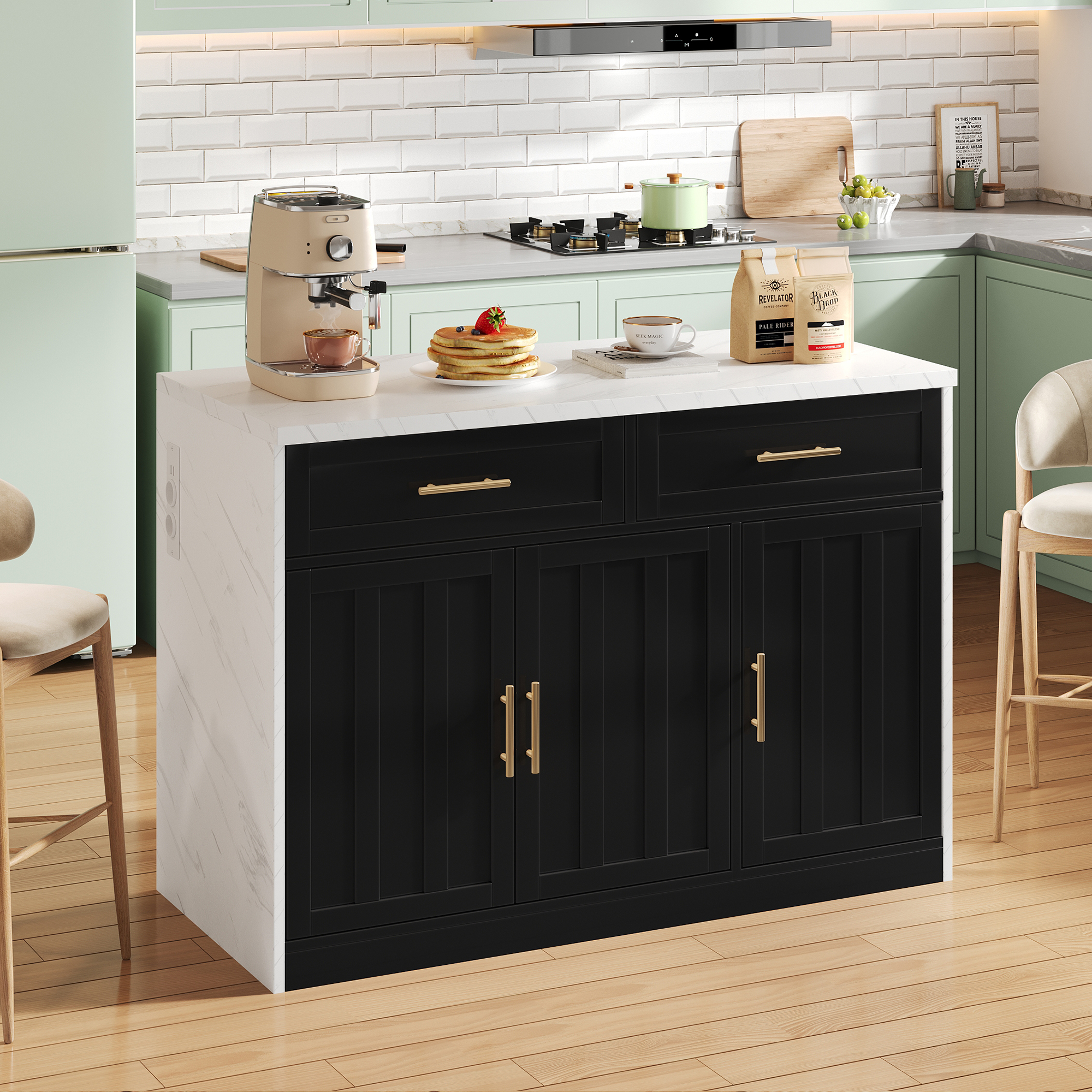 Käytännön ominaisuudet: Saarekkeen sivulla on integroidut eurooppalaisten standardien mukaiset pistorasiat (2 × pistorasiaa, 2 × USB-porttia, mukaan lukien 1,5 m pitkät kaapelit) keittiökoneille tai latureille, ja vastakkaisella puolella on valkoinen metallinen pyyhekuivain – hyvin harkittu jokapäiväiseen käyttöön.