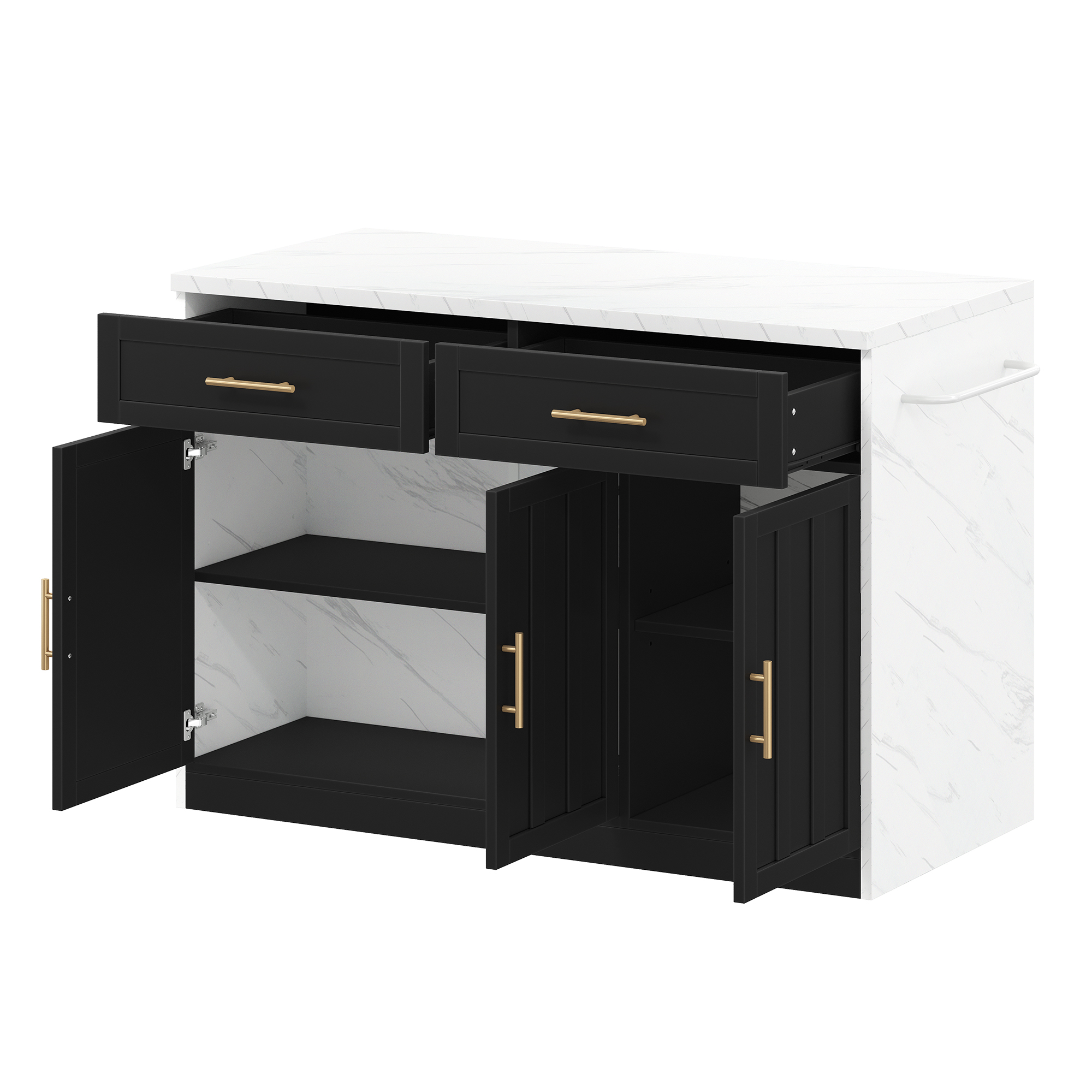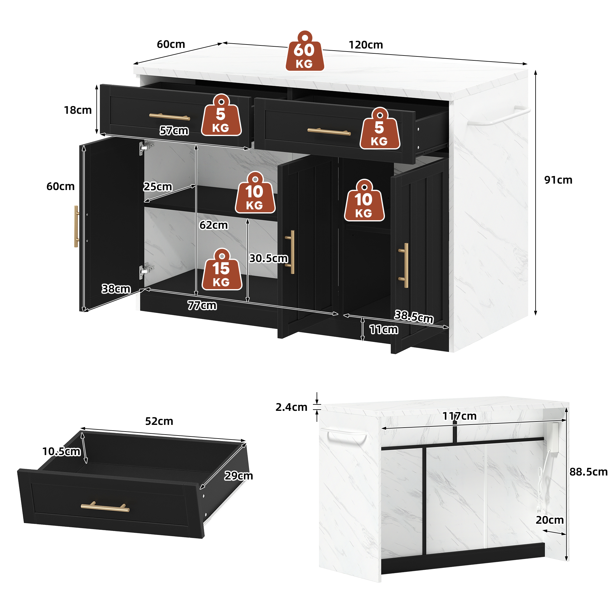 Korkealaatuinen työjälki: Saareke on valmistettu keskipaksusta kuitulevystä (MDF) ja siinä on 2,4 cm paksu työtaso, jossa on valkoinen marmorikuvio ja valkoinen melamiinipinnoite. Karmiovet on pinnoitettu ympäristöystävällisellä maalilla ja niissä on tyylikkäät metallikahvat – kestävyyden, tyylin ja helpon hoidon takaamiseksi.