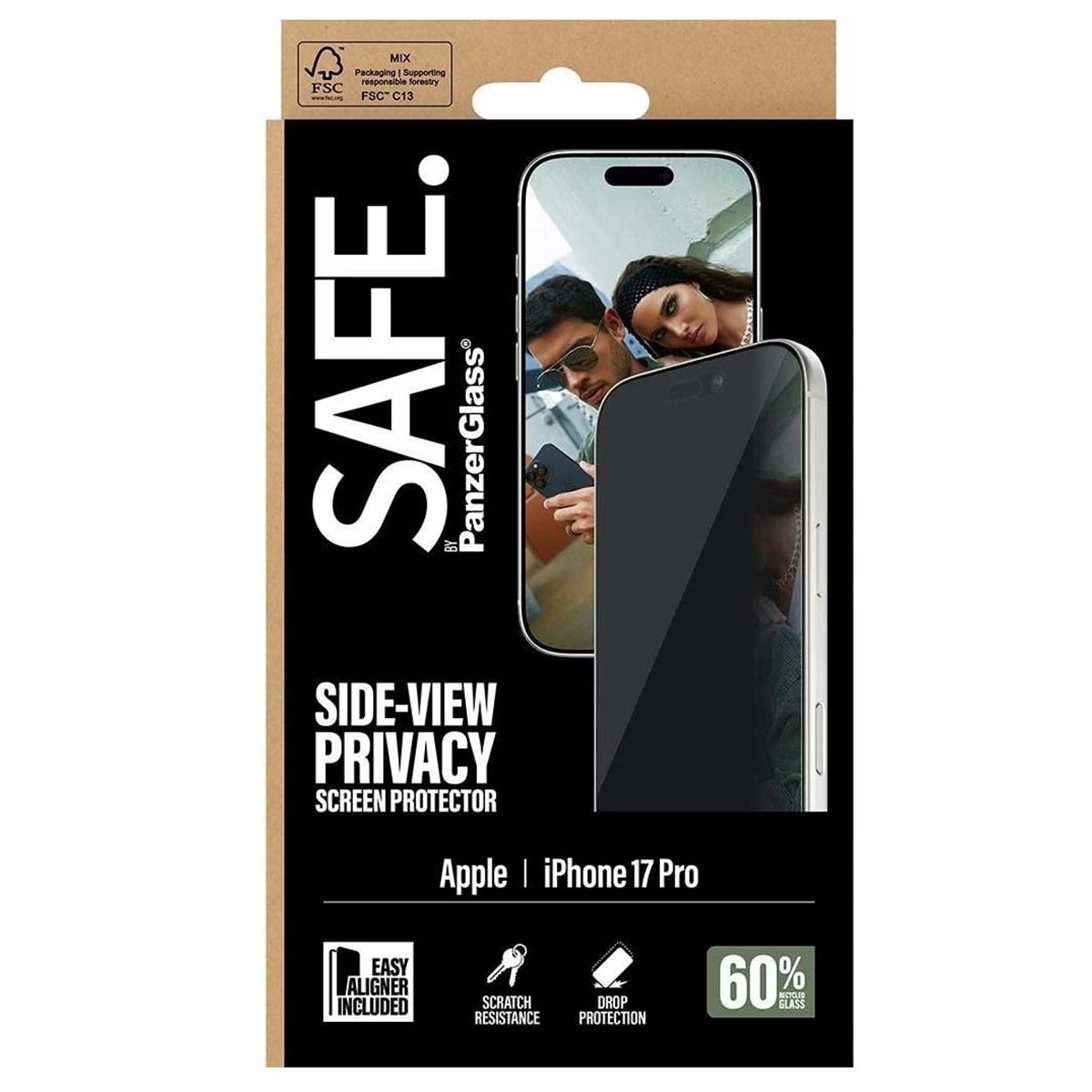 SAFE by PanzerGlass anti-spyware näytönsuoja iPhone 17 Pro. Sivun yksityisyyssuodatin, suojaa uteliailta katseilta säilyttäen samalla täydellisen etunäkyvyyden. Naarmuja ja iskuja kestävä, helppo asentaa mukana tulevan EasyAlignerin ansiosta. Erittäin leveä formaatti maksimaalisen peittävyyden takaamiseksi. Sivun yksityisyyssuodatin suojaa tietojasi. Erittäin leveä formaatti reunasta reunaan ulottuvaa kattavuutta varten. Erittäin kestävä karkaistu lasi suojaa naarmuilta ja iskuilta. Helppo asennus EasyAlignerin avulla. 60 % kierrätettyä lasia ekologisesti vastuulliseen suunnitteluun