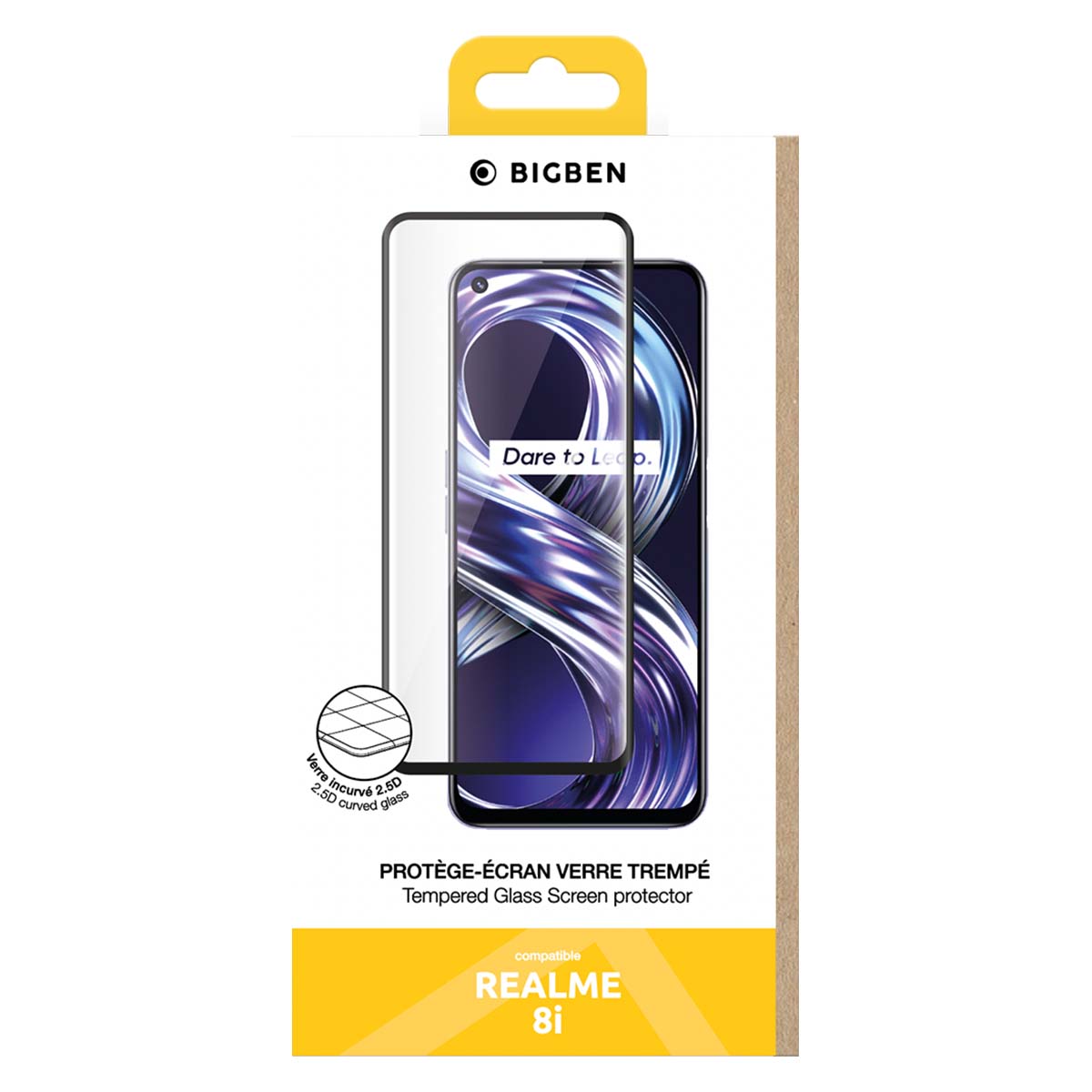 RealMe 8i:n 2,5D-karkaistua lasia oleva näytönsuoja suojaa näyttöä tehokkaasti jokapäiväisiltä kolhuilta ja naarmuilta. Sen 2,5D-muotoilu, jossa on hieman pyöristetyt reunat, parantaa kosketusmukavuutta ja vähentää kolhuja. Erittäin kestävä lasi auttaa vaimentamaan iskuja putoamisen yhteydessä säilyttäen samalla erinomaisen näytön kirkkauden ja sujuvan kosketusherkkyyden. Puhdistussarja mukana puhdasta asennusta varten.