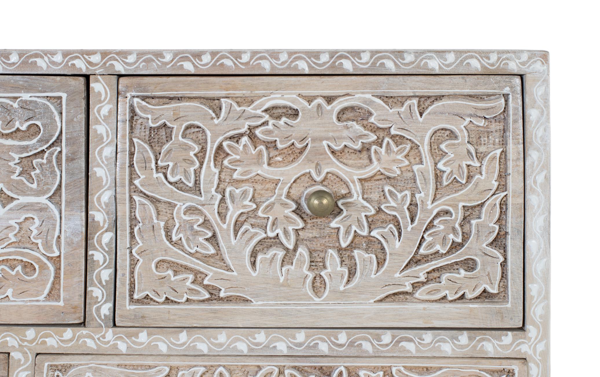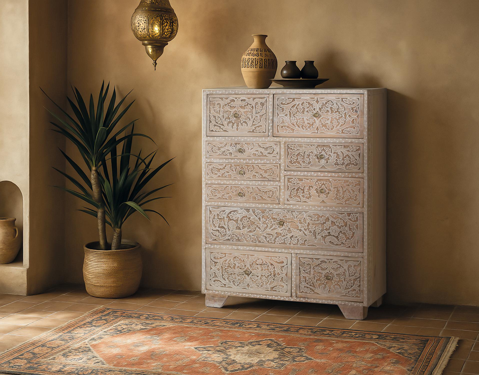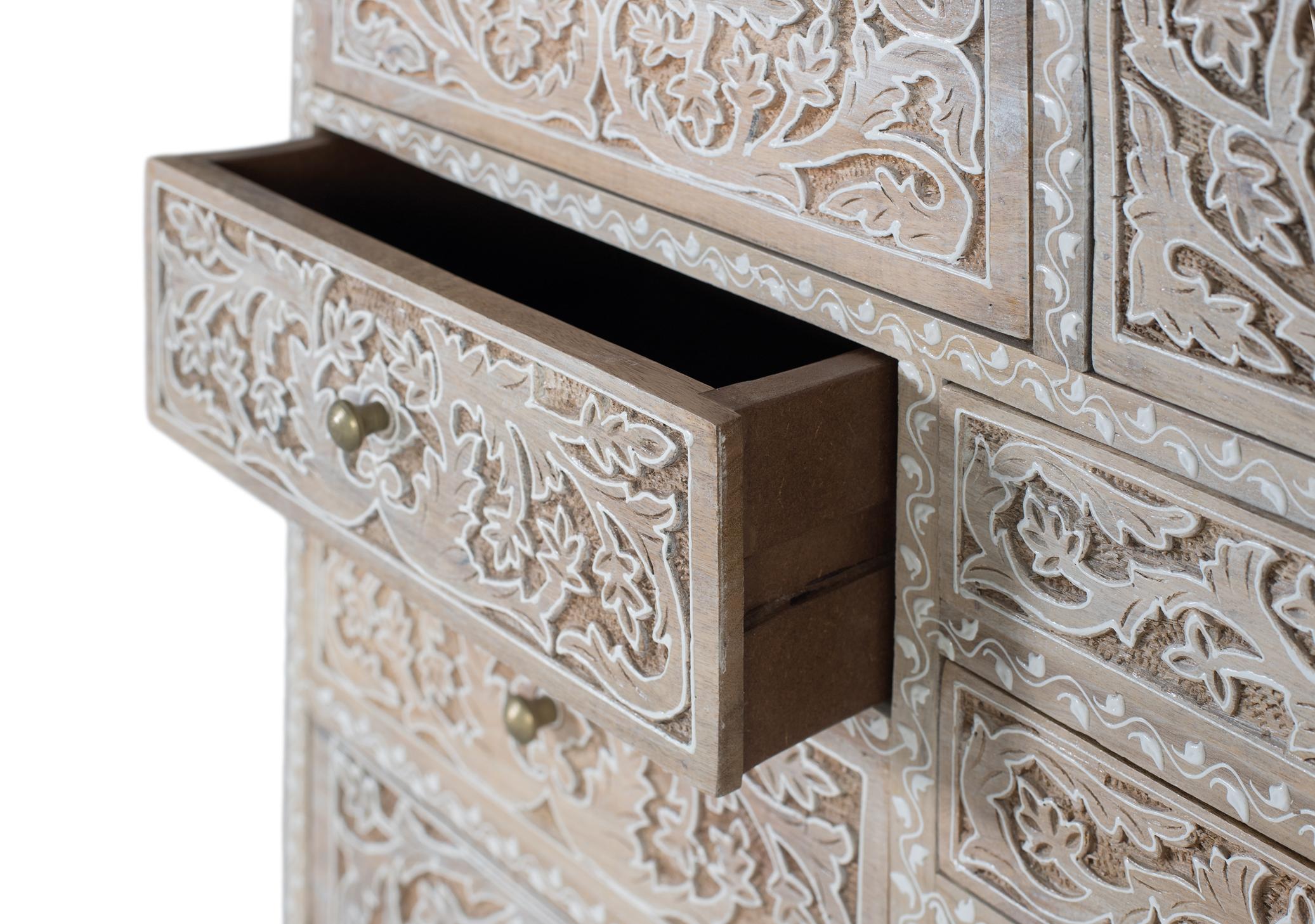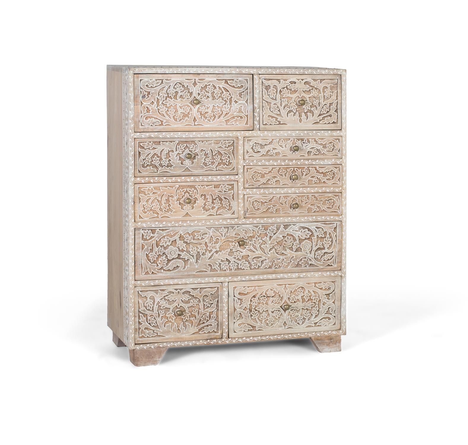 Tämä on mangopuusta valmistettu lipasto, jossa on kymmenen erikokoista laatikkoa. Sen erottuvin piirre on taidokas käsityötaito: laatikoiden etuosat on käsin kaiverrettu kukka- ja kasviaiheilla. Kaiverrukset on korostettu valkoiseksi kalkitulla pinnalla, joka korostaa kohokuvaa luonnonpuuta vasten. Lipaston yläreunassa on herkkä kaiverrusyksityiskohta, joka kehystää kappaletta hienovaraisesti. Lipasto lepää pienillä suorakaiteen muotoisilla jaloilla, jotka nostavat sitä hieman irti lattiasta tarjoten vakautta ja näyttävää läsnäoloa. Ylälevyn paksuus: 1,6 CM; Jalkojen korkeus: 5 CM