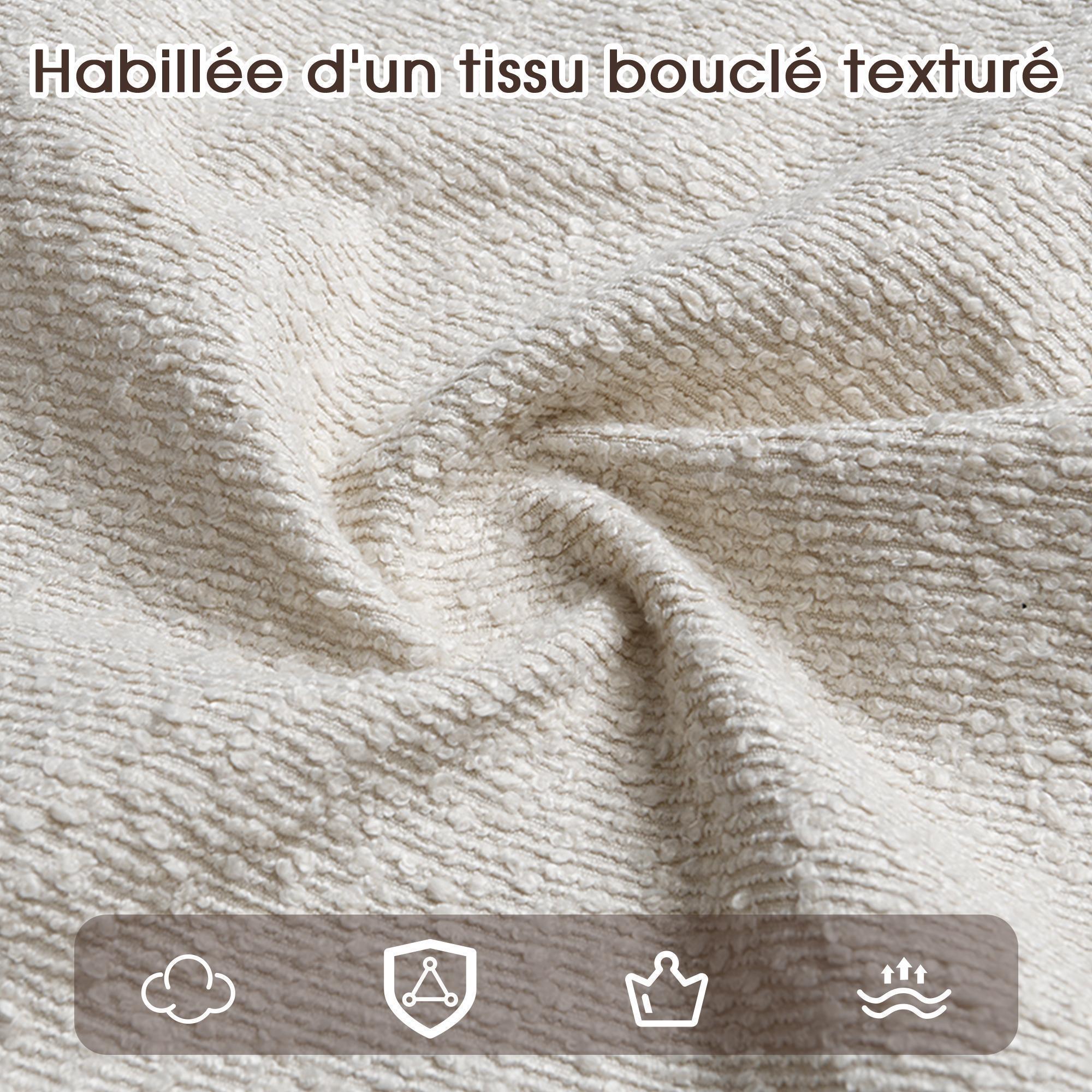 Tyylikäs bouclé- kangas – Tuoli on verhoiltu laadukkaalla bouclé-kankaalla, joka tuntuu pehmeältä ja miellyttävältä ja tarjoaa samalla jalon ja modernin ilmeen.
