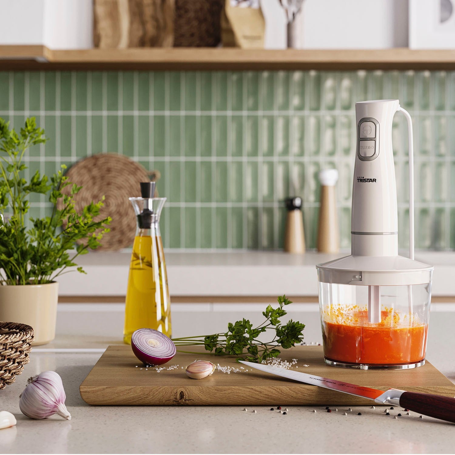 Mukana toimitettu leikkuri on varustettu ruostumattomasta teräksestä valmistetuilla terillä, jotka sopivat täydellisesti vihannesten, pähkinöiden ja muiden tarkkaan pilkkomiseen. Vispilä on ihanteellinen kerman tai kananmunien vatkaamiseen, mikä lisää monipuolisuutta keittiötehtäviisi. Sarjan mukana tulee myös kätevä mittakuppi, jonka avulla voit mitata ainekset tarkasti.