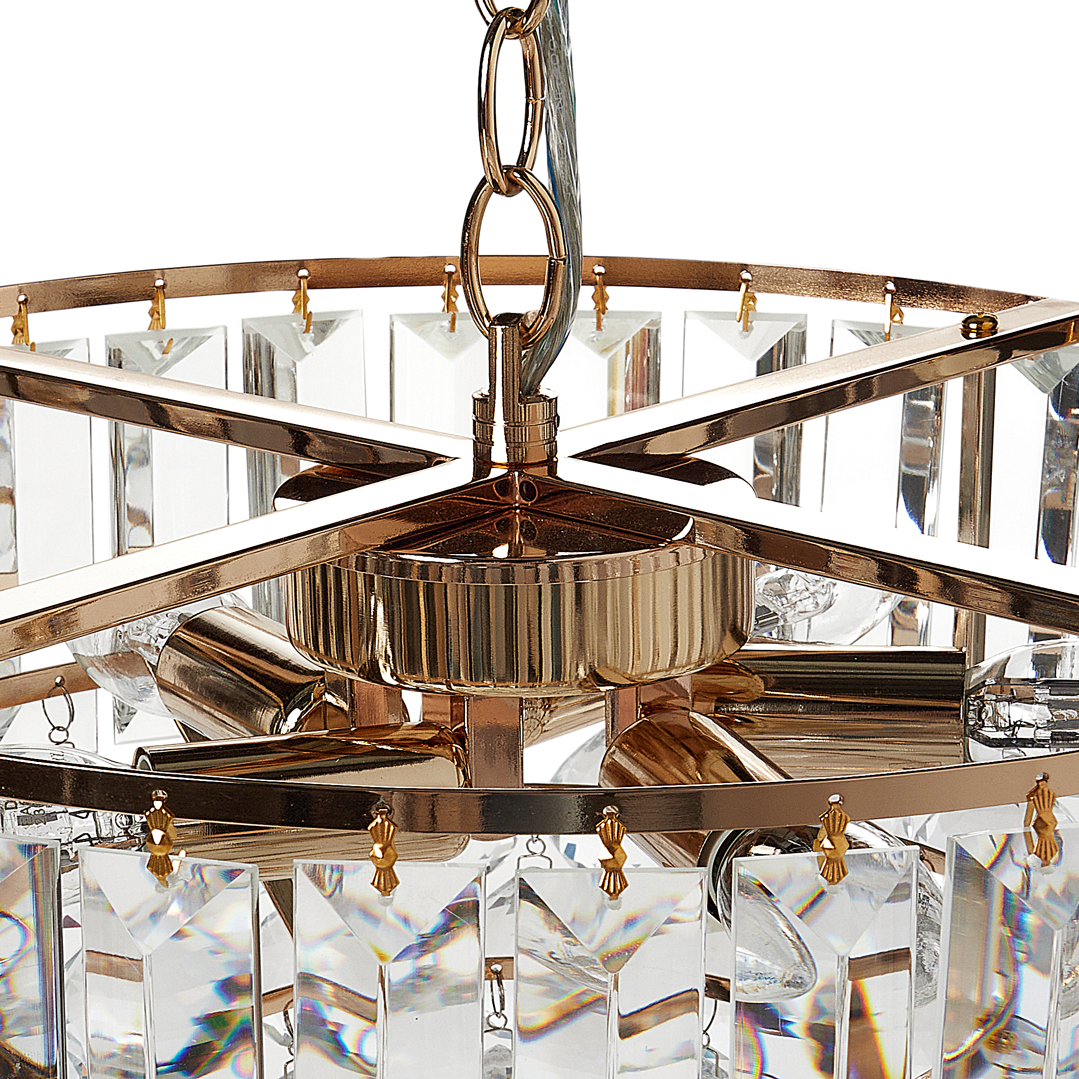 Glamour-tyylinen kristallikruunu. Tämä kattokruunu on ylellinen keskipiste, joka lisää eleganssia mihin tahansa sisustukseen. Se on valmistettu kullanvärisestä metallista, jota koristavat tyylikkäät kristallit, jotka heijastavat kauniisti valoa ja luovat unohtumattoman tunnelman. Sen lumoava muotoilu korostaa mitä tahansa huonetta hienostuneella kosketuksella.