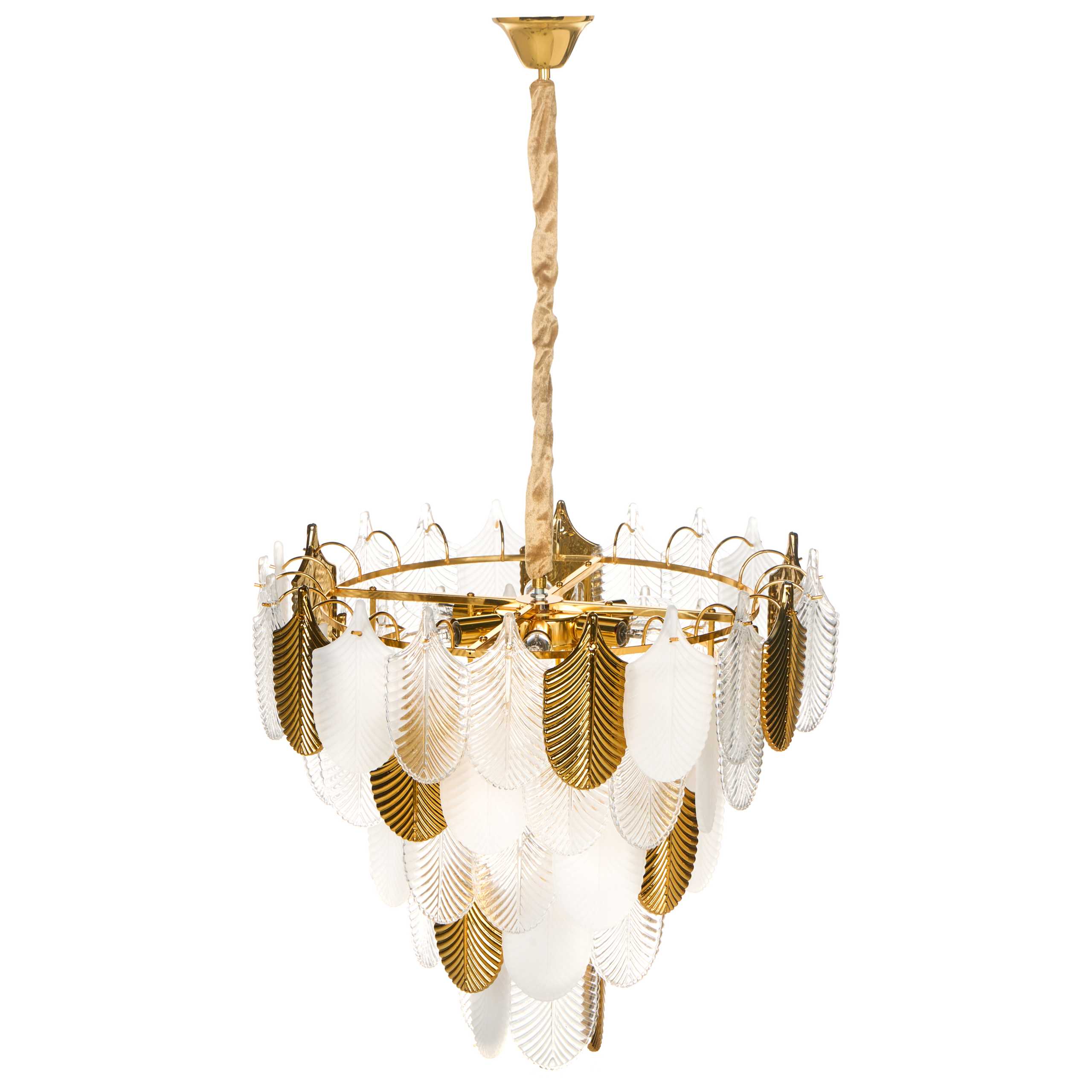 Tyylikäs kerrostettu kruunuvalaisin. Tämä upea kattokruunu kohottaa eleganssin uusiin korkeuksiin. Sen kerrostettua rakennetta korsitavat kaskadimaisesti asetellut huurretut, kirkkaat ja kullanväriset lasilehdet, jotka kaikki leikittelevät valolla omalla tavallaan – läpikuultavat hajottavat valon pehmeästi ja kullanväriset heijastavat lämmintä hehkua, mikä luo lumoavan varjojen ja kiillon leikin. Valaisin sopii erinomaisesti sisustuksiin, joissa arvostetaan hienostuneita yksityiskohtia ja rohkeutta. Se muuttaa minkä tahansa ruokailutilan tai olohuoneen näyttäväksi kokonaisuudeksi.