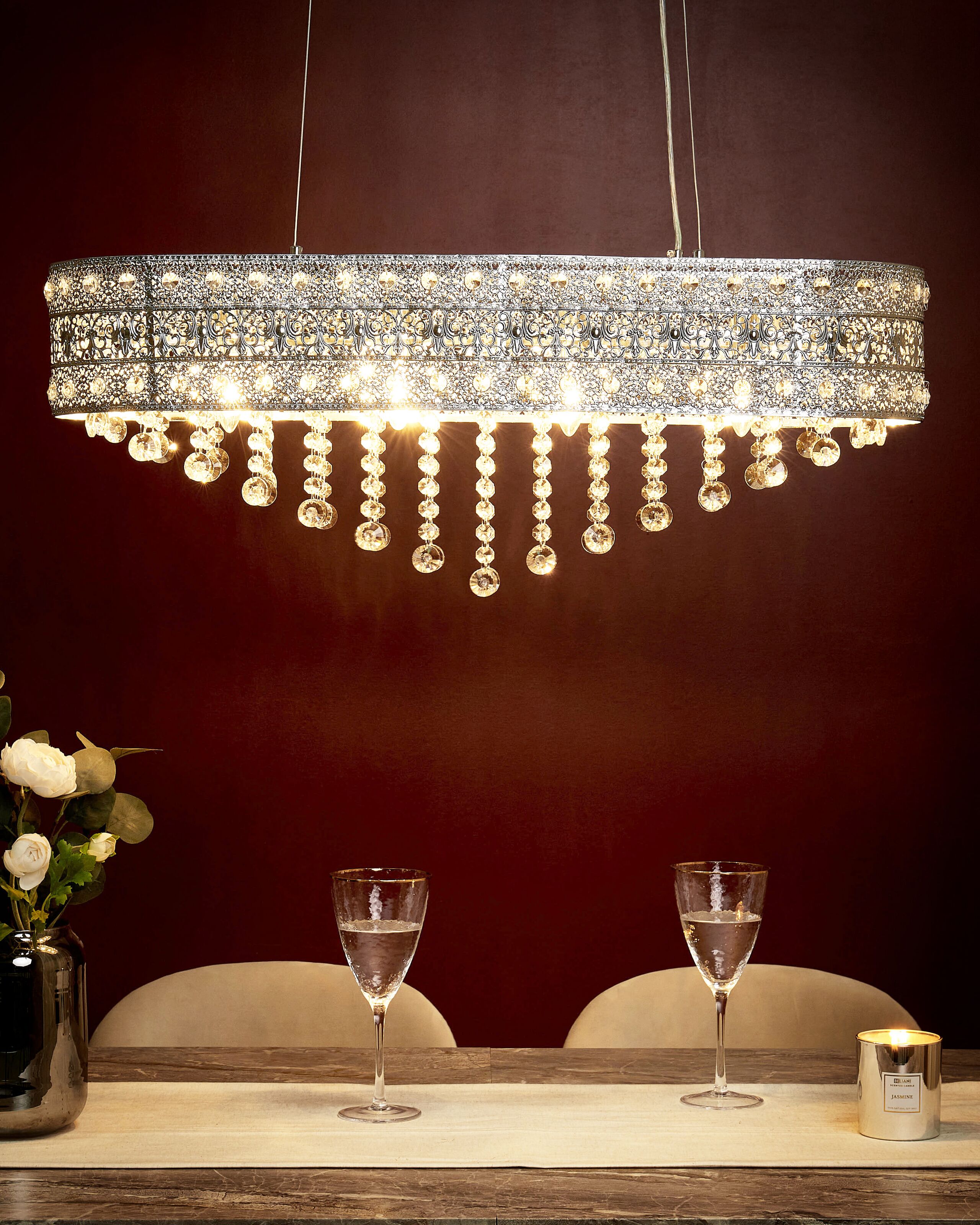 Tyylikäs kruunuvalaisin lasikristalleilla. Tämä raudasta valmistettu kattokruunu omaa tyylikkään kromatun viimeistelyn, joka tekee siitä upean keskipisteen mihin tahansa glamour-tyyliseen sisustukseen. Sen hienostunutta muotoilua korostavat koristeelliset kimaltelevat lasikristallit, jotka heijastavat valoa ja lisäävät eleganssia. Kristallikruunu sopii sekä moderneihin että perinteisiin tiloihin, kohottaen minkä tahansa huoneen esteettistä ilmettä.