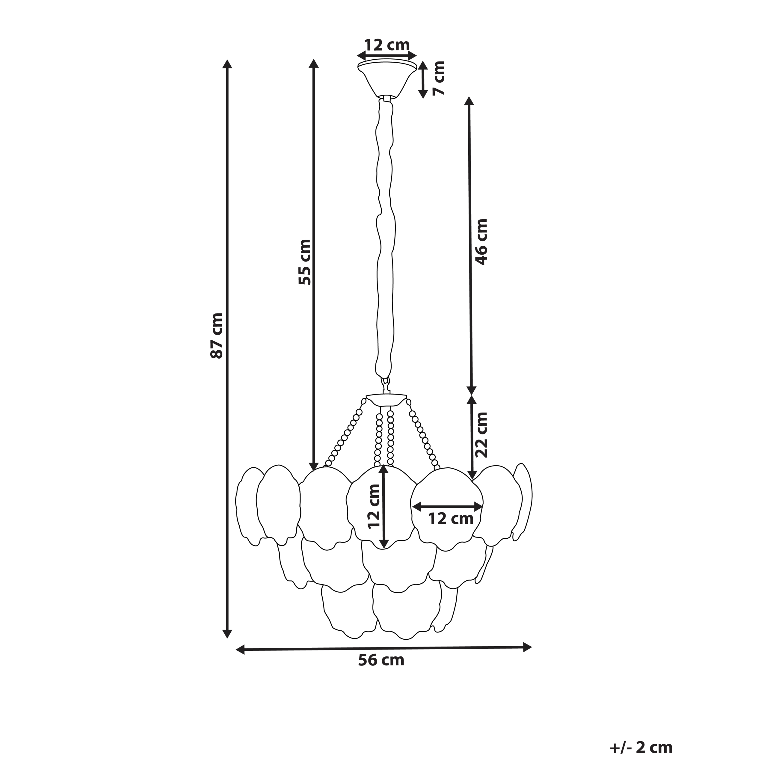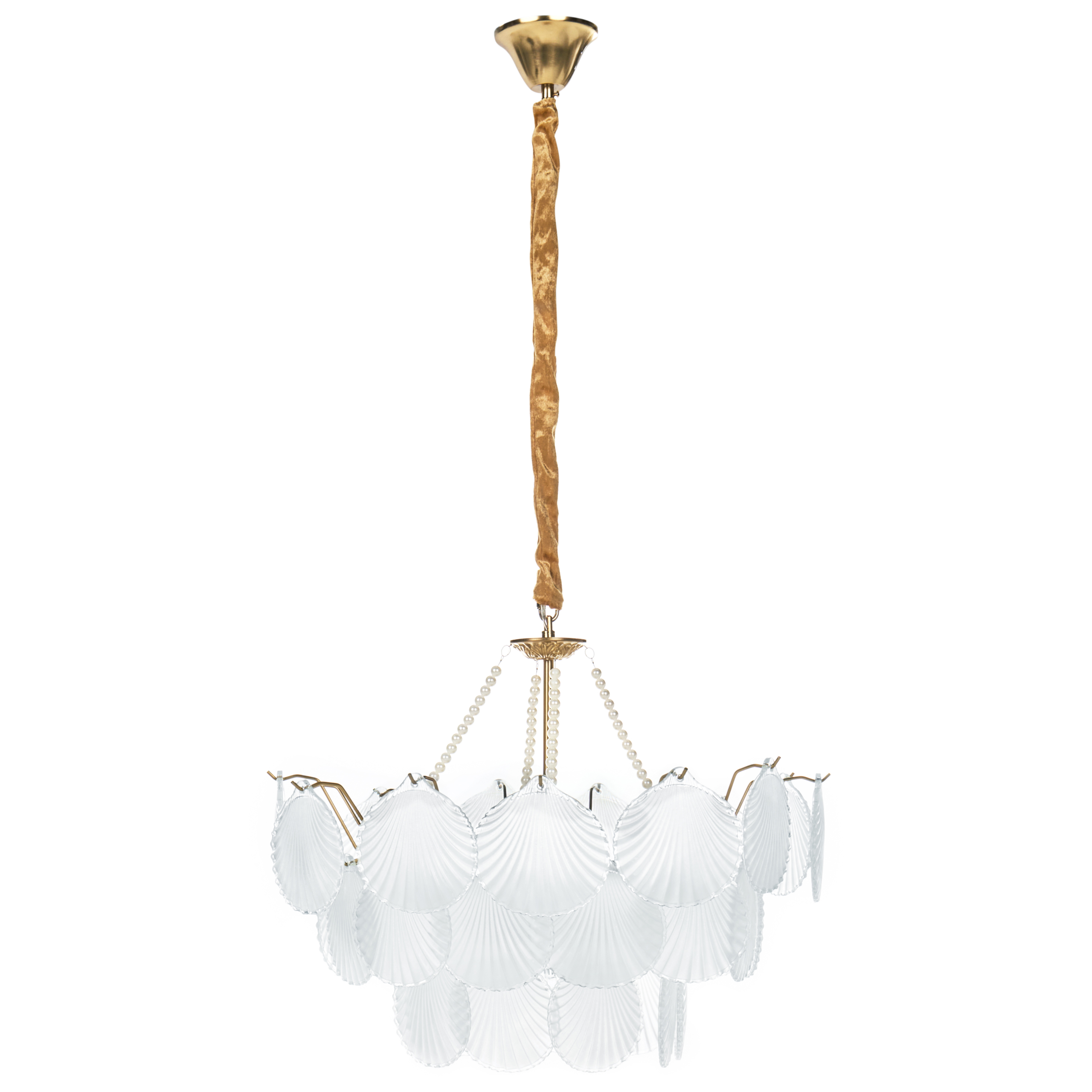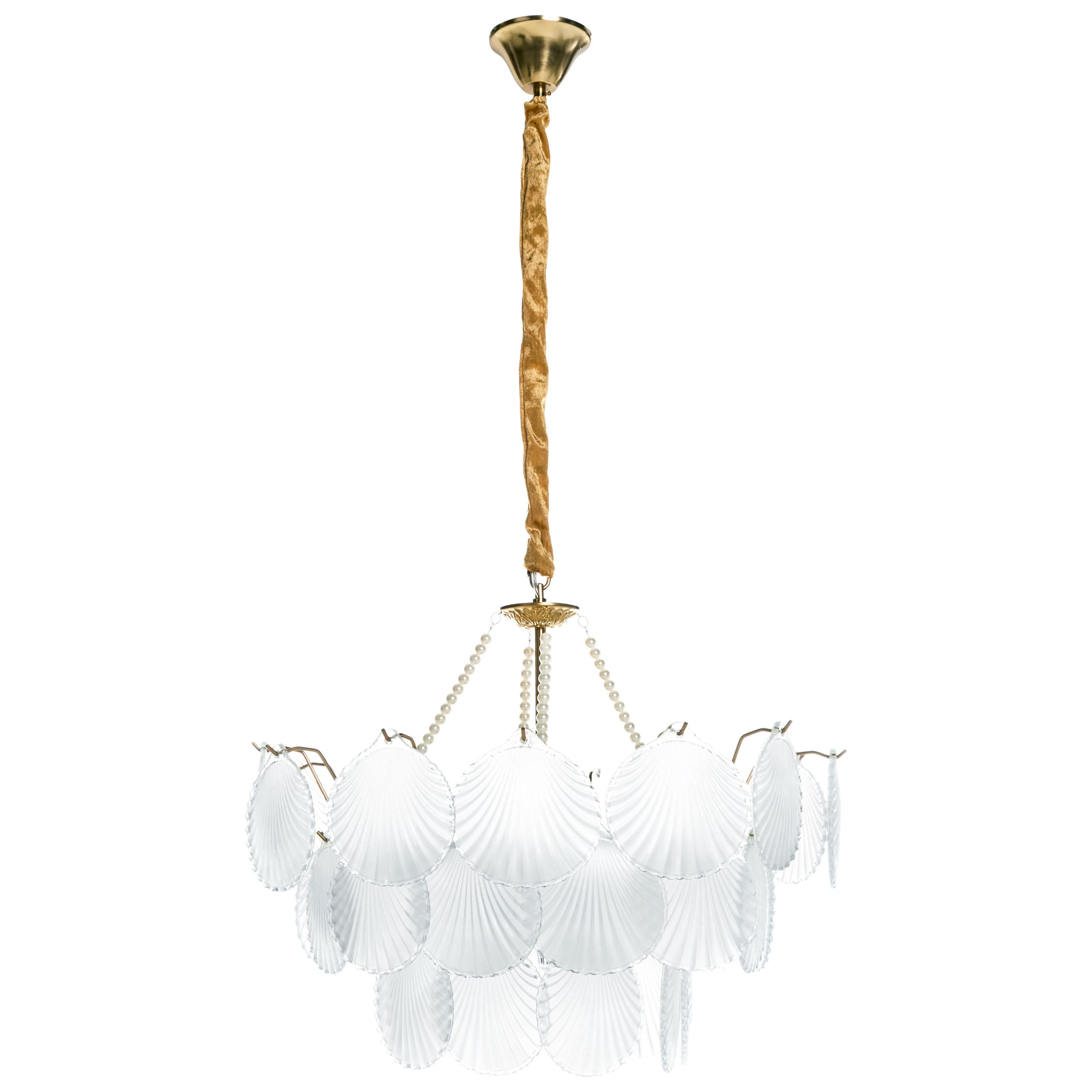 Glamour-tyylinen kerrostettu kruunuvalaisin. Tämä hienostunut kattokruunu koostuu huurretuista simpukoita muistuttavista lasielementeistä, jotka on järjestetty kauniisti tyylikkääseen messinginväriseen rautarunkoon. Kerrostettu muotoilu luo lämpimän, tunnelmallisen valon, joka sopii täydellisesti olohuoneisiin, ruokailutiloihin tai näyttäviin eteisiin. Vintage-viehätystä ja modernia eleganssia yhdistävä valaisin on ajaton keskipiste ja todellinen katseenvangitsija, joka kohottaa minkä tahansa sisustuksen uusiin korkeuksiin.