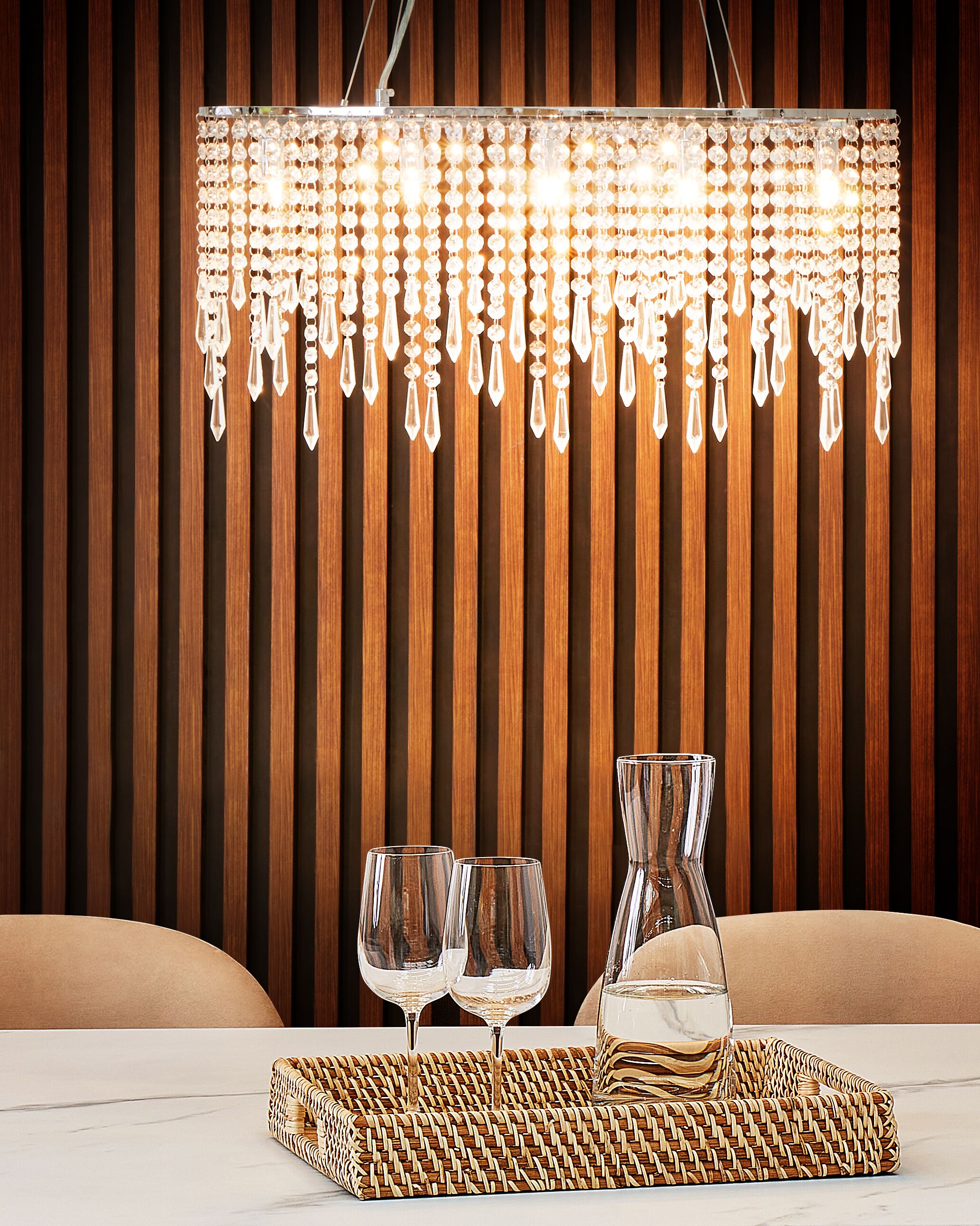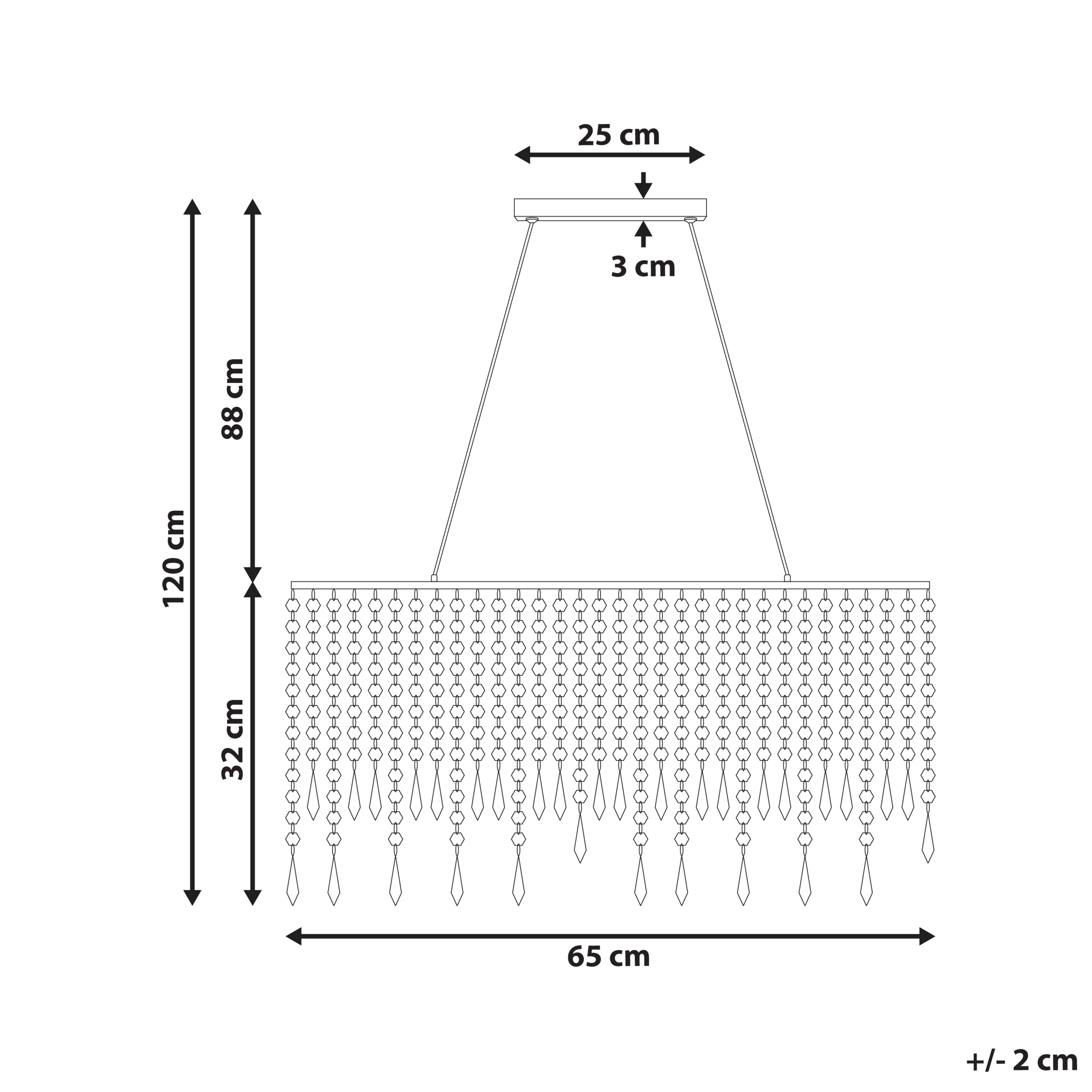 Koristeellinen kruunu lasikristalleilla. Tässä raudasta valmistetussa kattokruunussa on moderni kromattu viimeistely ja koristeelliset lasikristallit, jotka saavat sen sopimaan täydellisesti kaikkiin glamour-henkisiin sisustuksiin. Säädettävä johdon pituus ja korkeus mahdollistavat monipuolisen sijoittelun ja mukauttamisen mihin tahansa tilaan sopivaksi. Kattokruunun tyylikäs muotoilu ja peilipinnat tuovat ripauksen ylellisyyttä ja hienostuneisuutta mihin tahansa tilaan.