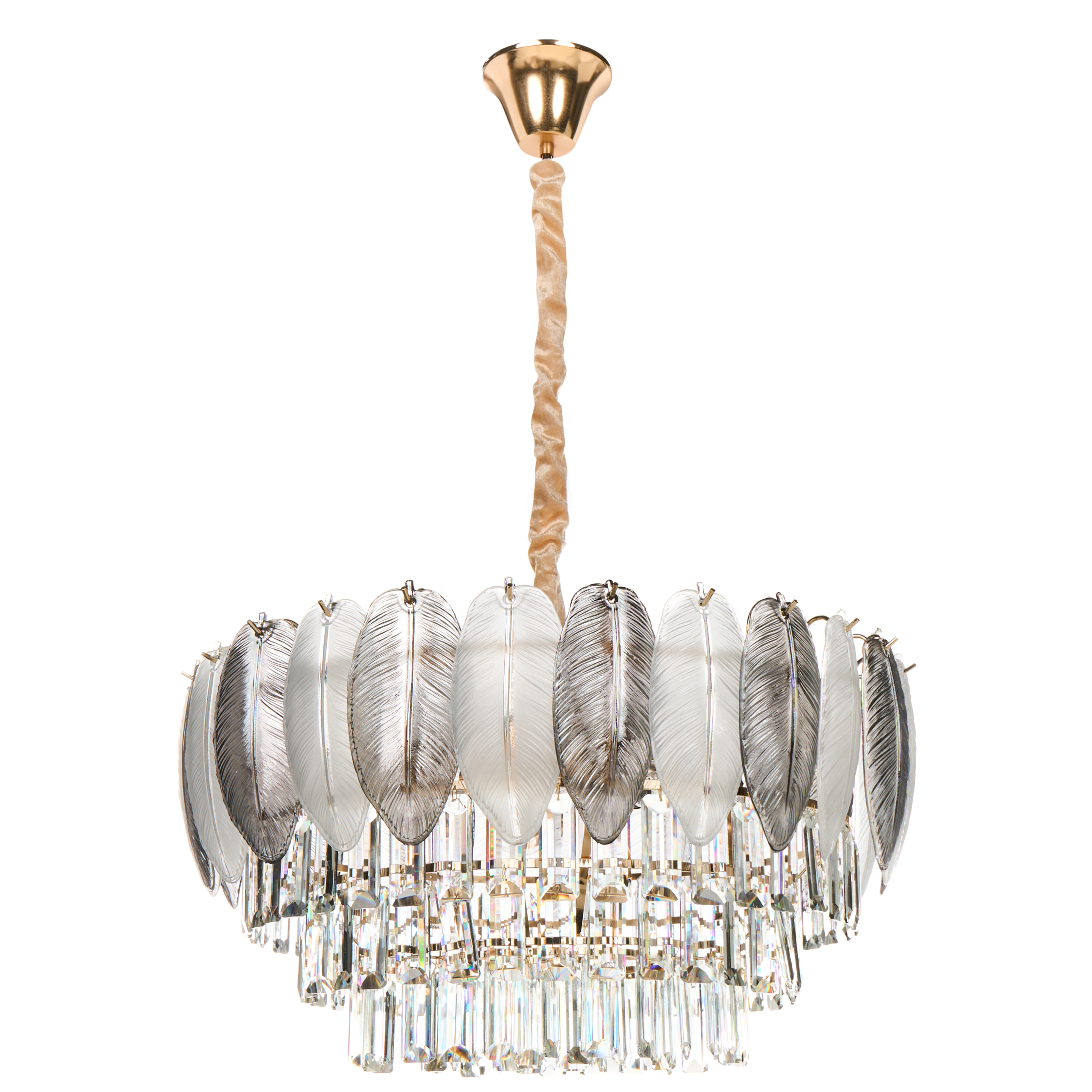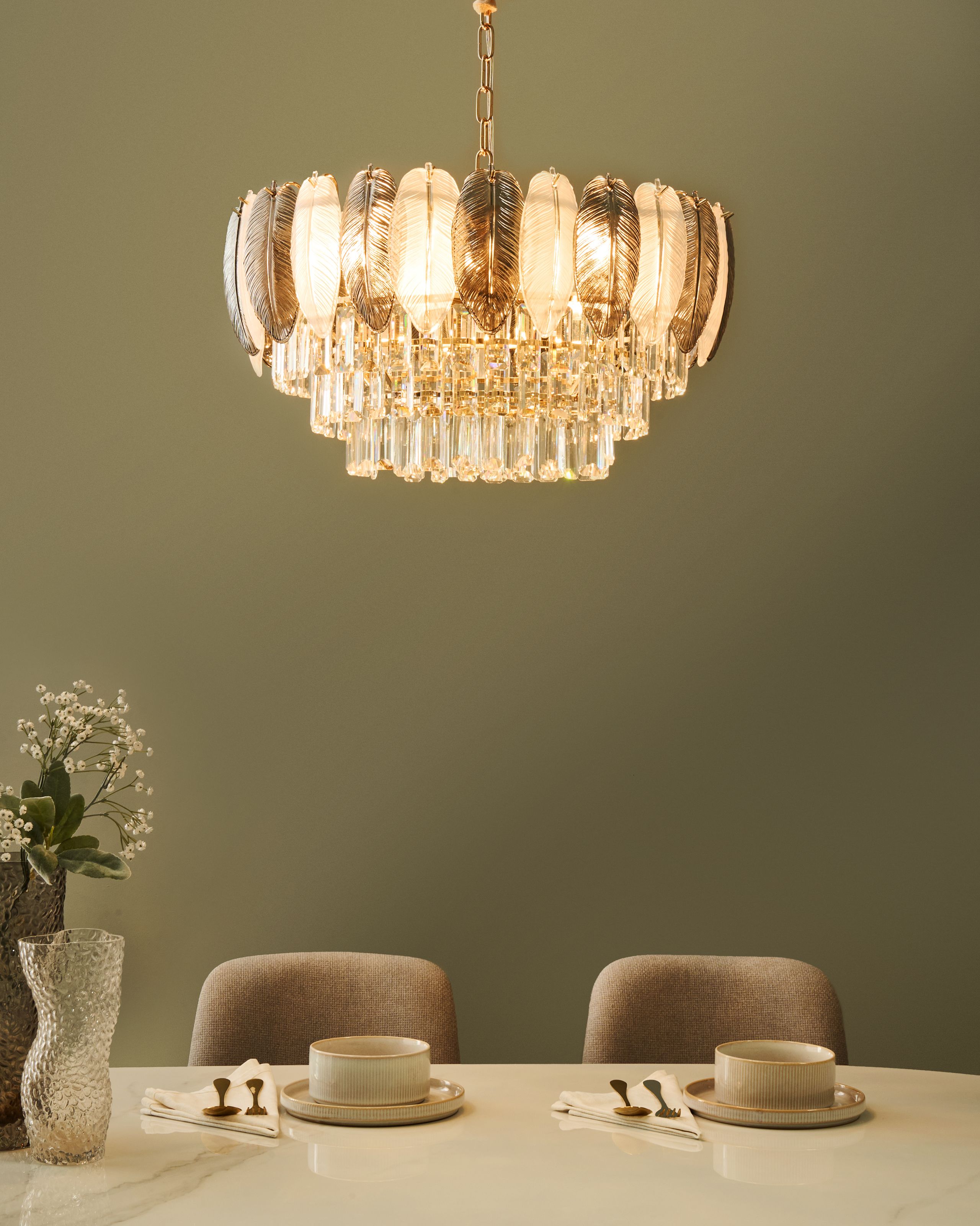 Glamour-tyylinen kattokruunu lasihöyhenillä. Tämä kattokruunu yhdistää huurteiset ja savuiset lasihöyhenet kimalteleviin koristekristalleihin, luoden unohtumattoman ja elegantin ilmeen. Kerrostettu sommittelu tarjoaa dynaamisen kontrastin mattapinnan ja kiillon sekä keveyden ja rakenteen välillä. Lämmin messinginvärinen rautarunko tarjoaa täydellisen yhdistelmän boho-glamouria ja nykyaikaista hienostuneisuutta, joka sopii erinomaisesti ruokailutiloihin, joissa vallitsee ylellinen mutta luova henki.