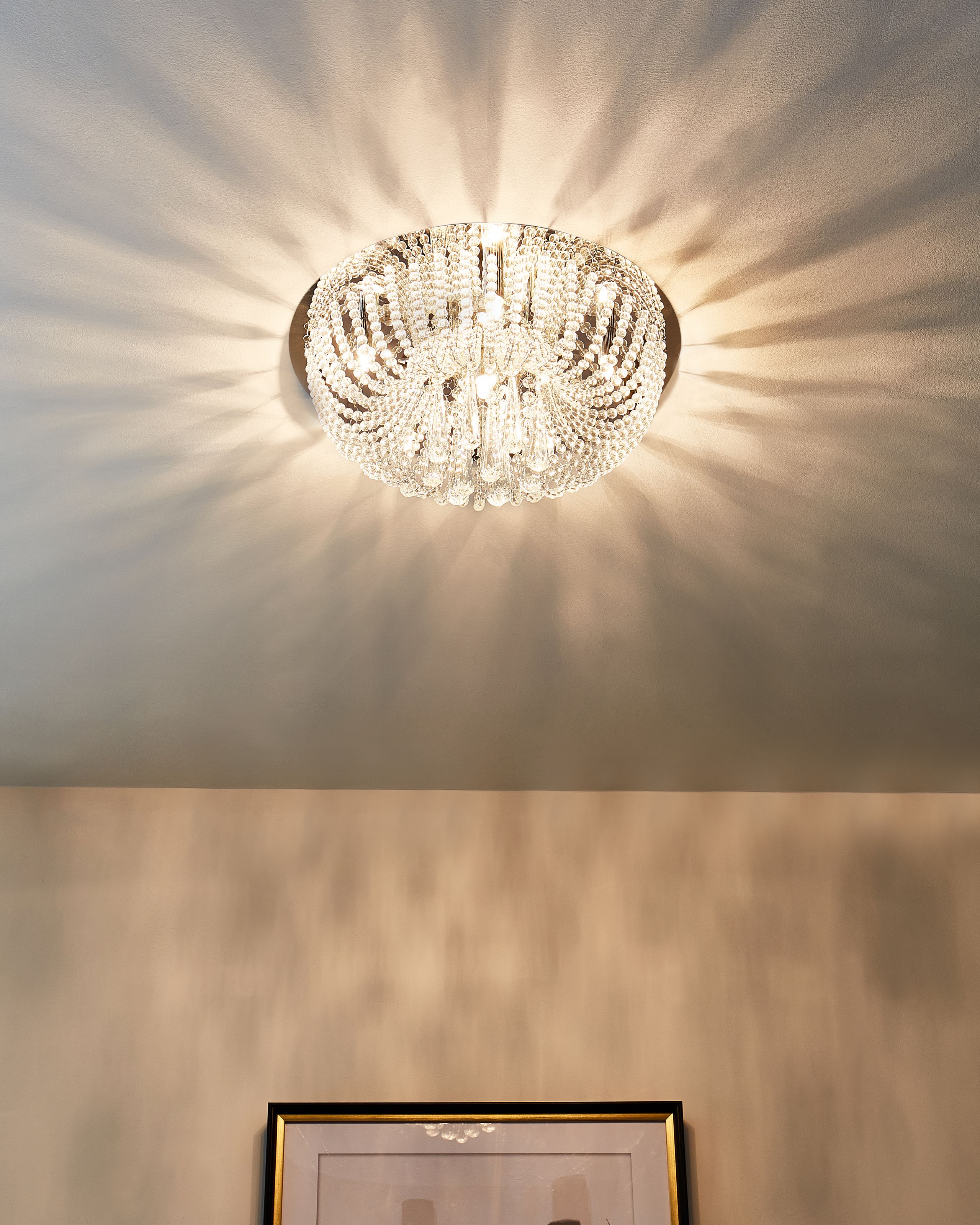 Tyylikäs kruunu lasihelmillä ja -kristalleilla. Tämä kestävästä raudasta valmistettu kromattu kattokruunu on koristeltu koristeellisilla lasihelmillä ja -kristalleilla, jotka tuovat eleganssia jokaiseen olohuoneeseen tai ruokailutilaan. Heijastava pinta ja hienostuneet yksityiskohdat levittävät valoa kauniisti ja luovat kiehtovan tunnelman. Kristallikruunu sopii ihanteellisesti glamour-tyylin inspiroimiin tiloihin, toimien sekä upeana keskipisteenä että pehmeän ja lämpimän valaistuksen lähteenä.