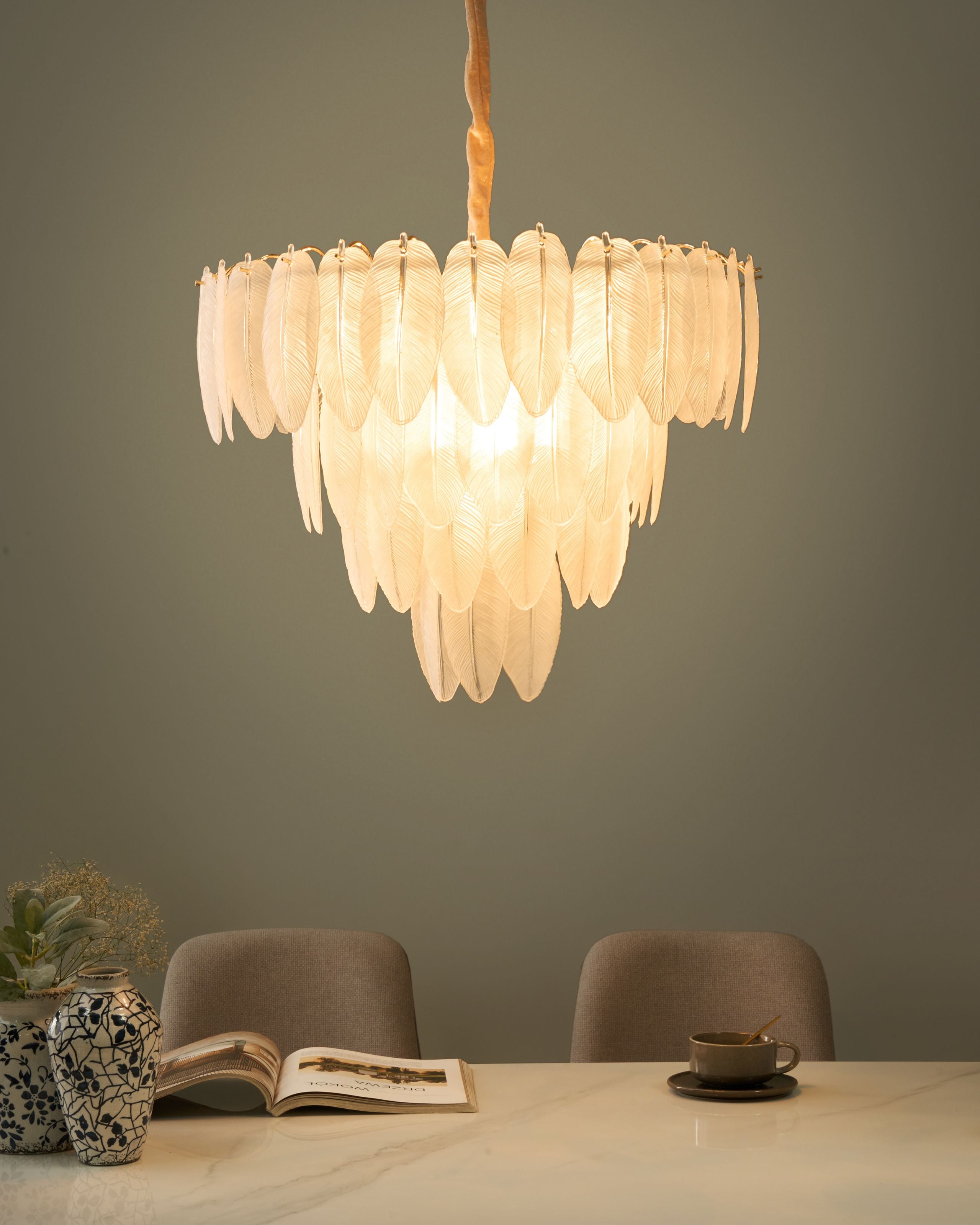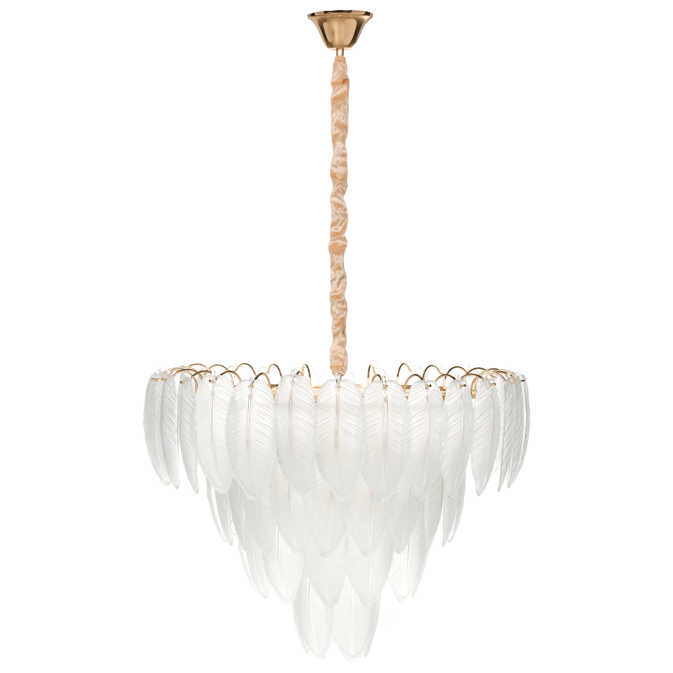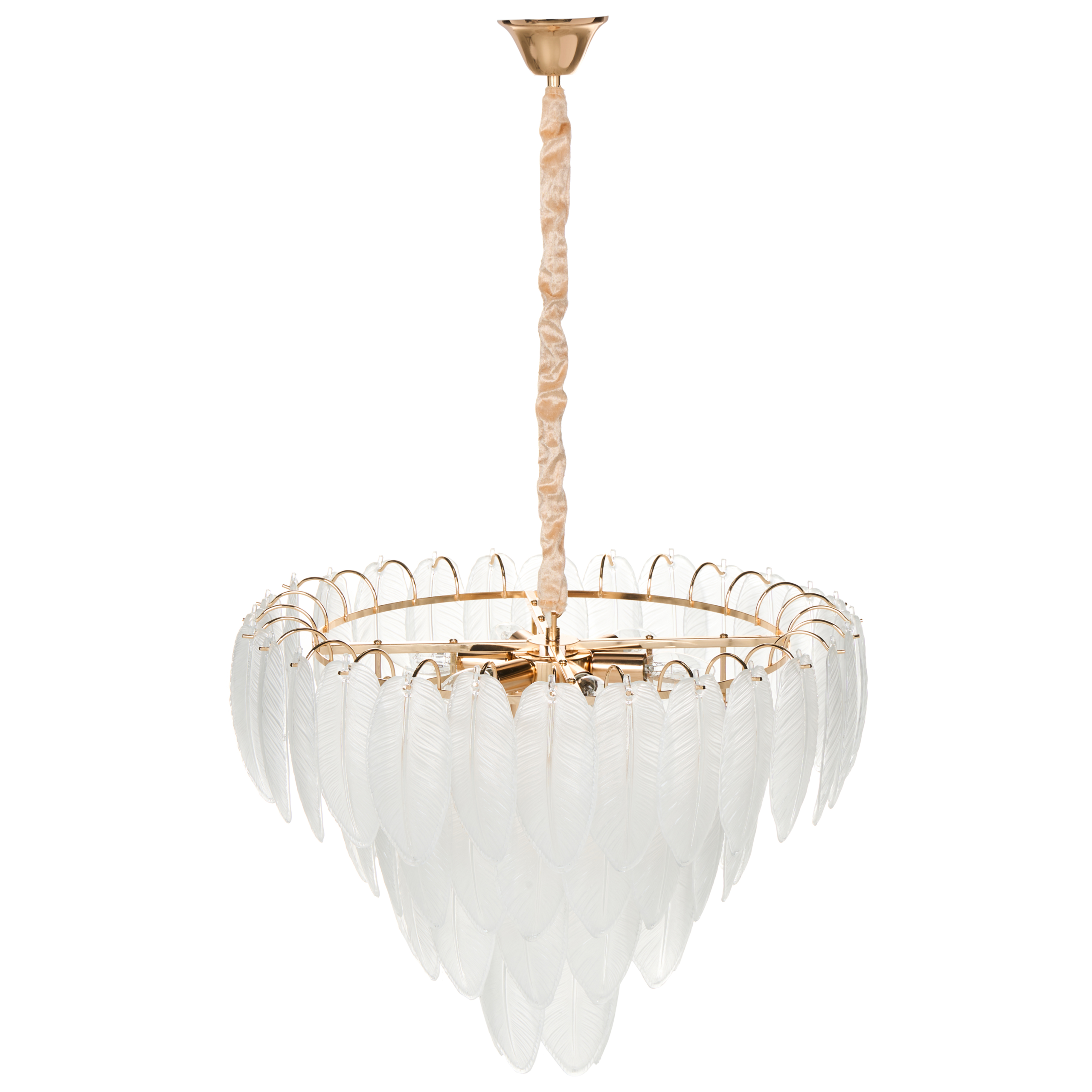 Glamour-tyylinen kruunuvalaisin lasilehdillä. Tuo tilaan glamourista luonnontuntua tällä upealla kattokruunulla, jota koristavat herkät lasilehdet. Tukevasta raudasta valmistetussa valaisimessa on lämmin messinginvärinen viimeistely, ja se yhdistää orgaanisen kauneuden hienostuneeseen tyylikkyyteen. Lehdenmuotoiset lasielementit heijastavat valoa ja luovat pehmeän, lumoavan hehkun, joka muuttaa minkä tahansa tilan. Se sopii erinomaisesti lisäämään eleganssia ruokailutilaan, olohuoneeseen tai makuuhuoneeseen.