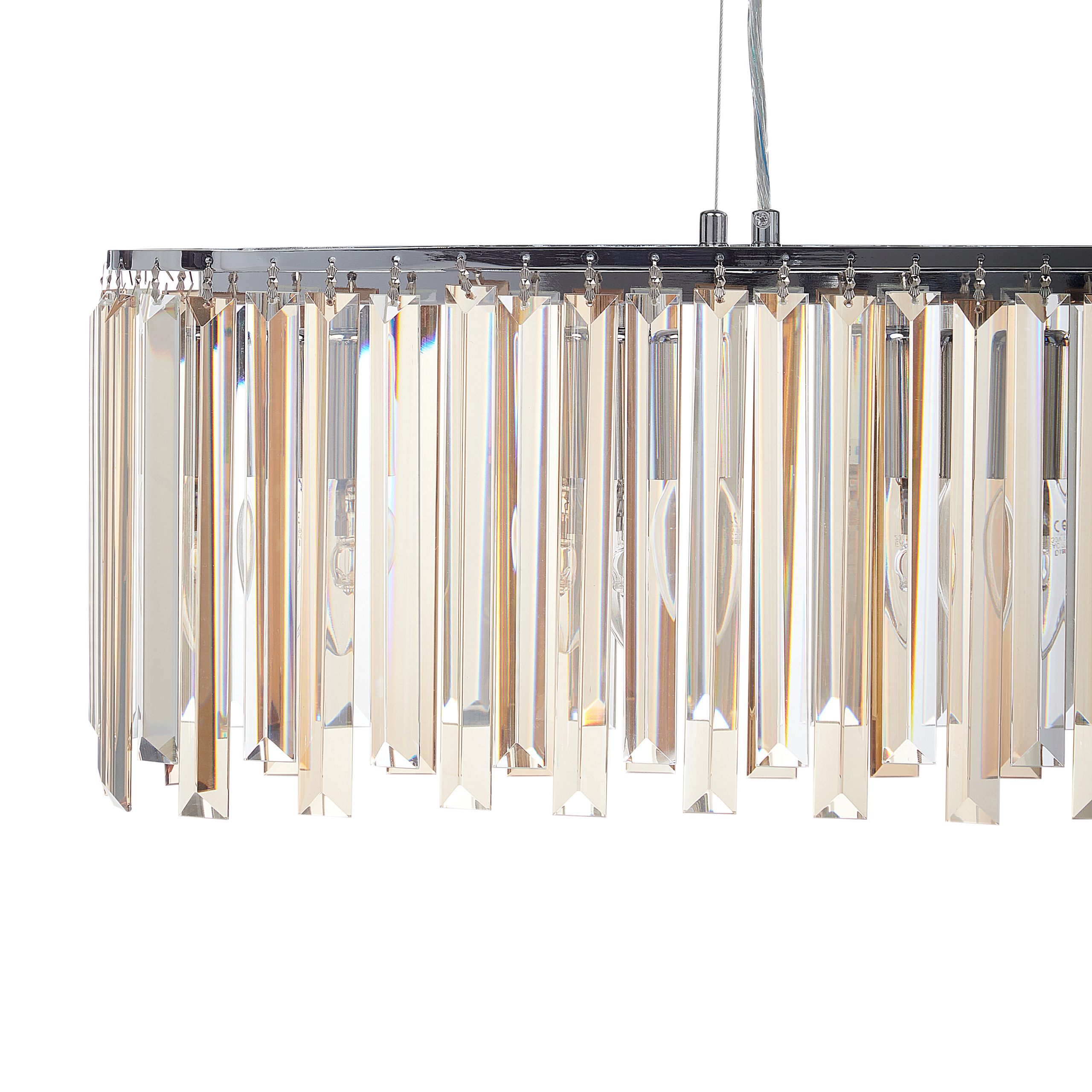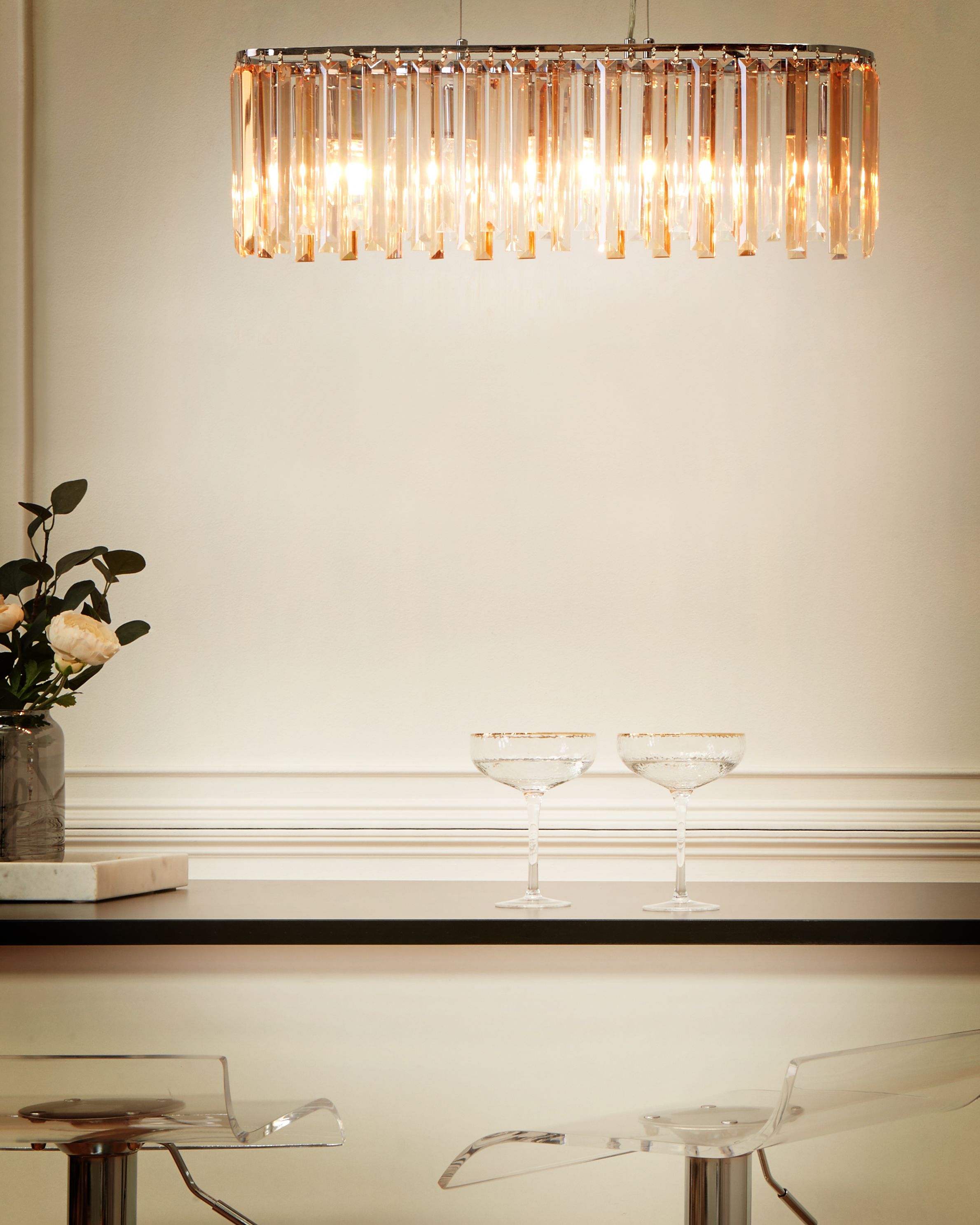 Moderni koristeellinen kruunu. Tuo ripaus modernia tyyliä olohuoneeseen tai ruokailutilaan tällä kattokruunulla. Kromatusta raudasta valmistetussa valaisimessa on tyylikkäät lasikristallit, jotka lisäävät siihen eleganssia. Säädettävä johdon pituus mahdollistaa kattokruunun sijoittamisen haluttuun korkeuteen. Hienostunut muotoilu tekee siitä näyttävän keskipisteen, joka täydentää kauniisti erilaisia sisustuksia, etenkin glamour-henkisiä.