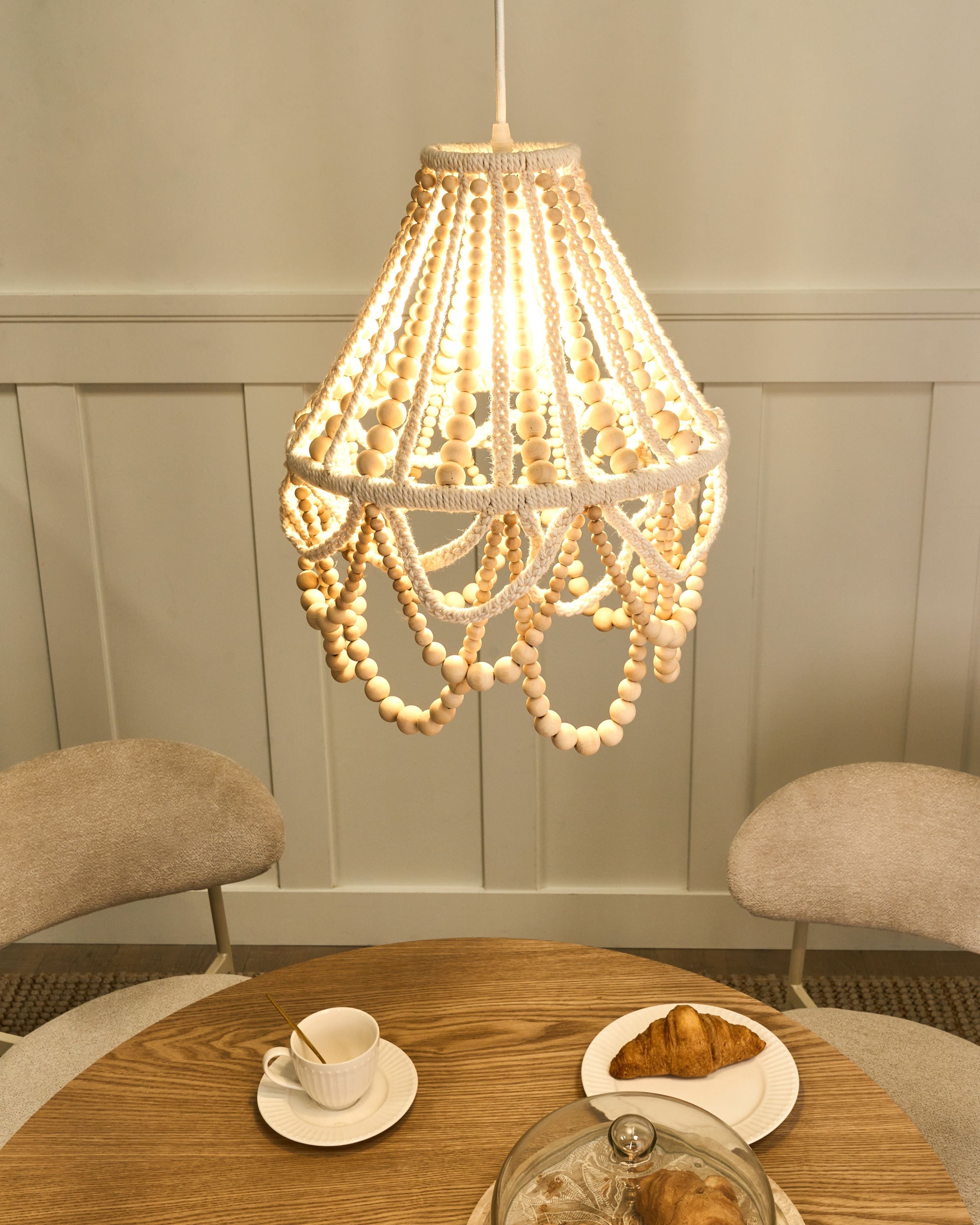 Boheemi puuhelmikattokruunu makrameella. Tämä käsin valmistettu kattokruunu yhdistää luonnolliset kumipuuhelmet hienovaraiseen kangaspunokseen, joka ammentaa inspiraatiota makrameesta. Pehmeät kaaret ja lämpimät sävyt luovat kodikkaan, boheemin tunnelman jokaiseen huoneeseen. Se sopii erinomaisesti ruokapöydän ylle tai olohuoneen rentoutumisnurkkaukseen. Kattokruunu yhdistää rustiikkisen viehätyksen ja taiteelliset yksityiskohdat. Yksityiskohtainen, käsintehty viimeistely tekee jokaisesta kattokruunusta aidosti ainutlaatuisen.