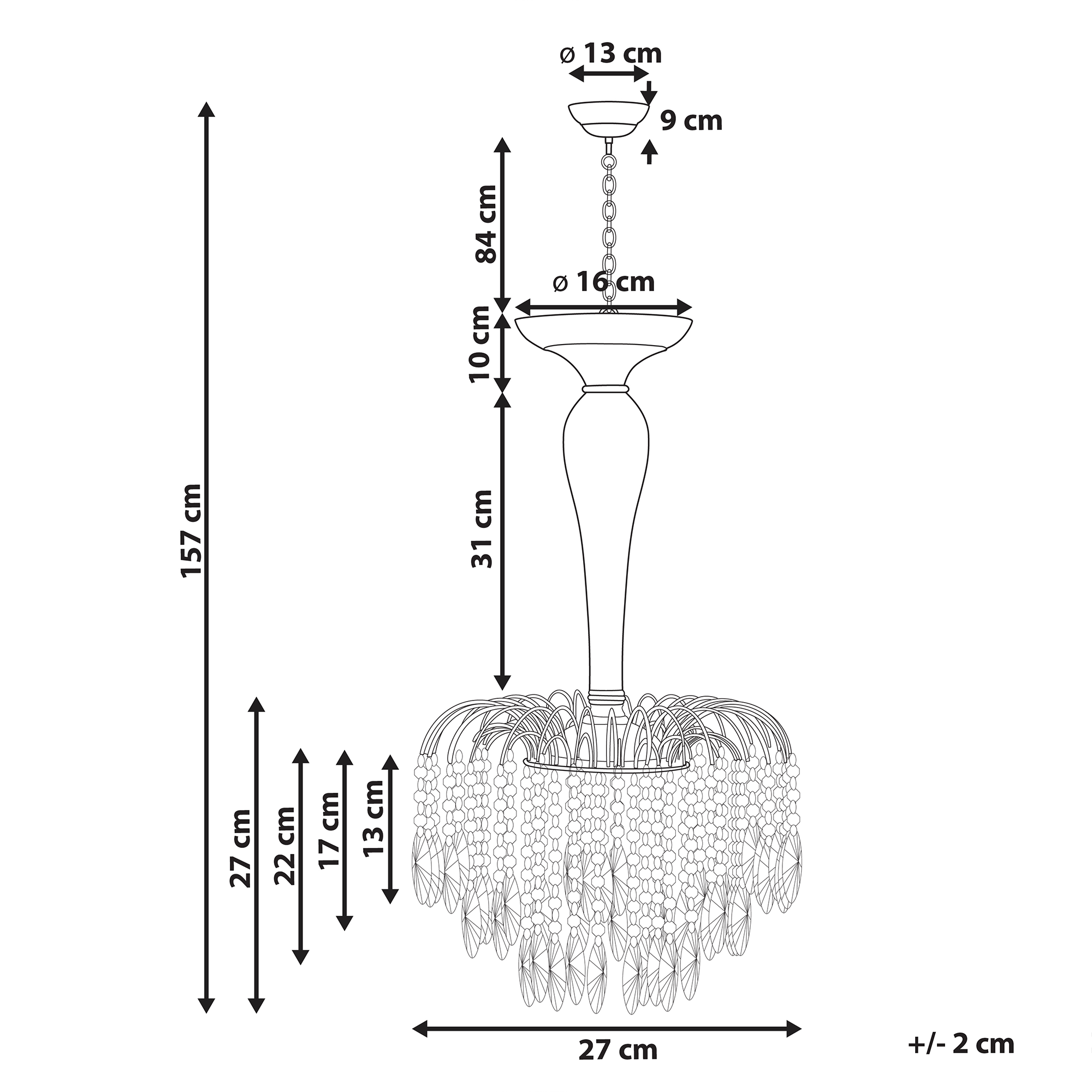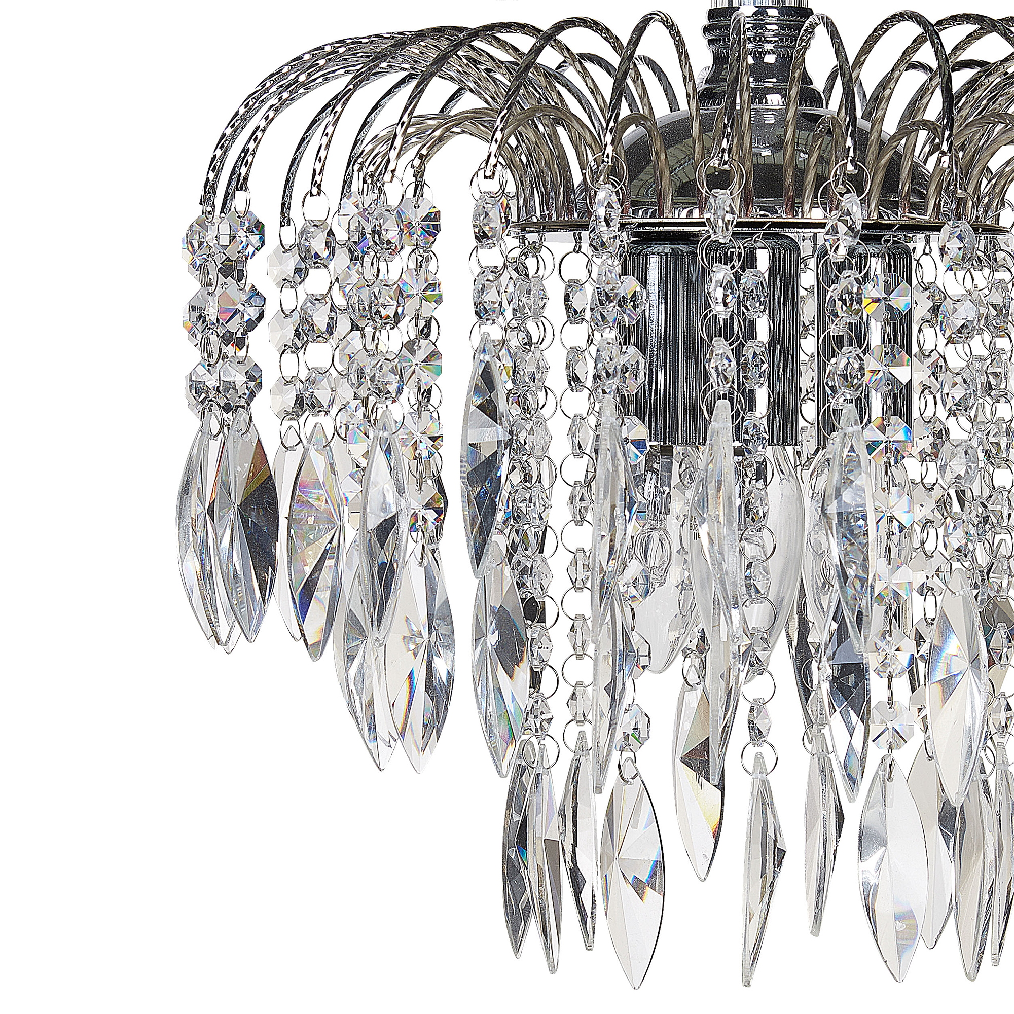 Tyylikäs kattovalaisin lasikristalleilla. Virkistä olohuoneesi ilmettä tällä ajattomalla, vintage-tyylisellä kattokruunulla. Huolella kestävästä metallista valmistettu valaisin on koristeltu lasikristalleilla, jotka vetävät puoleensa huomiota ja kohottavat tilan ilmettä. Koska tuotteessa on kolme kantaa, se valaisee minkä tahansa huoneen lämpimällä ja kutsuvalla hehkulla.