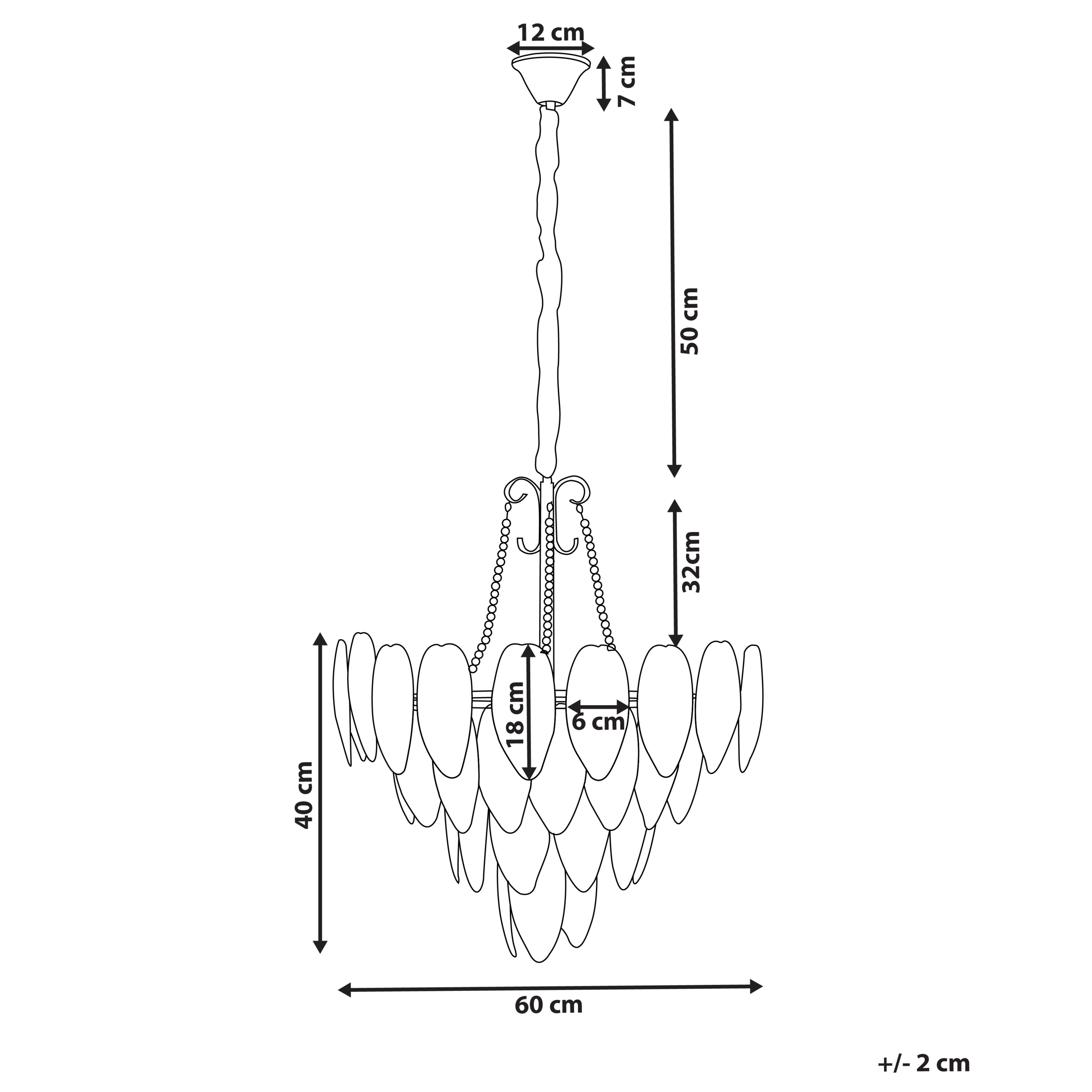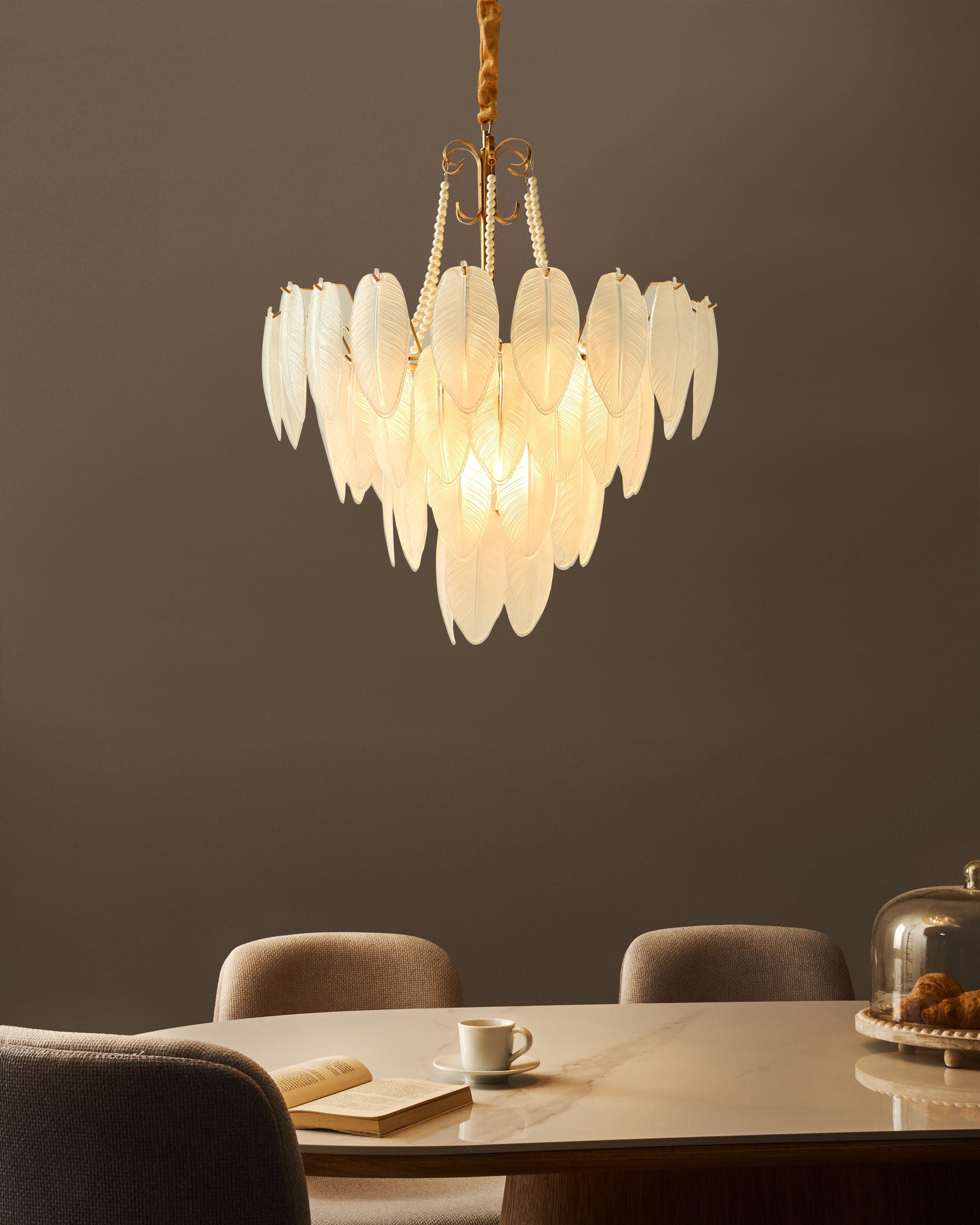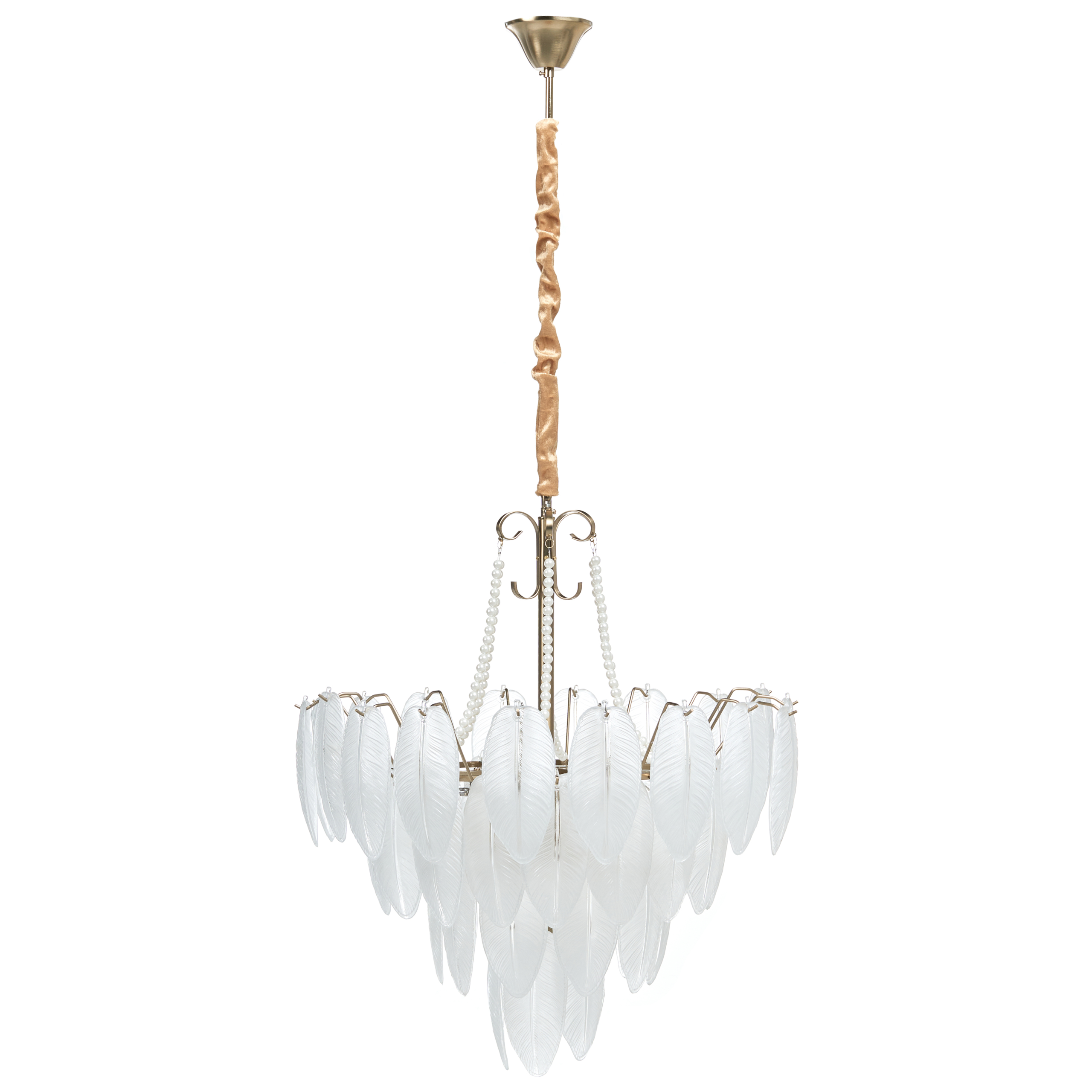 Ylellinen lasikattokruunu. Tämä elegantti kattokruunu koostuu hienovaraisista huurretuista lasilehdistä, jotka on aseteltu kaskadimaisesti kerrostettuun siluettiin. Messinginväristä rautarunkoa koristavat helminauhat, jotka lisäävät ylellistä mutta luonnollista viehätystä mihin tahansa ruokailutilaan tai olohuoneeseen. Kauniit yksityiskohdat lisäävät visuaalista tekstuuria ja luovat pehmeän, orgaanisen ilmeen. Valaisin levittää pehmeää valoa ja sopii erinomaisesti sisustuksiin, joissa arvostetaan hienostuneisuutta ja hienovaraista glamouria.