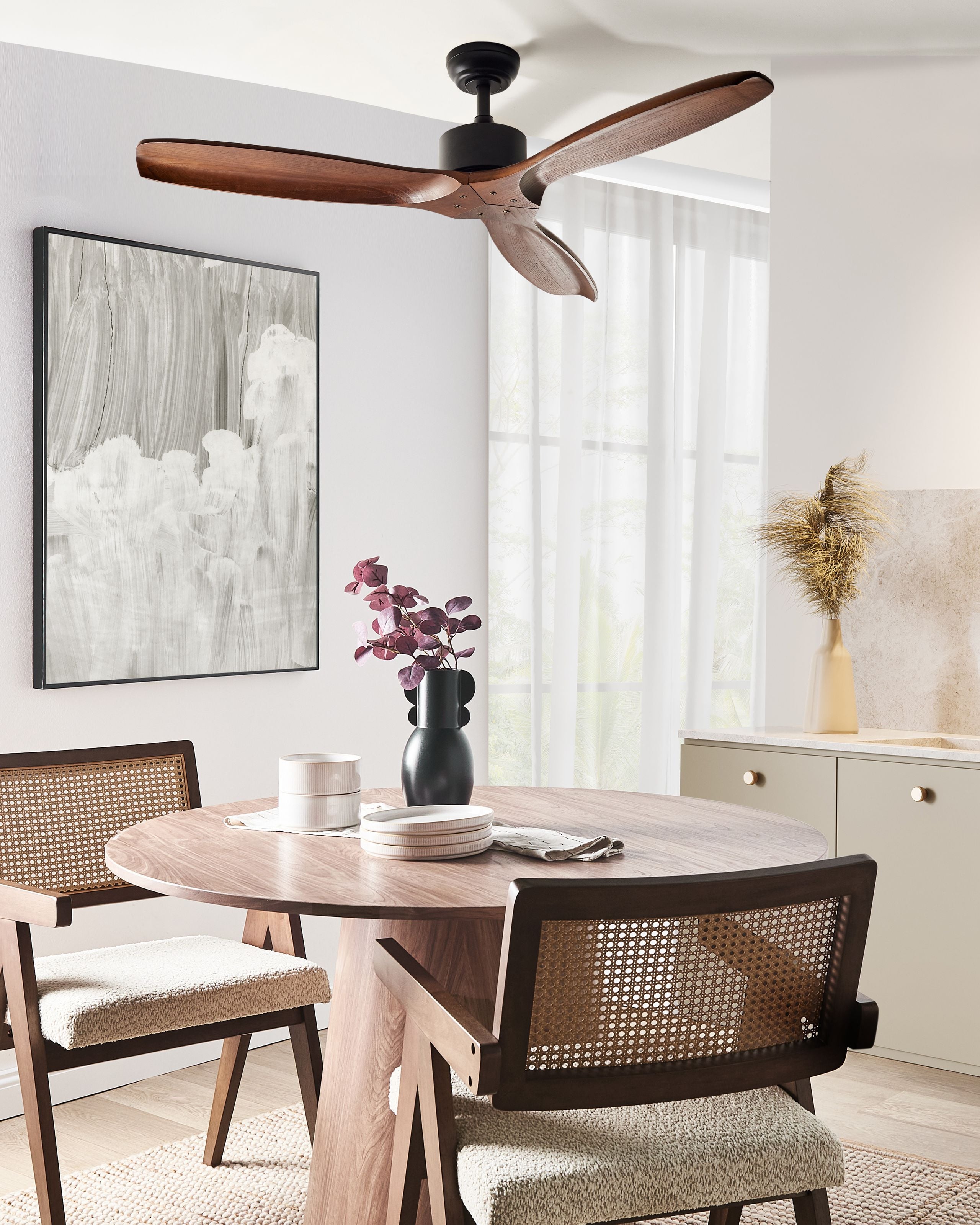 Rustiikkinen kattotuuletin kaukosäätimellä. Tämä rustiikkinen kattotuuletin on täydellinen lisä mihin tahansa makuuhuoneeseen tai olohuoneeseen. Tukevaa mustaa rautarunkoa täydentävät puiset siivekkeet, jotka tuovat tilaan luonnollista viehätystä. Vaikka tuulettimessa ei ole integroitua valaisinta, siinä on viisi nopeusasetusta, joiden avulla ilmavirtaa voi säätää mieleisekseen, sekä kaksi pyörimissuuntaa, joista toinen lämmittää ja toinen viilentää. Mukana toimitetulla kaukosäätimellä voit helposti säätää asetuksia mistä tahansa huoneesta, ja sisäänrakennettu ajastin takaa lisämukavuuden sekä vaivattoman käyttökokemuksen.