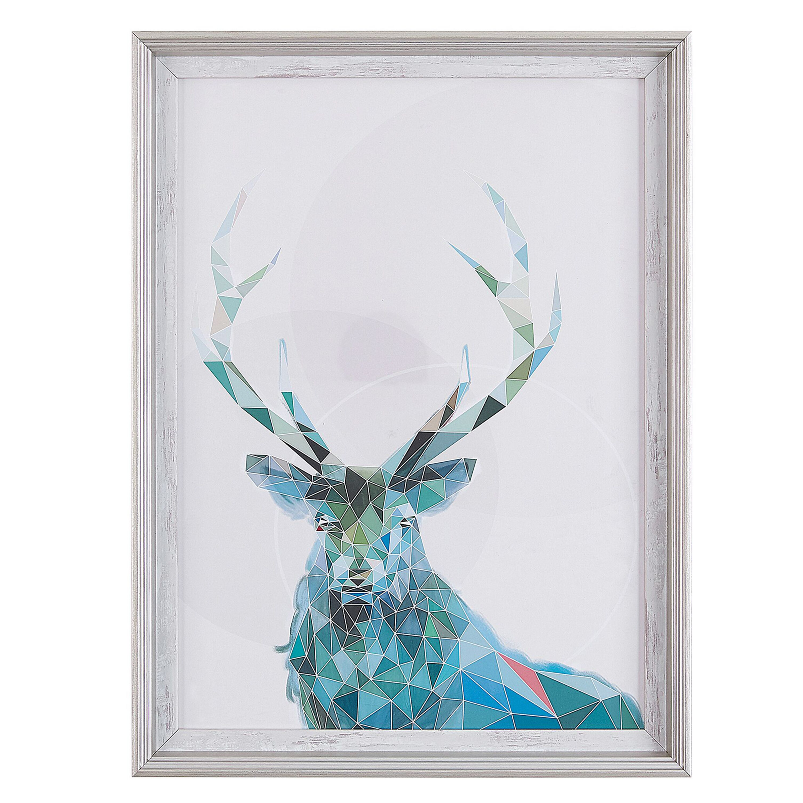 Kehystetty geometrinen peura tuloste. Tämä moderni, eläinten innoittama taideteos sopii täydellisesti minimalistiseen tai skandinaaviseen tyyliin. Se on suunniteltu pienistä erikokoisista sinisistä ja vihreistä kolmioista, jotka luovat 3D-vaikutelman. Taideteoksen takana on kaksi koukkua, joiden avulla se voidaan ripustaa nopeasti ja helposti.