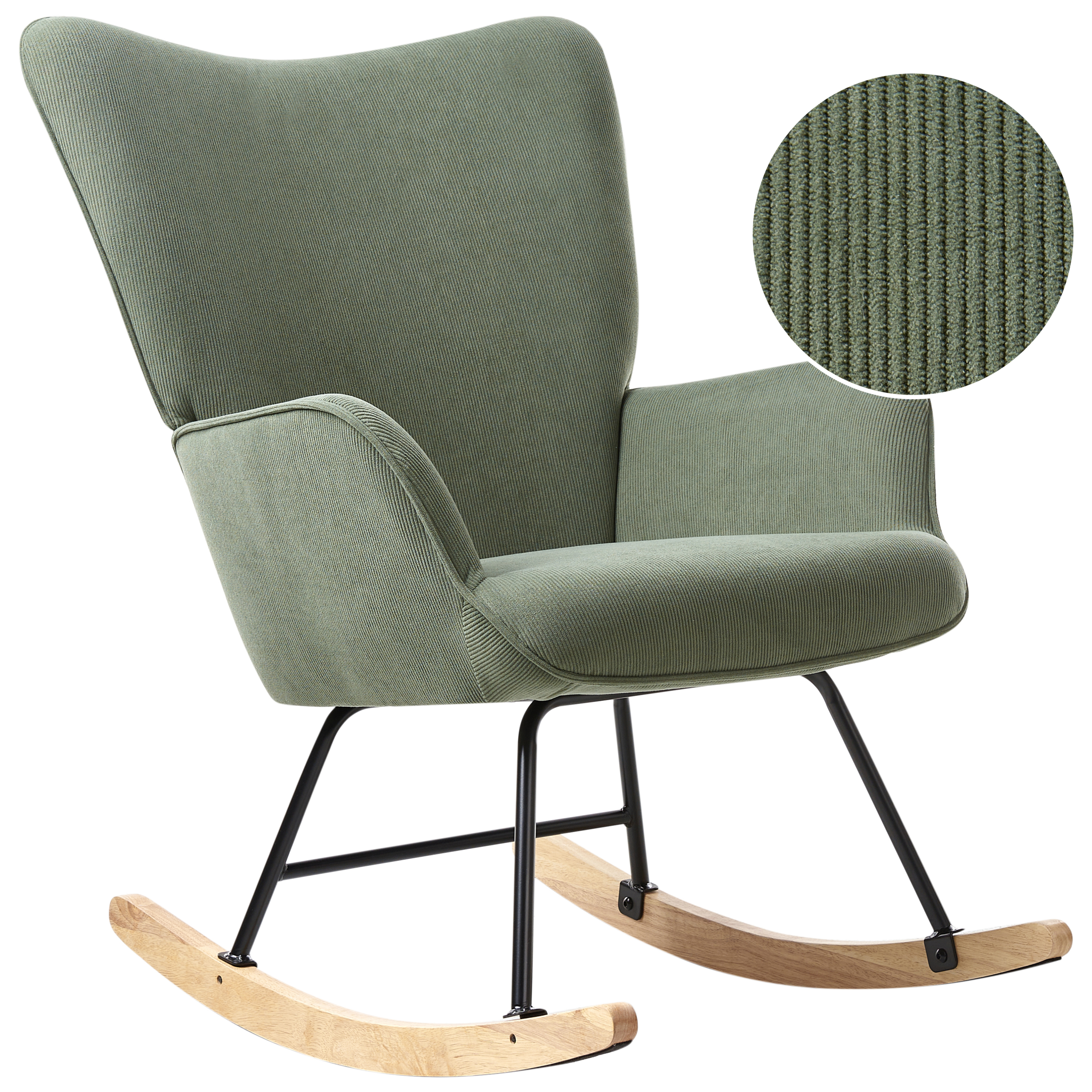 Retrotyylinen keinutuoli leveällä selkänojalla. Tämä tyylikäs keinuva nojatuoli tarjoaa loistavan rentoutumispaikan, sulautuen samalla useisiin erilaisiin sisustuksiin. Pehmeän tummanvihreän vakosamettiverhoilun ansiosta se on kulutusta kestävä, miellyttävän tuntuinen ja pitkäikäinen. Klassisen mustia, raudasta valmistettuja välijalkoja täydentävät vaaleat kumipuujalat, jotka varmistavat vakauden ja mukavan keinumisen. Keinutuolissa on leveä selkänoja sekä tukea antavat käsinojat, minkä ansiosta se on sekä viihtyisä että tukeva istua. Elegantti sävy sopii vaivattomasti mihin tahansa tilaan, lastenhuoneesta olohuoneeseen.