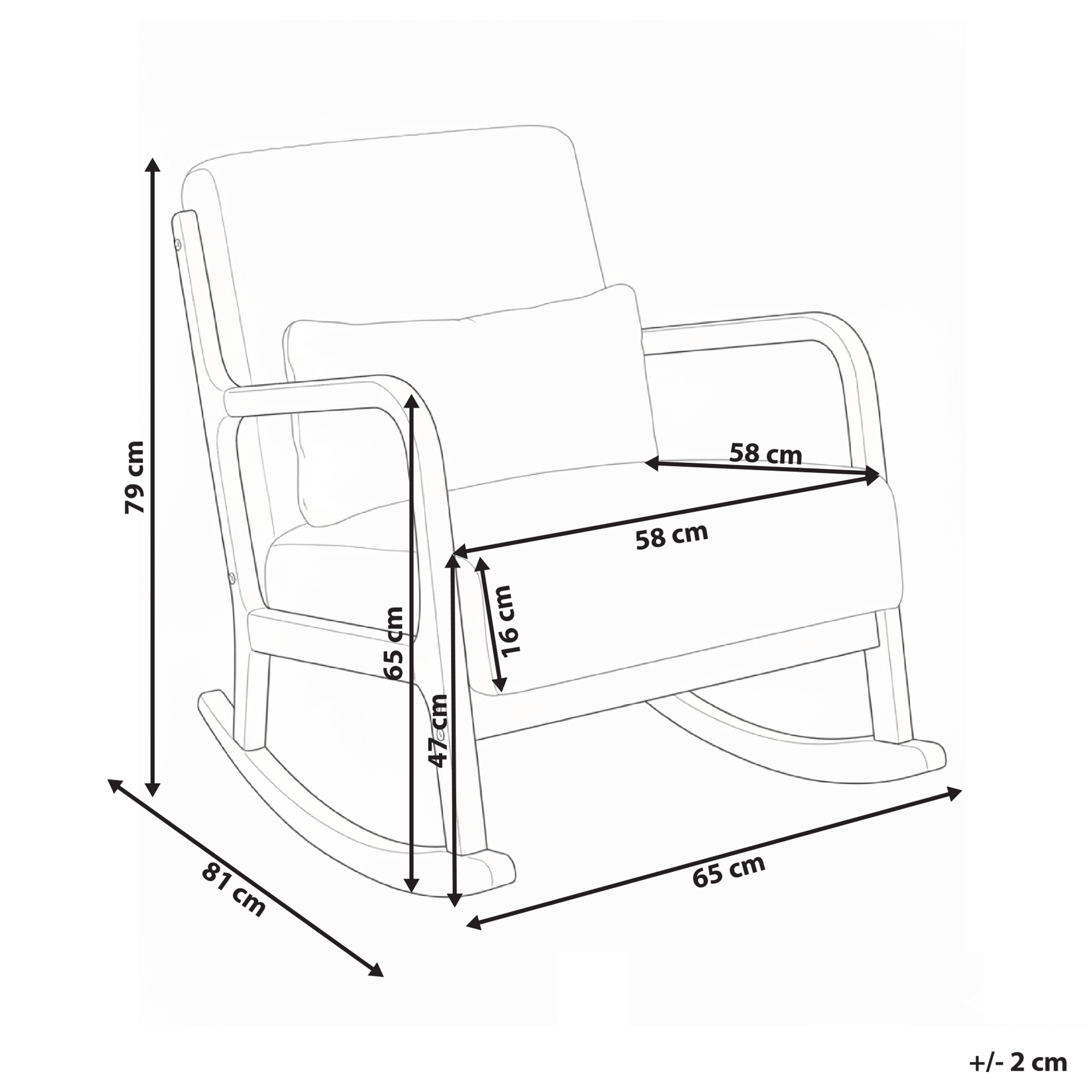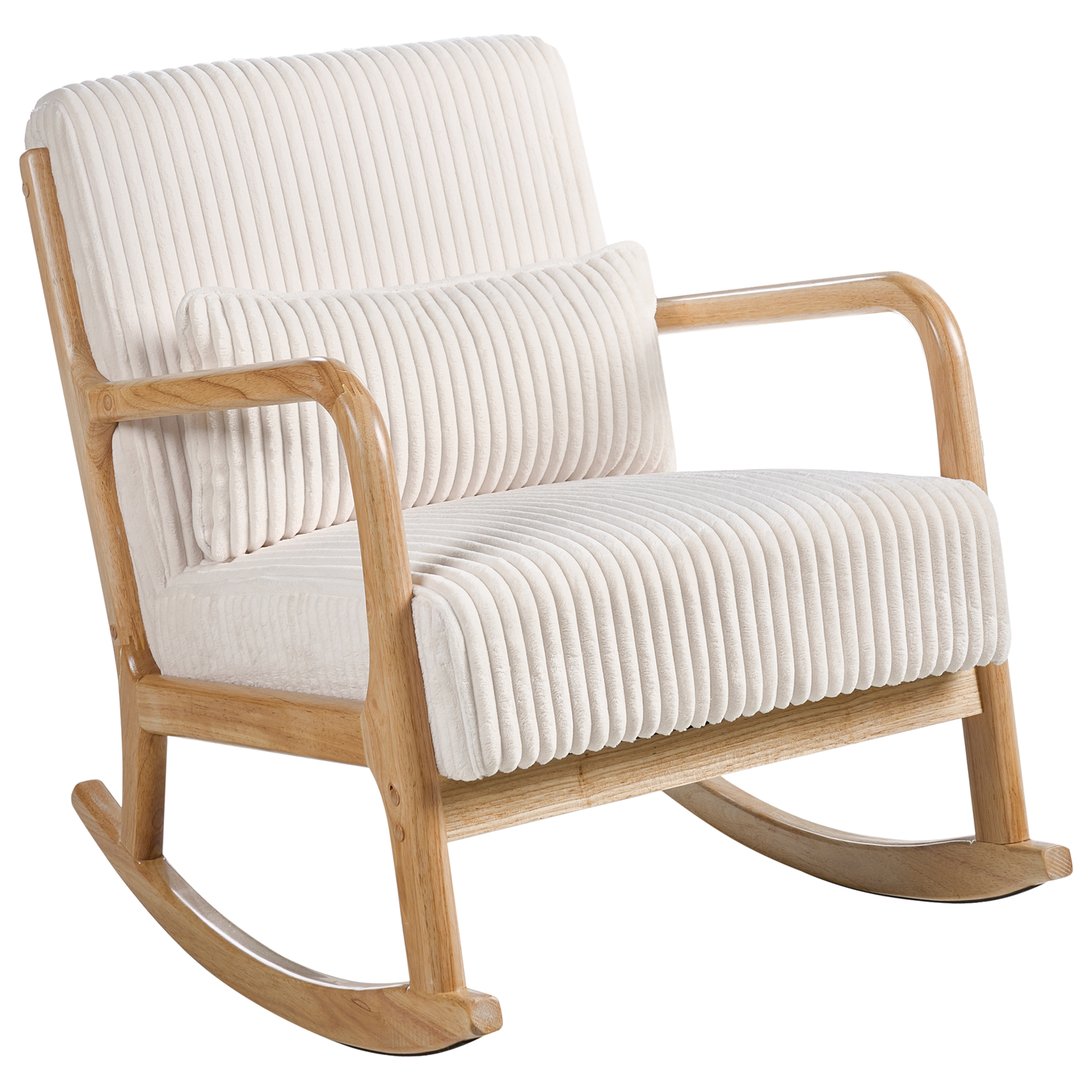 Vintage-tyylinen keinuva nojatuoli koristetyynyllä. Tämä keinutuoli yhdistää puhtaan skandinaavisen muotoilun hienovaraiseen vintage-tunnelmaan, mikä tekee siitä tyylikkään lisän jokaiseen moderniin kotiin. Pehmeällä valkoisella vakosametilla verhoiltu keinutuoli tuntuu raikkaalta ja monipuoliselta, mutta säilyttää kodikkaan ilmapiirin. Matala, kumipuusta valmistettu runko ja pehmeästi pyöristetyt käsinojat lisäävät lämpöä ja tasapainoa, minkä ansiosta se on elegantti ja kutsuva.