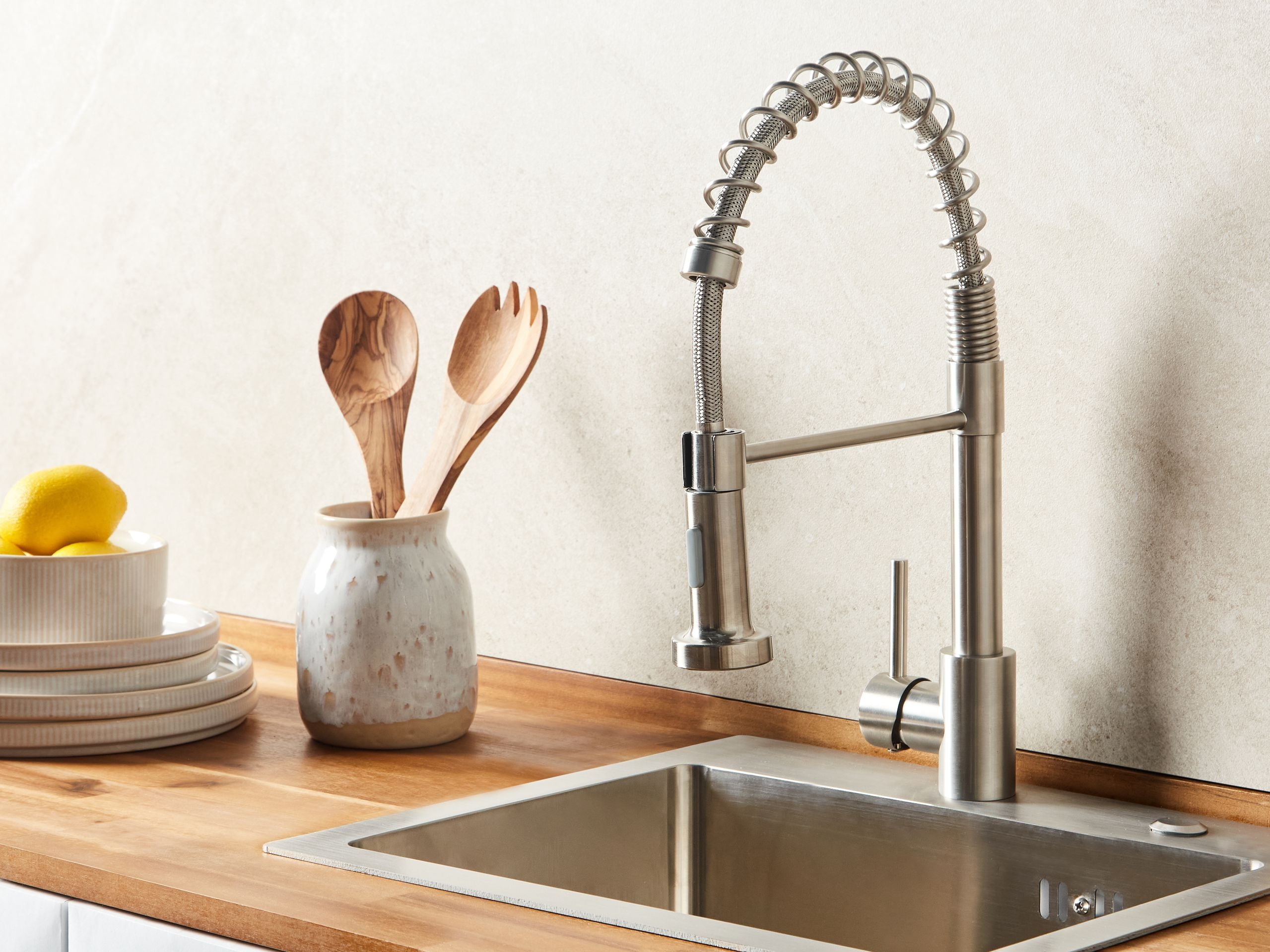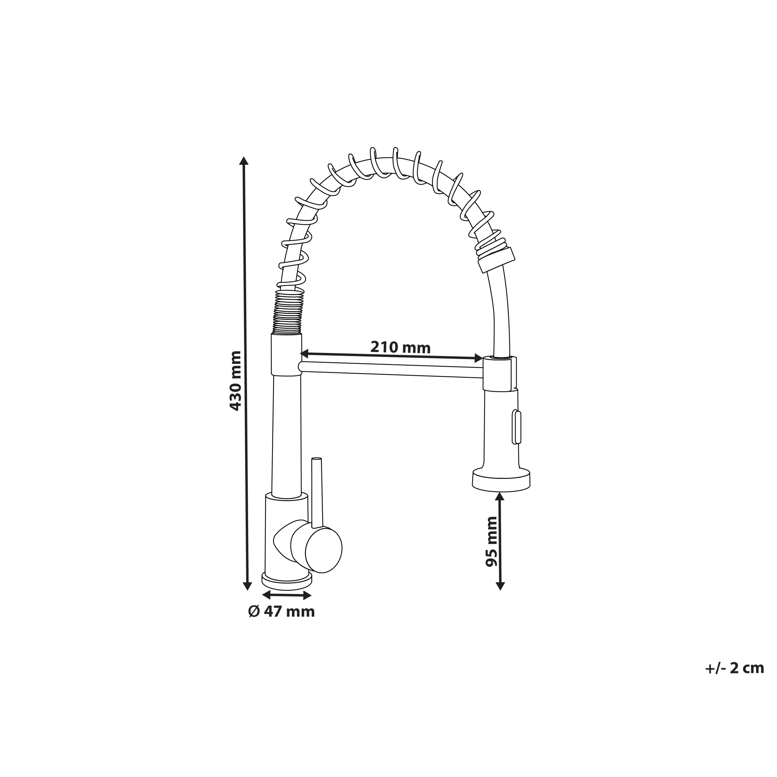 Moderni keittiön hana joustavalla juoksuputkella. Tämä moderni keittiöhana tuo pesualtaalle käytännöllisyyttä ja ripauksen rohkeaa, industriaalista ilmettä. Harjatulla hopeanvärisellä pinnalla viimeistelty, ruostumattomasta teräksestä valmistettu hana on korroosionkestävä, helppo puhdistaa ja kestää päivittäistä käyttöä, joten se sopii sekä sisä- että ulkokäyttöön. Joustava juoksuputki ulosvedettävällä suuttimella helpottaa huuhtelua ja siivousta, ja yhden vivun avulla veden lämpötilaa ja voimakkuutta on helppo säädellä. Siinä on kaksi suihkutoimintoa – tavallinen vesisuihku ja leveämpi suihku – jotka vaihtuvat näppärästi suuttimeen integroidulla painikkeella. Ensimmäinen tuottaa tasaisen, roiskumattoman virtauksen, joka sopii kattiloiden täyttämiseen ja päivittäiseen tiskaamiseen. Toinen toiminto tarjoaa leveämmän ja tehokkaamman virtauksen astioiden huuhteluun tai isompien pintojen puhdistukseen.