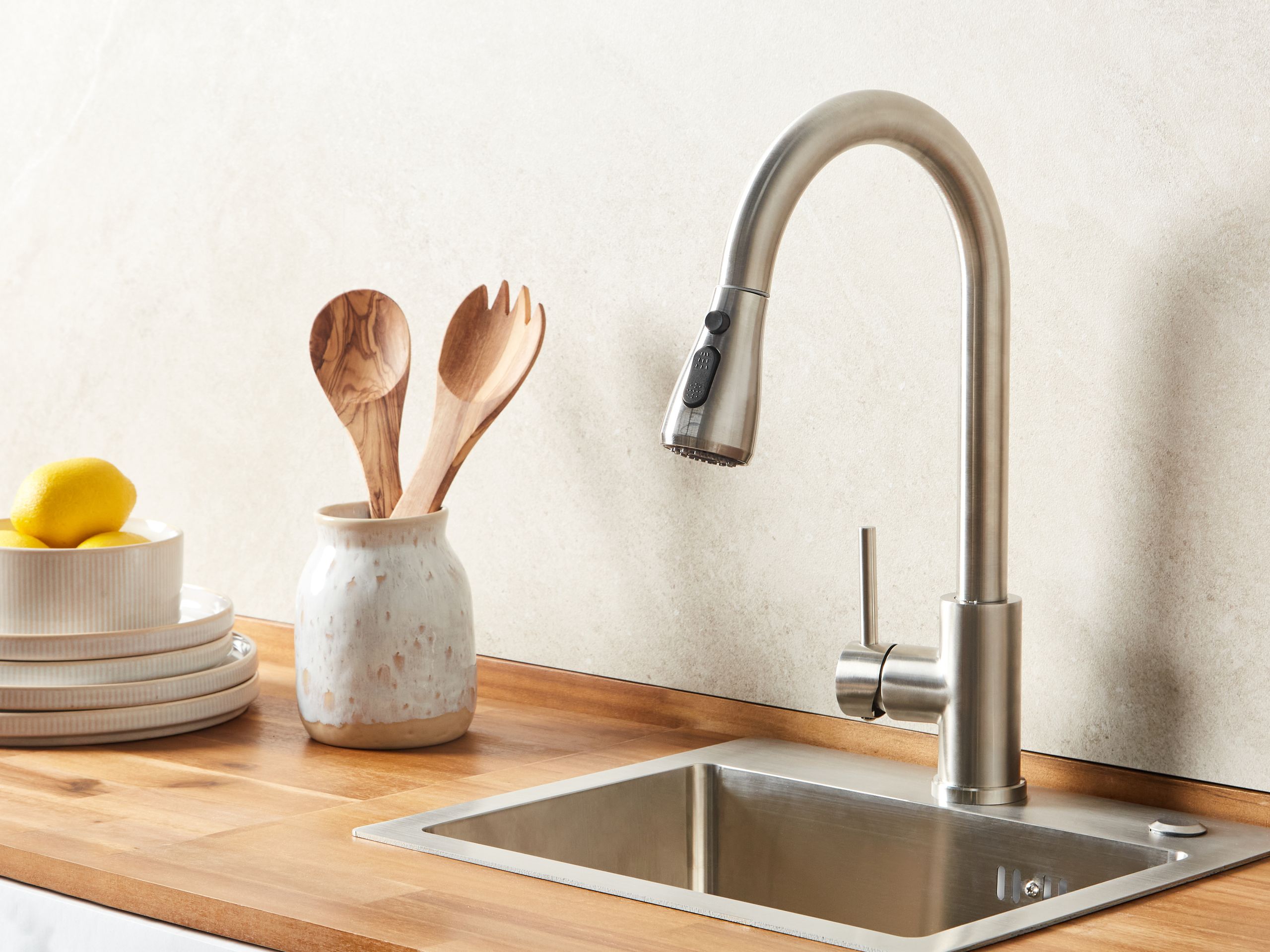 Moderni keittiön hana ulosvedettävällä juoksuputkella. Tämä virtaviivainen keittiöhana yhdistää minimalistisen muotoilun ja toiminnallisuuden, joten se sopii täydellisesti sekä moderniin keittiöön että ulkotiloihin. Kestävästä ruostumattomasta teräksestä valmistetussa hanassa on harjattu hopeanvärinen viimeistely, ja se kestää erinomaisesti ruostetta, tahroja ja kulumista. Tyylikäs, korkeakaarinen nokka alas vedettävällä suihkupäällä helpottaa huuhtelua, täyttöä ja puhdistusta. Ergonominen vipu mahdollistaa veden virtauksen ja lämpötilan vaivattoman säädön. Siinä on kaksi suihkutoimintoa – klassinen ja voimakas – joita voi vaihtaa helposti painiketta painamalla. Pehmeä virtaus sopii päivittäiseen käyttöön, kun taas leveämpi, tehokas suihku on ihanteellinen astioiden huuhteluun ja isompien pintojen puhdistamiseen. Hana yhdistää tyylin ja käytännöllisyyden ja tekee arjesta sujuvampaa – olitpa sitten kokkaamassa tai siivoamassa.