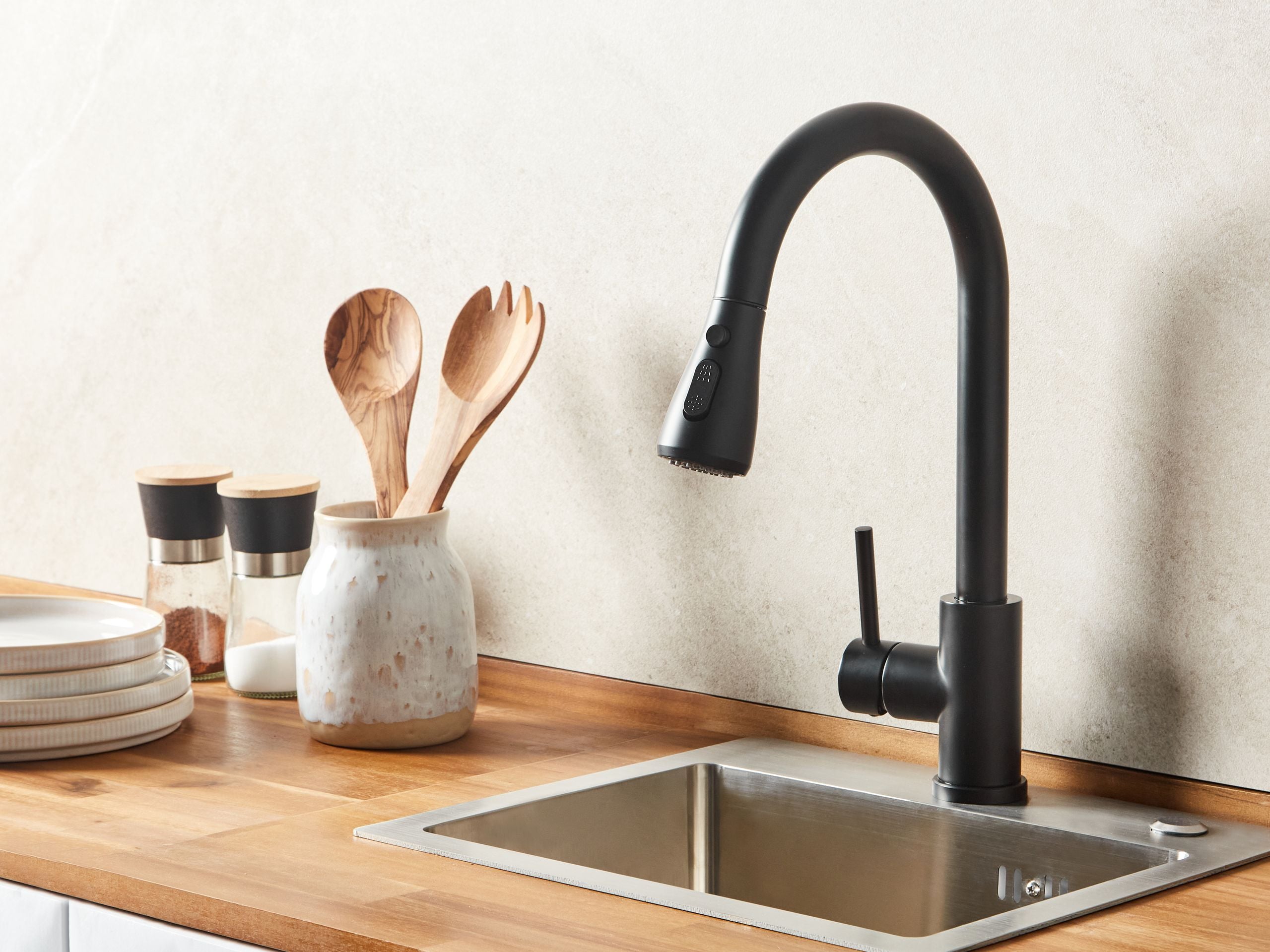 Moderni keittiön hana ulosvedettävällä juoksuputkella. Tämä virtaviivainen keittiöhana yhdistää minimalistisen muotoilun ja toiminnallisuuden, joten se sopii täydellisesti sekä moderniin keittiöön että ulkotiloihin. Kestävästä ruostumattomasta teräksestä valmistetussa hanassa on sileä mattaviimeistely, ja se kestää erinomaisesti ruostetta, tahroja ja kulumista. Tyylikäs, korkeakaarinen nokka alas vedettävällä suihkupäällä helpottaa huuhtelua, täyttöä ja puhdistusta. Ergonominen vipu mahdollistaa veden virtauksen ja lämpötilan vaivattoman säädön. Siinä on kaksi suihkutoimintoa – klassinen ja voimakas – joita voi vaihtaa helposti painiketta painamalla. Pehmeä virtaus sopii päivittäiseen käyttöön, kun taas leveämpi, tehokas suihku on ihanteellinen astioiden huuhteluun ja isompien pintojen puhdistamiseen. Hana yhdistää tyylin ja käytännöllisyyden ja tekee arjesta sujuvampaa – olitpa sitten kokkaamassa tai siivoamassa.