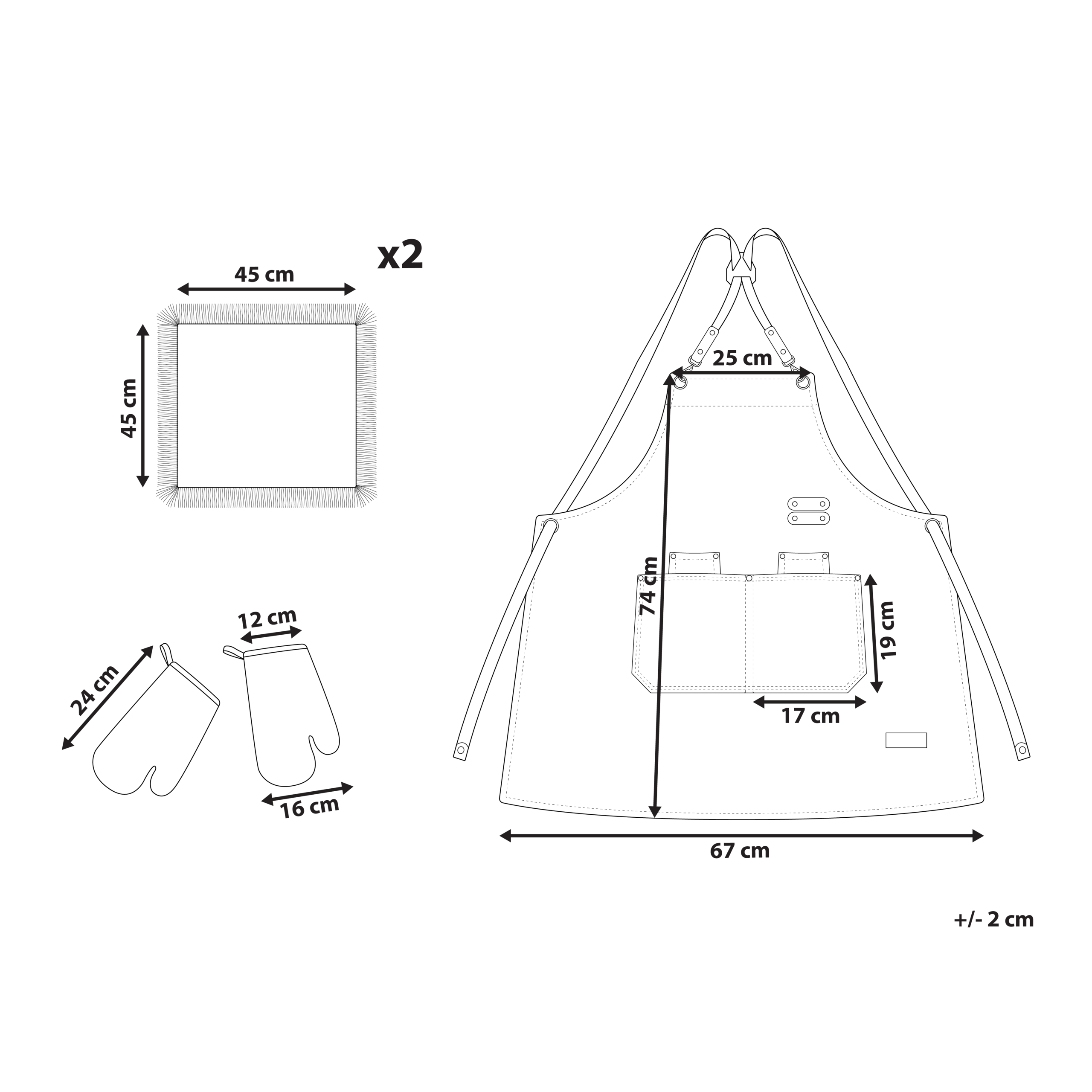 Hintaan sisältyy: 1 x Esiliina, 2 x Patakinnas, 2 x Keittiöpyyhe