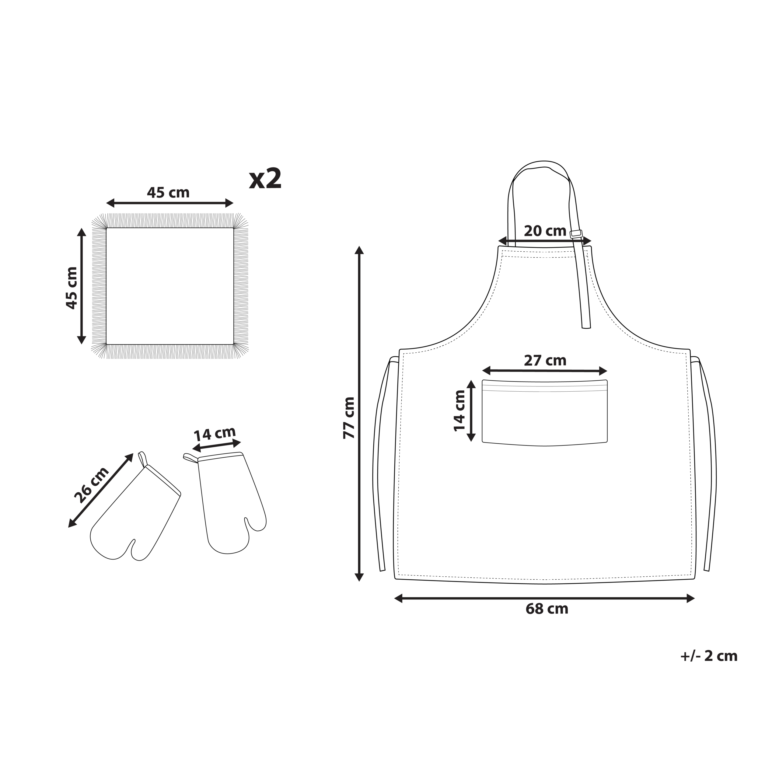 Hintaan sisältyy: 1 x Esiliina, 2 x Patakinnas, 2 x Keittiöpyyhe
