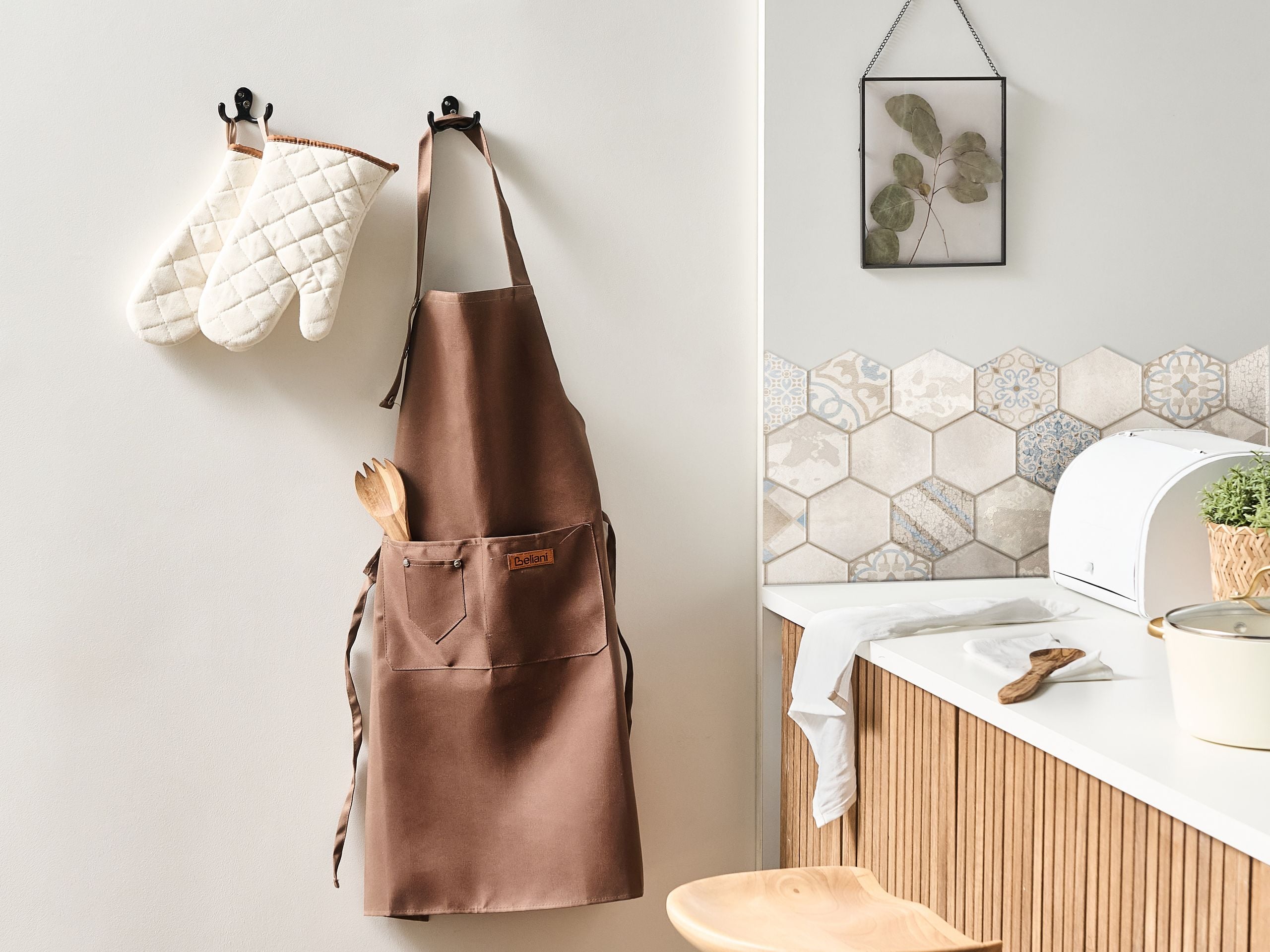 Tyylikäs tekstiilisetti essulla, patakintailla ja keittiöpyyhkeillä keittiöön. Kohota keittiötä ja rutiinejasi tällä kauniilla keittiötekstiilisetillä, joka täydentää mitä tahansa sisustusta. Settiin kuuluu kestävä esiliina, jossa on säädettävä kaulalenkki täydellistä mukavuutta ja suojaa varten, kaksi patakinnasta, jotka suojaavat kädet kuumilta pinnoilta ja ovat helppoja ripustaa silmukoiden ansiosta, sekä kaksi imukykyistä keittiöpyyhettä, jotka sopivat päivittäiseen käyttöön. Tekstiilisetti on valmistettu laadukkaista materiaaleista – esiliina ja patakintaat polyesteristä, keittiöpyyhkeet puuvilla-pellavasekoitteesta. Se yhdistää vaivattomasti toiminnallisuuden ja modernin estetiikan.