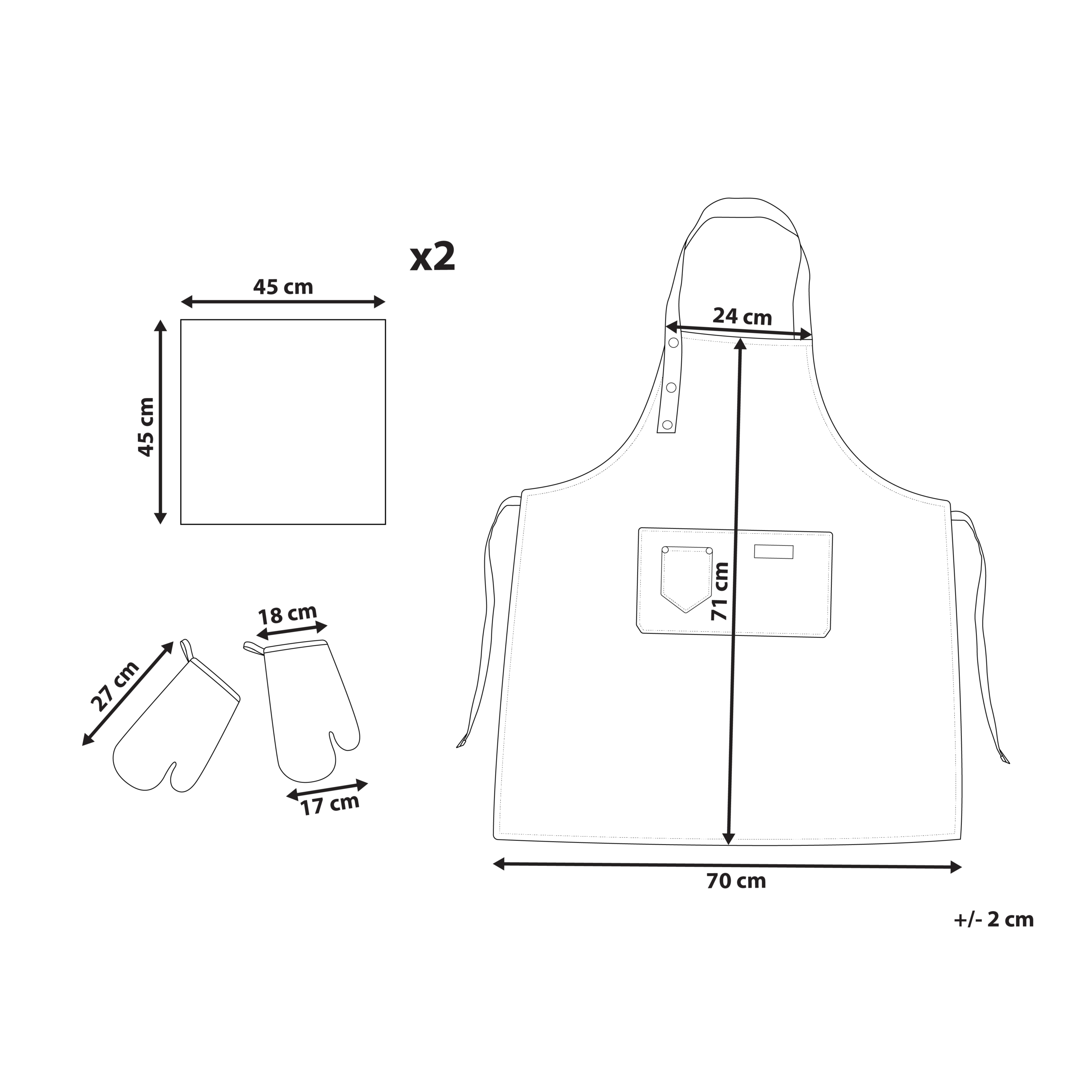 Hintaan sisältyy: 1 x Esiliina, 2 x Patakinnas, 2 x Keittiöpyyhe