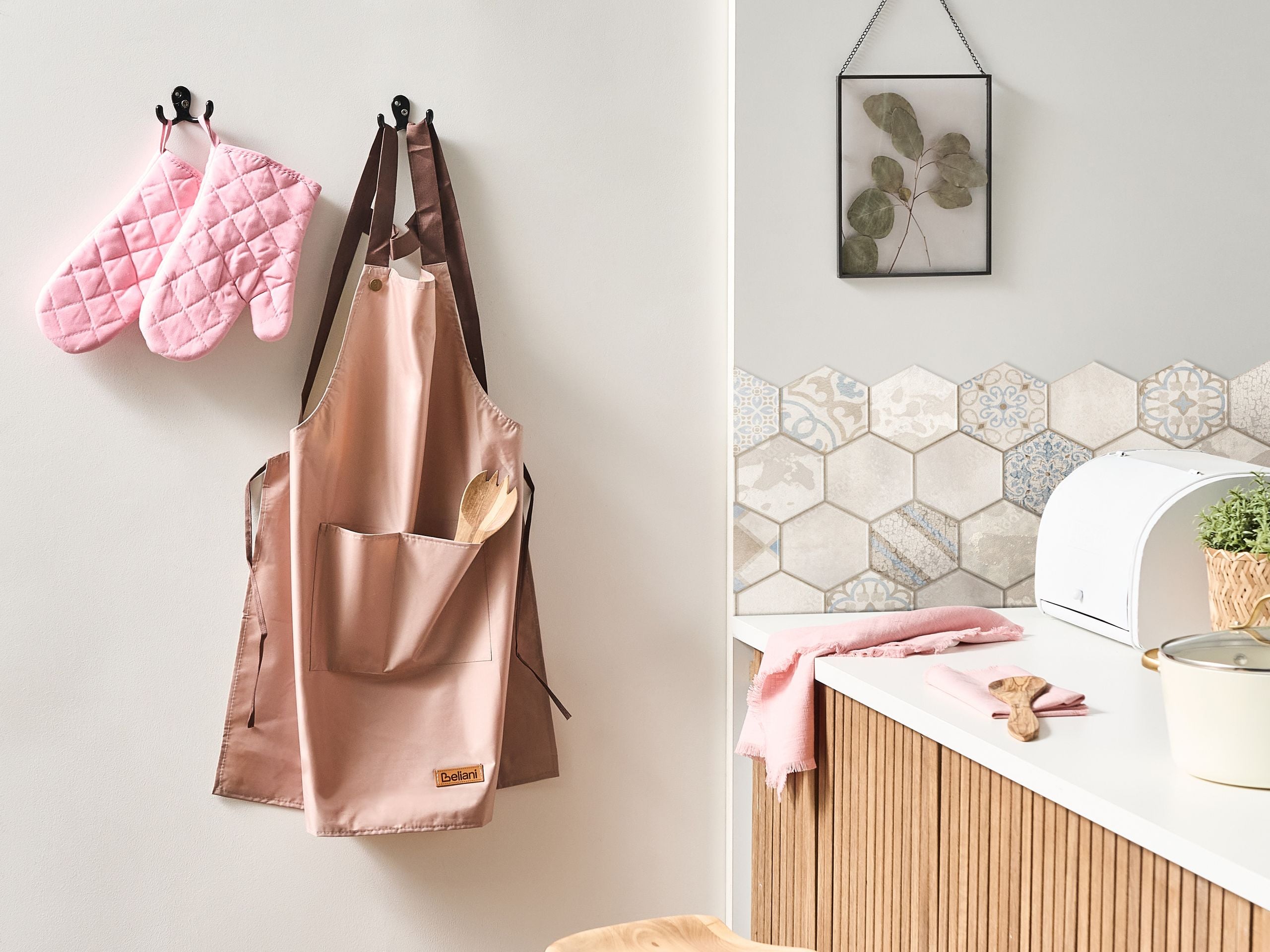 Tekstiilisetti essulla, keittiöpyyhkeillä ja patakintailla keittiöön. Tuo keittiöön harmoniaa ja käytännöllisyyttä tällä tyylikkäällä ja suloisen värisellä keittiötekstiilisetillä. Setti sisältää kevyen esiliinan sotkuttomaan ruoanlaittoon, kaksi pehmustettua patakinnasta turvalliseen leivontaan sekä kaksi monipuolista ja imukykyistä keittiöpyyhettä. Kintaiden päihin ommellut kätevät silmukat mahdollistavat helpon ripustamisen. Esiliina ja patakintaat ovat polyesterikangasta, keittiöpyyhkeet puolestaan puuvilla-pellavasekoitetta. Tekstiilit on tehty kestämään, ja ne parantavat sekä ruoanlaittomukavuutta että keittiön sisustusta.