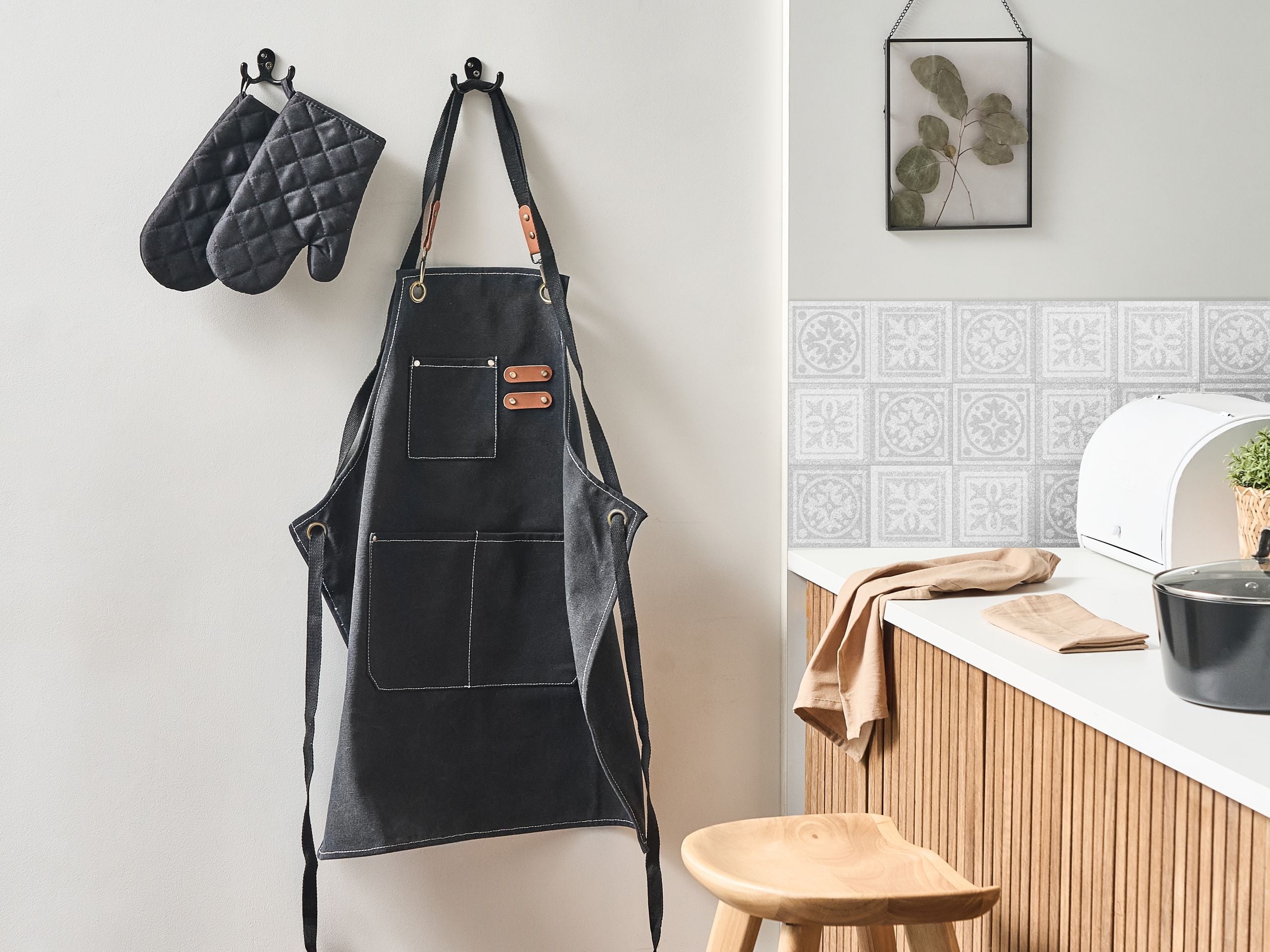Esiliinasetti patakintailla ja keittiöpyyhkeillä keittiöön. Tämä tyylikäs keittiötekstiilisetti yhdistää käytännöllisyyden ja eleganssin. Settiin kuuluu perinteinen esiliina, joka pitää vaatteet tahrattomina, kaksi kuumuutta kestävää patakinnasta turvalliseen ruoanlaittoon sekä kaksi pehmeää, imukykyistä keittiöpyyhettä, jotka sopivat erinomaisesti astioiden kuivaamiseen ja pintojen pyyhkimiseen. Kussakin kintaassa on silmukka helppoa ja siistiä ripustamista varten. Esiliina ja patakintaat on valmistettu polyesterikankaasta, keittiöpyyhkeet puuvilla-pellavasekoitteesta. Tekstiilit on suunniteltu laatua ja mukavuutta ajatellen, ja ne ovat täydellinen valinta jokaiseen keittiöön.