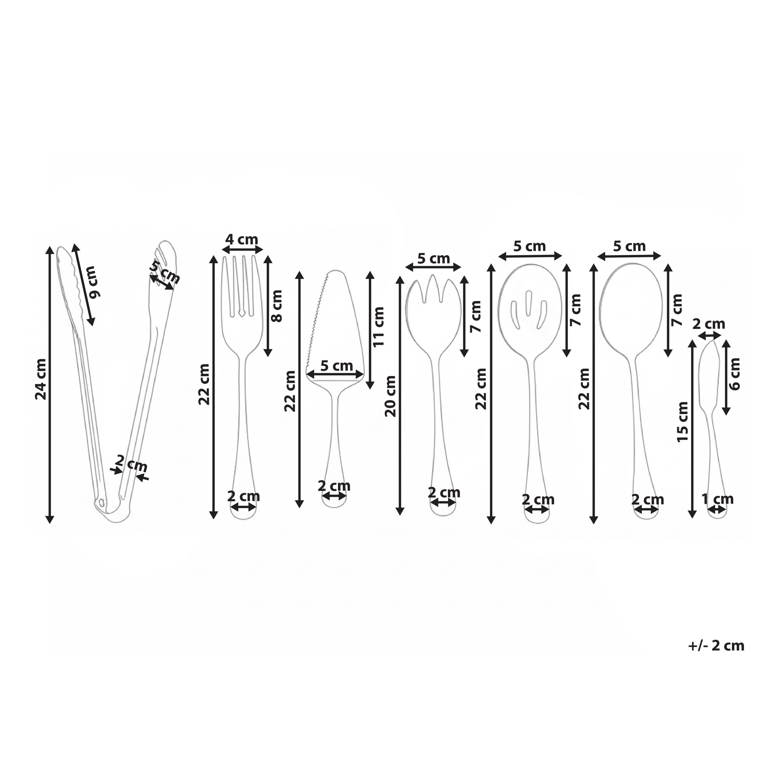 Hintaan sisältyy: 1 x Voiveitsi, 1 x Salaattihaarukka, 1 x Kalahaarukka, 1 x Kakkulapio, 1 x Reikälusikka, 1 x Tarjoilulusikka, 1 x Keittiöpihdit