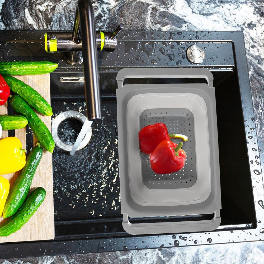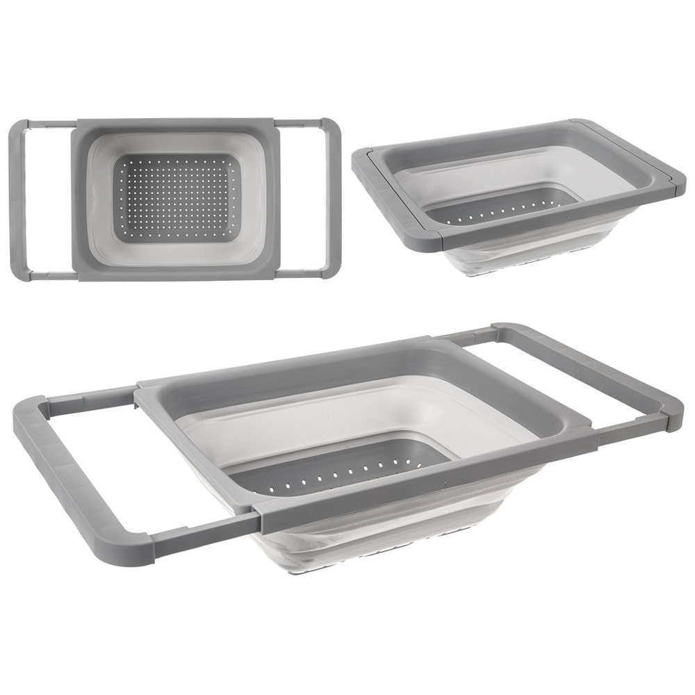 KÄYTÄNNÖLLINEN - Yleiskäyttöinen siivilä, jossa on jatkettavat kahvat ja kokoontaitettava muotoilu. Hyödyllinen hedelmien ja vihannesten pesuun sekä pastan ja nuudelien siivilöintiin. Avattuina siivilä on mitoiltaan 55 x 26,5 x 12 cm. Taitettuna siivilä on mitoiltaan 39 x 26,5 x 4 cm.
