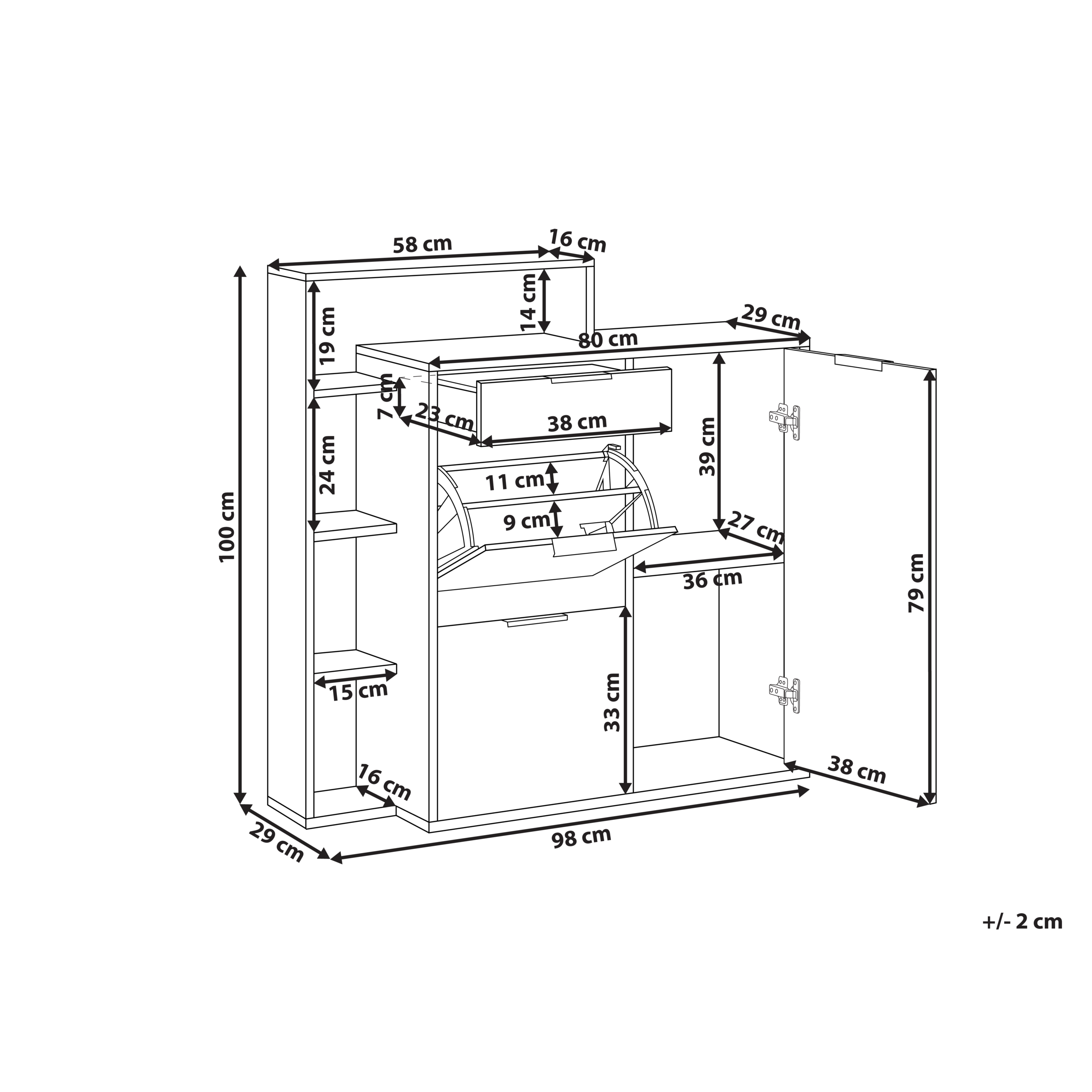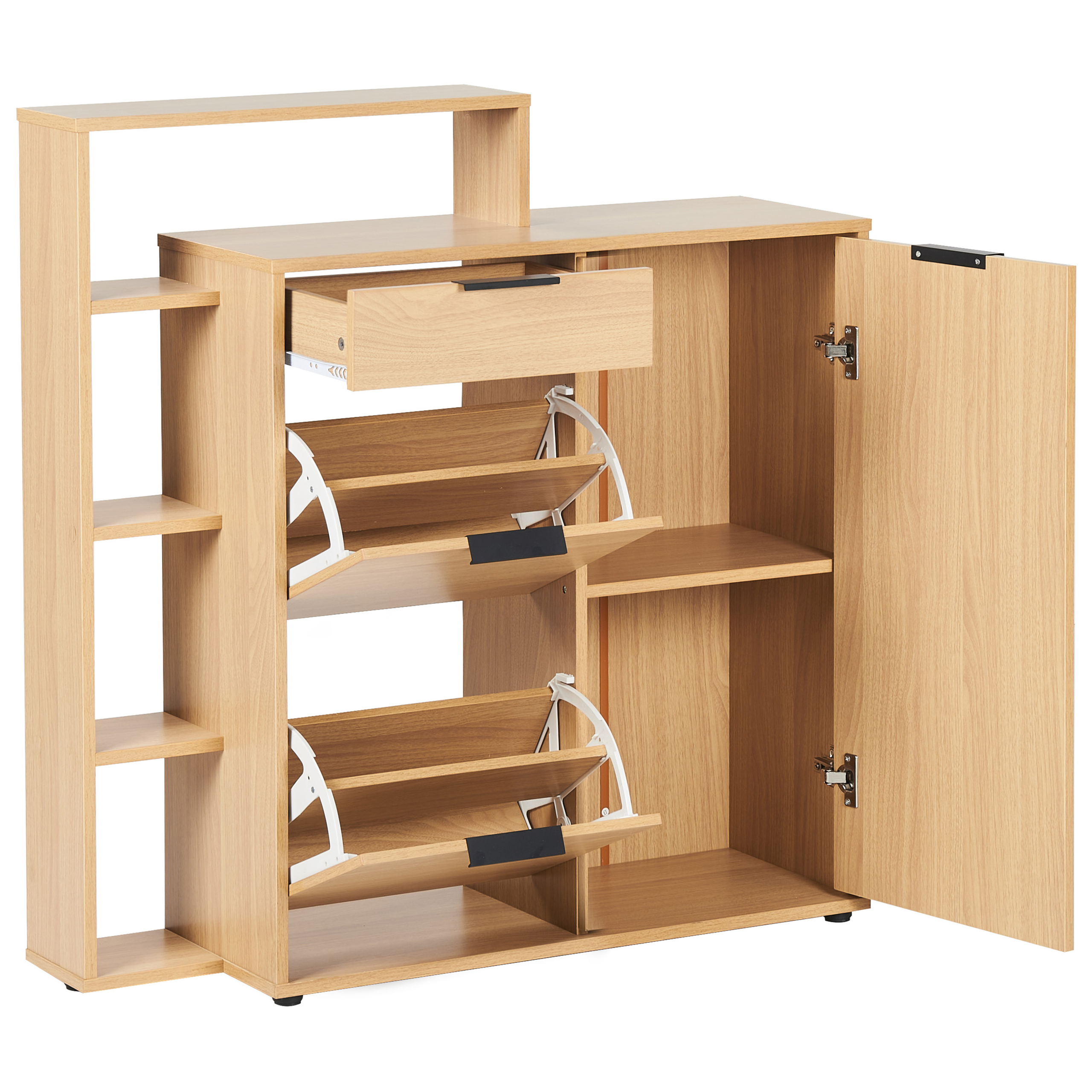 Skandinaavinen kenkäkaappi hyllyillä ja lokeroilla. Tämä tyylikäs kenkäkaappi tarjoaa käytännöllistä säilytystilaa sekä skandinaavista viehätystä. Siinä on kaksi tilavaa lokeroa kengille sekä kätevä laatikko ja kaappi, jotka tarjoavat runsaasti säilytystilaa erilaisille esineille. Sivulla sijaitsevat avohyllyt tarjoavat täydellisen paikan erilaiset koristeiden esittelyyn. Kenkäkaappi on valmistettu lastulevystä, jossa on luonnonpuuta imitoiva viimeistely. Se yhdistää kauniisti ajattoman tyylin ja päivittäisen toiminnallisuuden.