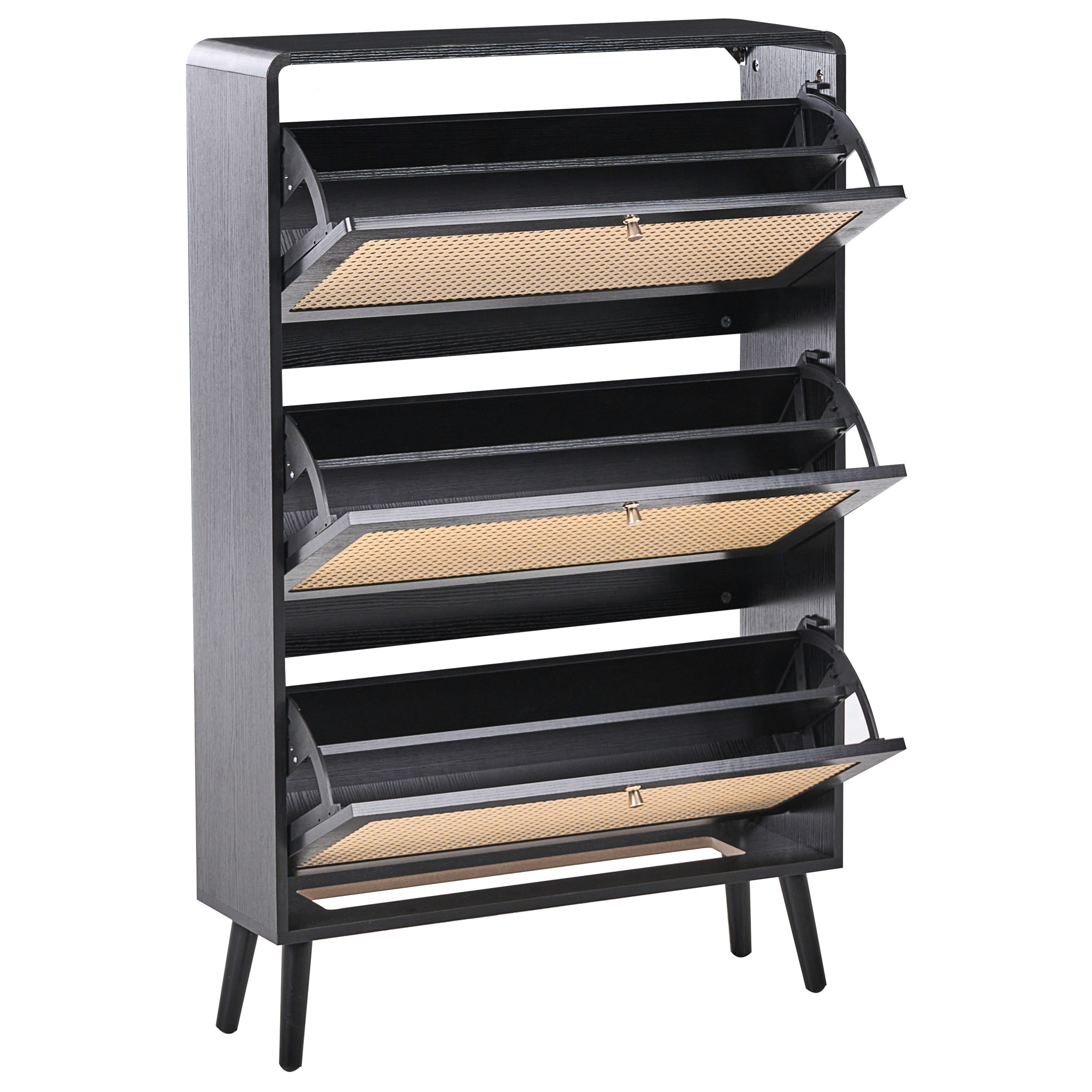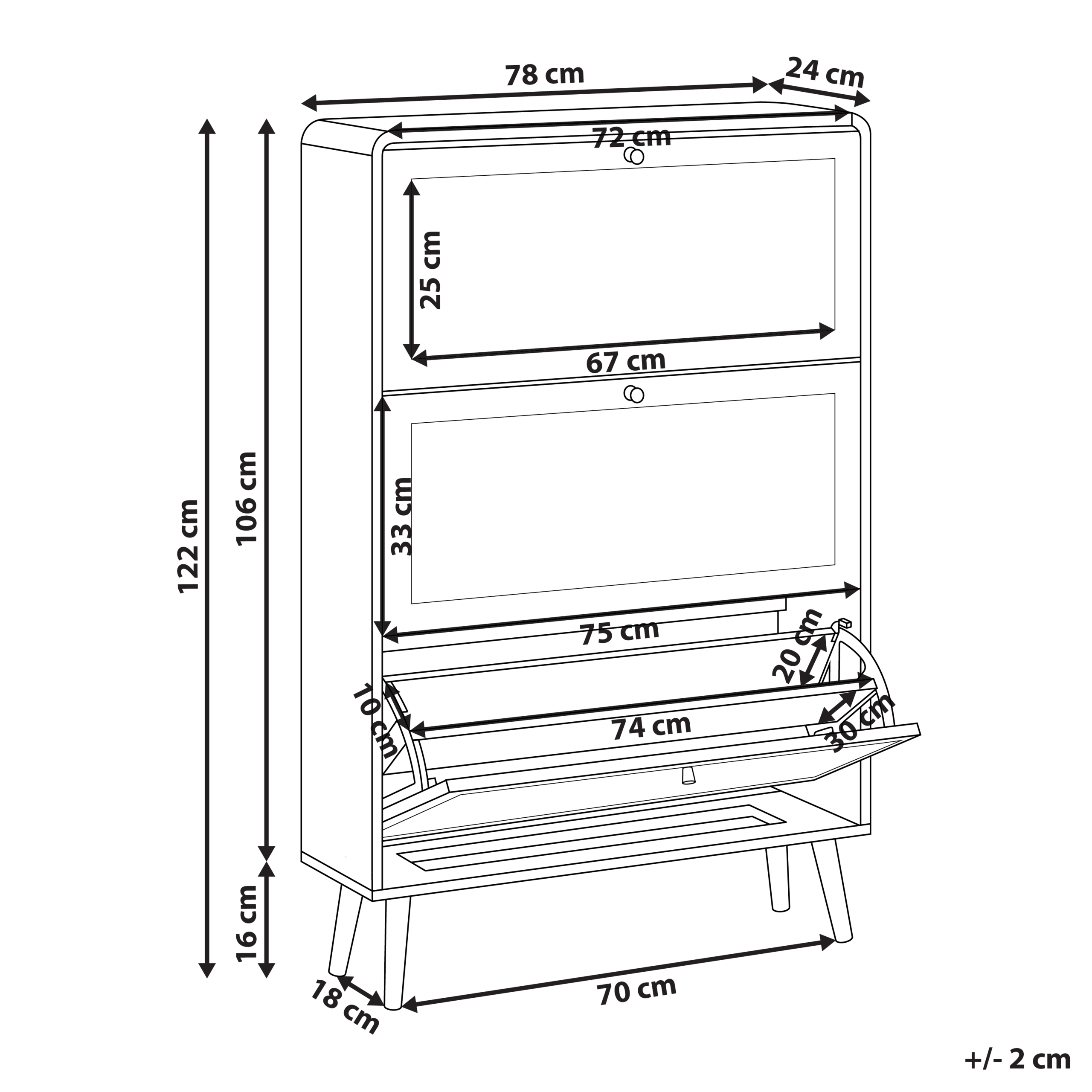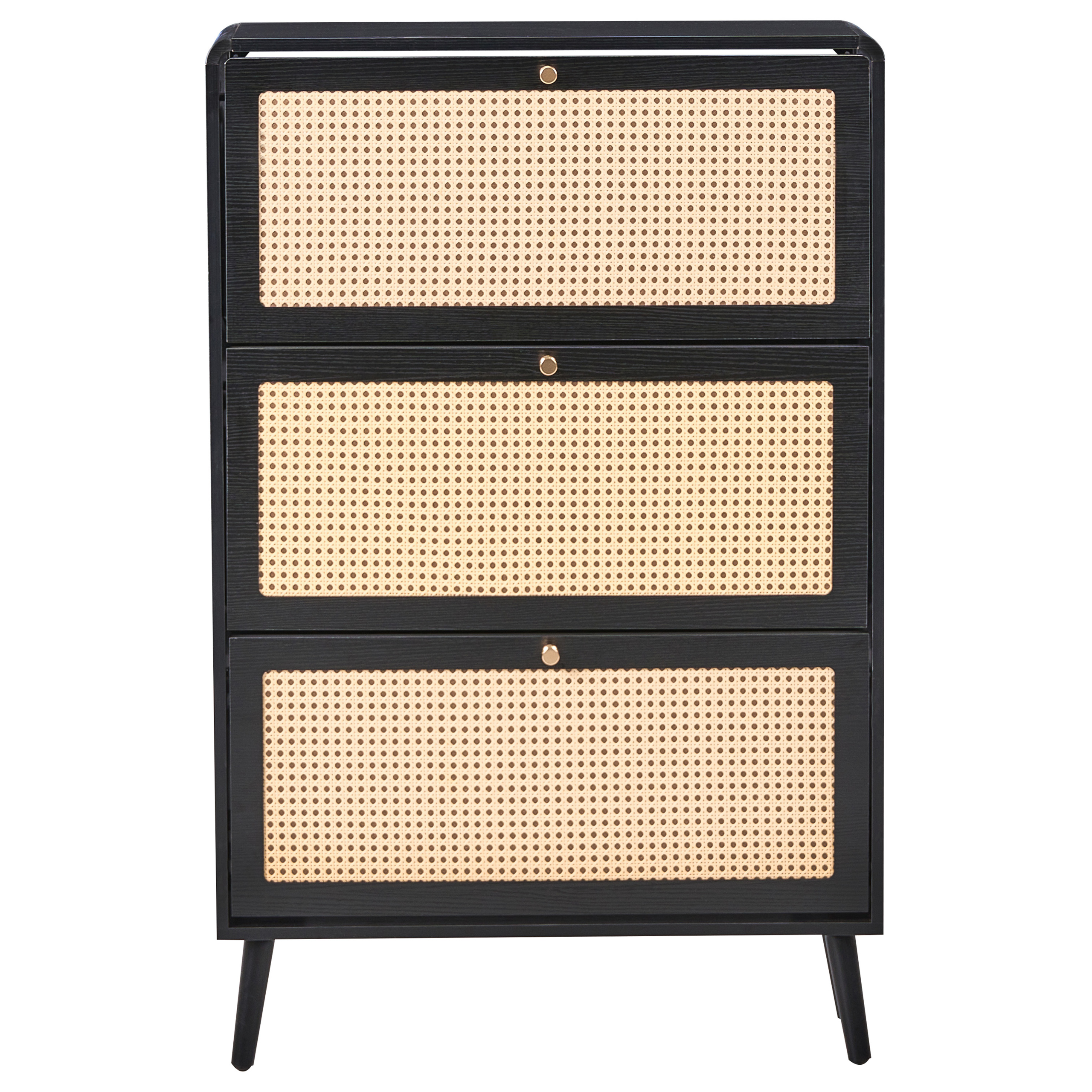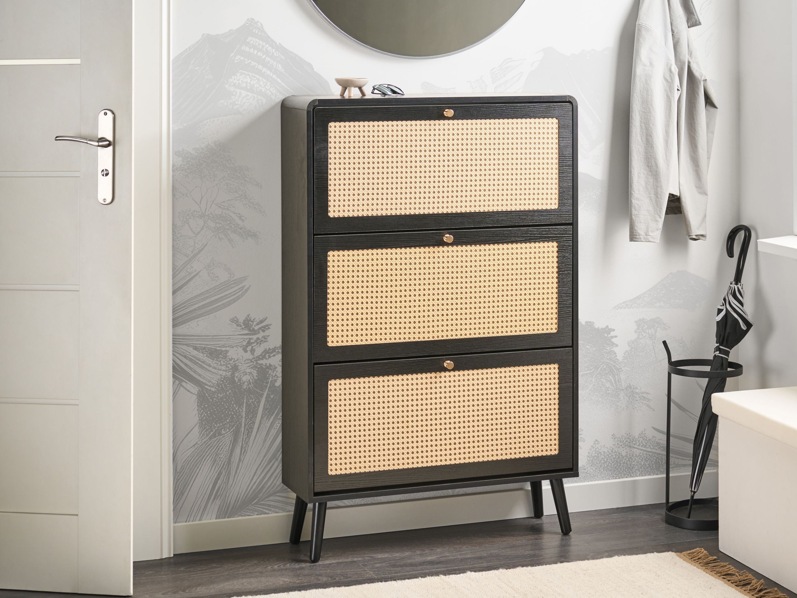 Boho-tyylinen kenkäkaappi wieniläispunotuilla korosteilla. Tämä tyylikäs kenkäkaappi on täydellinen yhdistelmä toiminnallisuutta ja boheemia muotoilua – ihanteellinen ratkaisu mihin tahansa eteiseen. Runko on valmistettu kestävästä MDF-levystä, ja siinä on kolme lokeroa, joiden etuosat on koristeltu punotulla polyrottingilla. Lokeroihin mahtuu yhteensä jopa 12 paria kenkiä, mikä auttaa pitämään tilan siistinä. Elegantti ja käytännöllinen huonekalu, joka lisää luonnollista tunnelmaa sisustukseen.
