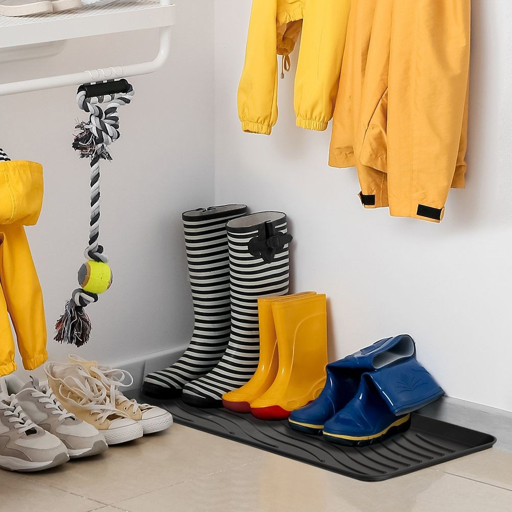 KÄYTÄNNÖLLINEN - Suorakaiteen muotoinen kenkäteline, jonka mitat ovat 77,5 x 38 x 2,5 cm. Ihanteellinen lattian suojaamiseen erilaisilta lialta.