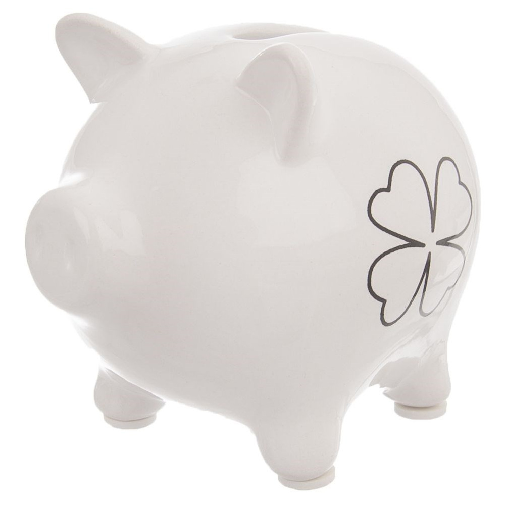 Säästöpossu, jonka mitat ovat 9 x 7,5 x 8 cm. Valmistettu korkealaatuisesta valkoisesta keramiikasta, siinä on apila-aihe. Tämä säästöpossu on loistava lahja rakkaille ja loistava tapa opettaa lapsille säästämistä, sillä siinä ei ole reikää, jonka kautta rahaa voi ottaa säästämisen aikana. Ainoa tapa ottaa rahat on rikkoa rasia. Alkuperäinen tuote tšekkiläiseltä Orion-merkiltä. Valmistettu eurooppalaisten standardien mukaisesti.