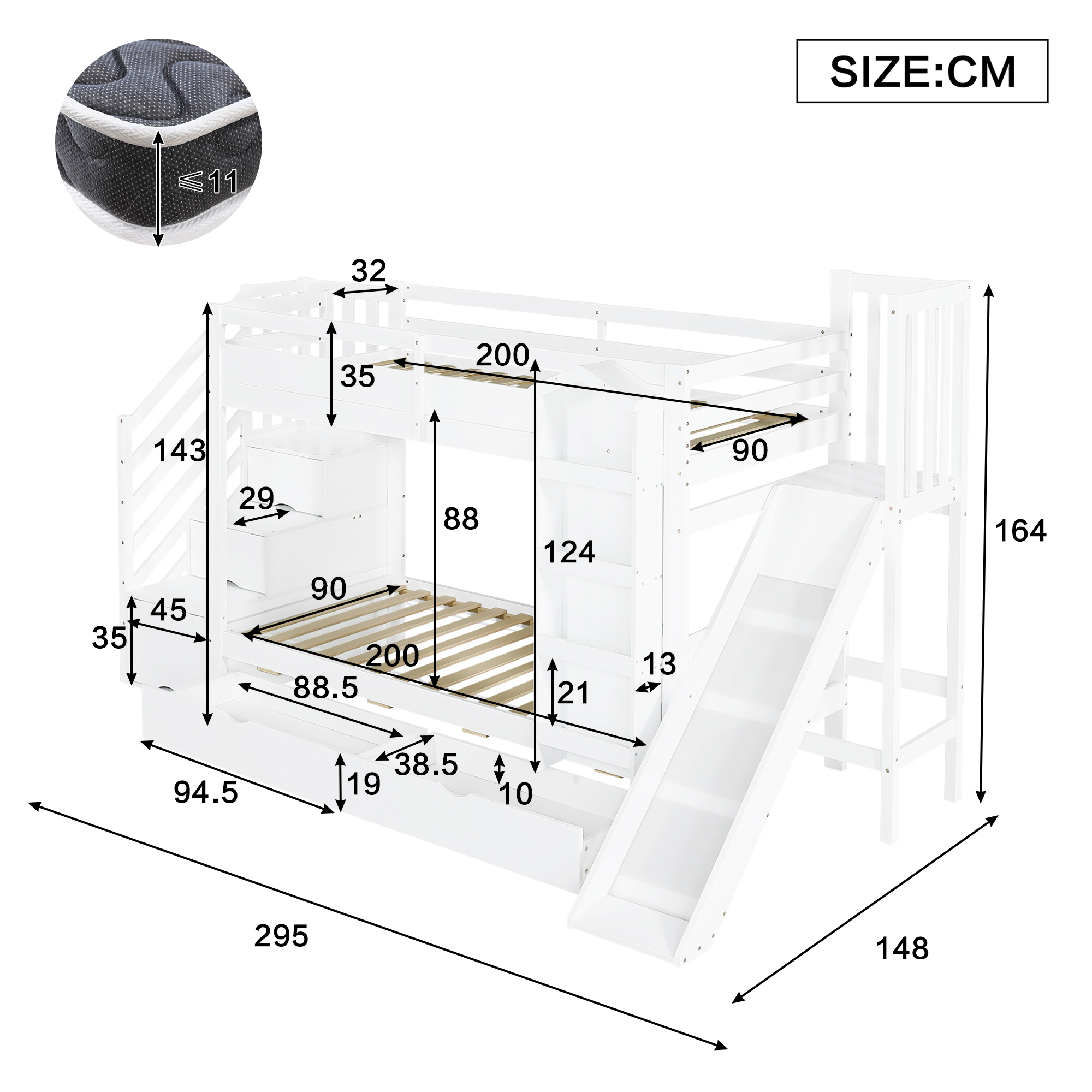 Sopivat patjat (patja ei sisälly) 90x200 cm (patjan paksuus ≤11 cm)