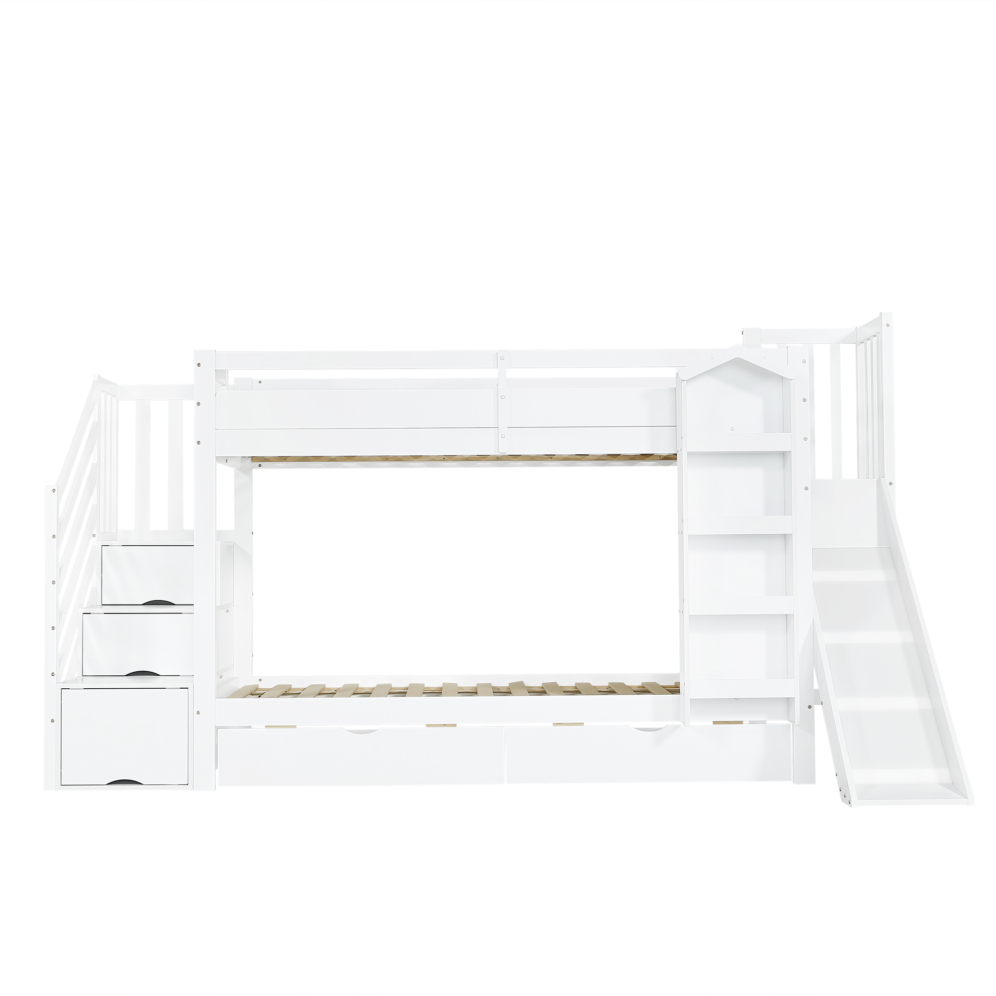 Kerrossänky, 90x200 cm, lapset, kirjahylly, liukumäki, säilytysportaat, valkoinen