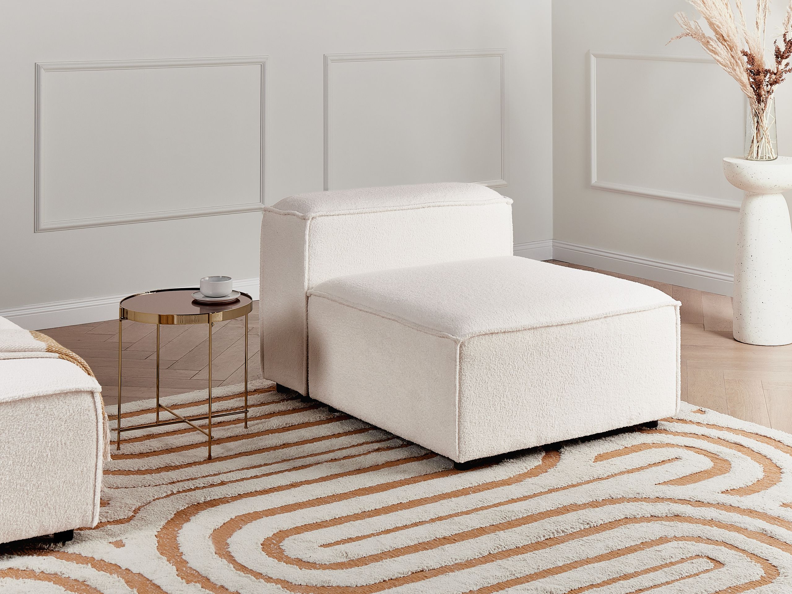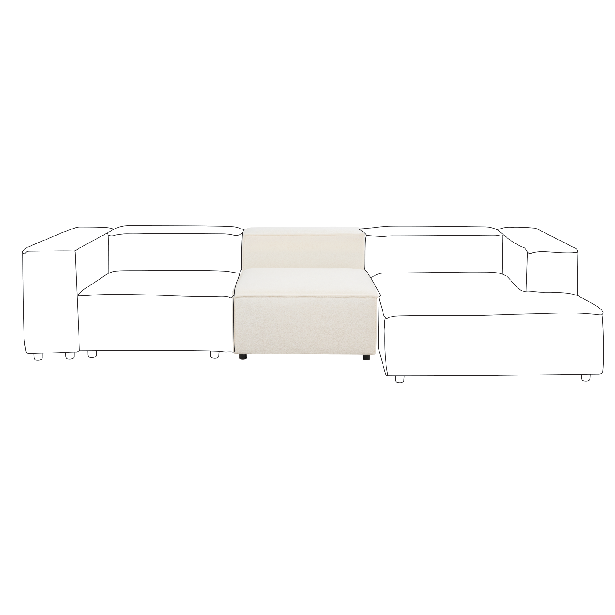Moderni moduulisohvan keskipala. Päivitä olohuoneen sisustusta ja tee siitä kodin tyylikkäin oleskelupaikka tällä keskimoduulilla. Pehmeällä ja laadukkaalla bukleekankaalla verhoillussa keskipalassa on kestävä puurakenne ja tukevat mustat synteettiset jalat. Herttainen luonnonvalkoinen sävy saa sen sulautumaan täydellisesti mihin tahansa moderniin tai perinteiseen sisustukseen. Keskimoduuli on monikäyttöinen valinta, jota voidaan käyttää itsenäisenä elementtinä tai yhdessä malliston muiden kappaleiden kanssa ainutlaatuisen kokonaisuuden luomiseksi.