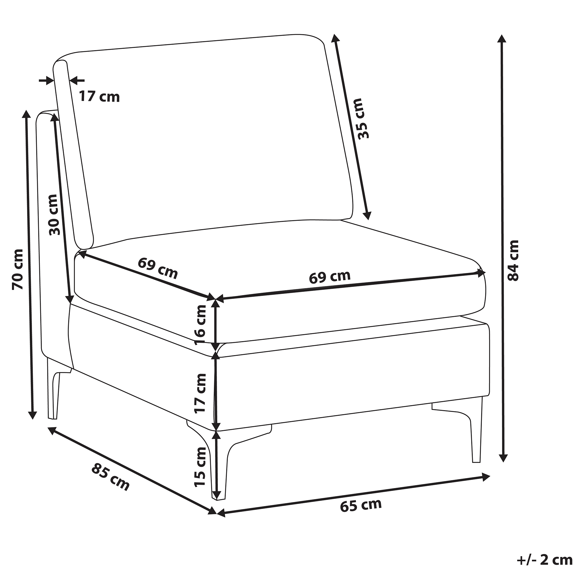 Moderni moduulisohvan keskiosa. Laajenna sohvaa tällä keskimoduulilla. Se on samankokoinen kuin kaikki kokoelman kappaleet, joten se on mahdollista sijoittaa miten tahansa tilaan sopivan kokonaisuuden luomiseksi. Keskiosassa on paksusti pehmustetut tyynyt, jotka takaavat istumamukavuuden ja irrotettavien päällisten ansiosta ne on helppo pestä. Runko on valmistettu vankasta eukalyptuspuusta, joka on verhoiltu ylellisellä sametilla. Kiiltävät, hopeat metallijalat antavat keskipalalle puhtaan nykyaikaisen ilmeen. Yhdistä ja sommittele muiden kokoelman osien kanssa täydellisen istuinryhmän luomiseksi.