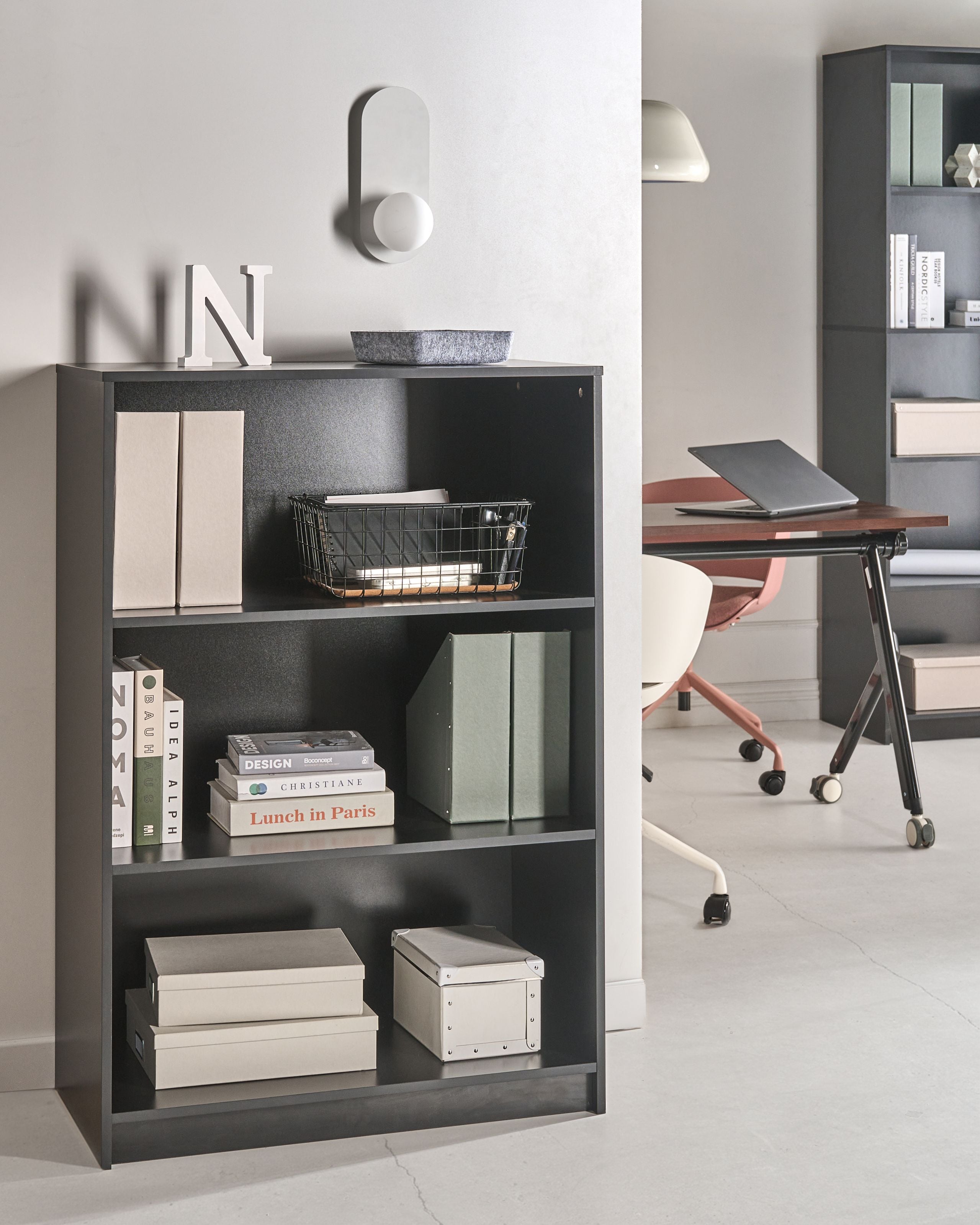 Minimalistinen kirjahyllykkö. Nauti järjestyksessä olevasta tilasta tällä kirjahyllyllä, joka on valmistettu kestävästä lastulevystä. Sen monipuolinen muotoilu tarjoaa runsaasti hyllytilaa kirjoille, koriste-esineille ja säilytyslaatikoille – täydellinen valinta mihin tahansa huoneeseen. Tyylikäs musta hylly, joka on ihanteellinen ratkaisu tavaroiden siistiin esillepanoon käden ulottuvilla.