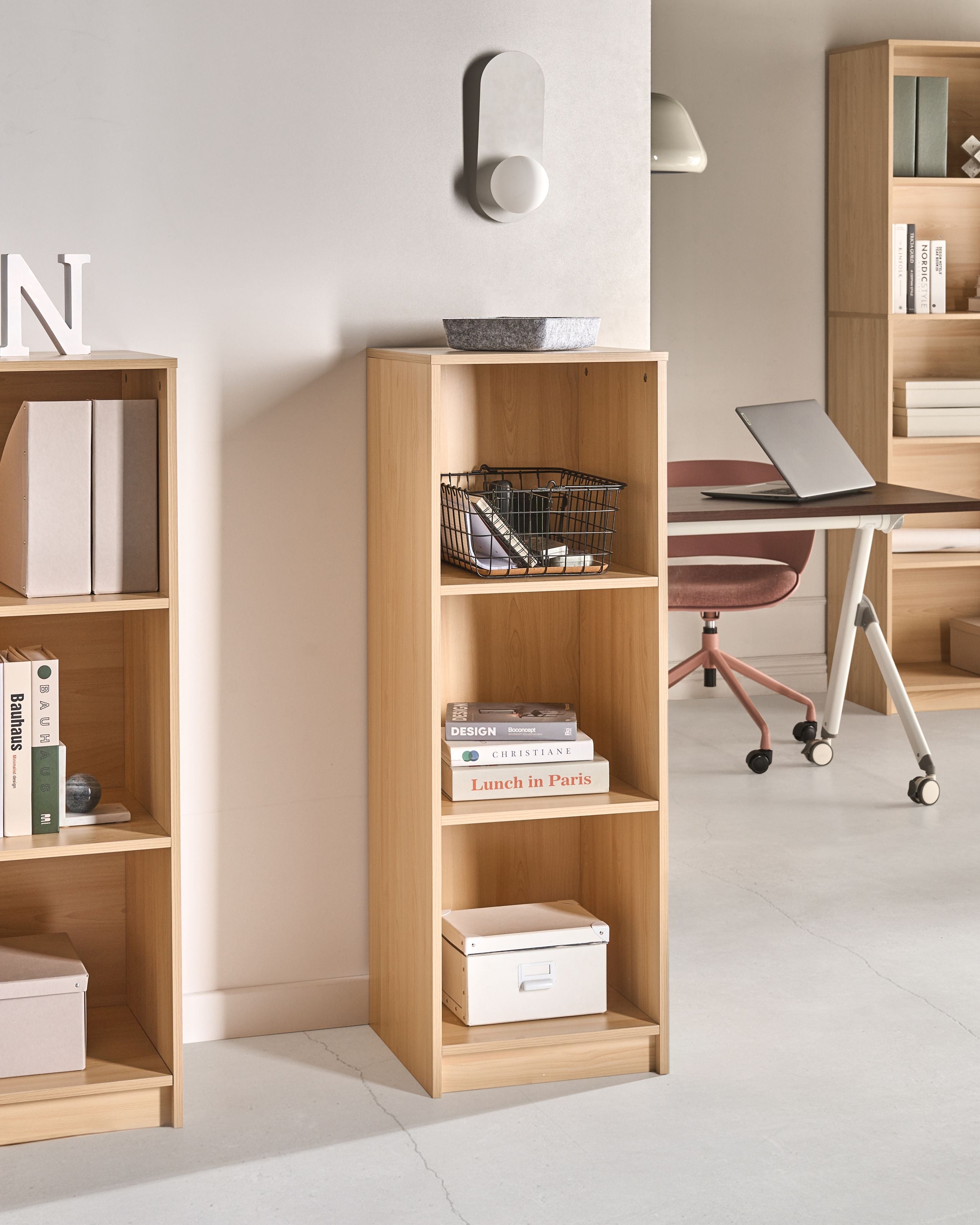 Minimalistinen kirjahyllykkö. Nauti järjestyksessä olevasta tilasta tällä kapealla kirjahyllyllä, joka on valmistettu kestävästä lastulevystä. Sen monipuolinen muotoilu tarjoaa runsaasti hyllytilaa kirjoille, koriste-esineille ja säilytyslaatikoille – täydellinen valinta mihin tahansa huoneeseen. Tyylikäs vaaleanruskea hylly, joka on ihanteellinen ratkaisu tavaroiden siistiin esillepanoon käden ulottuvilla.