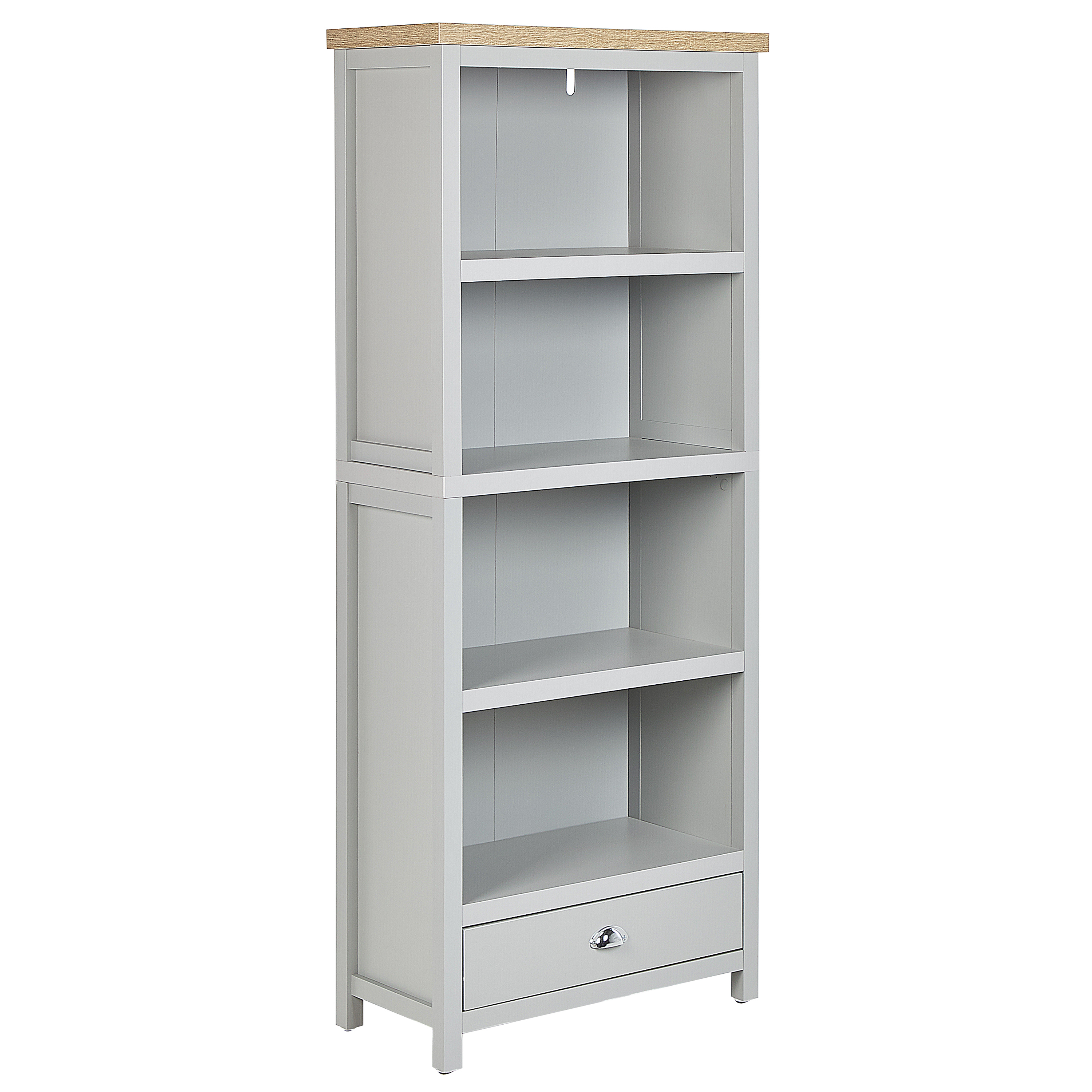 Rustiikkinen nelitasoinen hylly laatikolla. Tyylikäs ja käytännöllinen kirjahylly, joka on täydellinen lisä mihin tahansa makuu- tai olohuoneeseen. Neljä leveää hyllyä tarjoavat runsaasti tilaa kirjojen ja koristeiden säilyttämiseen ja esillepanoon. Kirjahylly on valmistettu lastulevystä ja viimeistelty vaaleanharmaalla värillä, jonka ansiosta se sopii erinomaisesti skandinaaviseen tai perinteiseen sisustukseen.