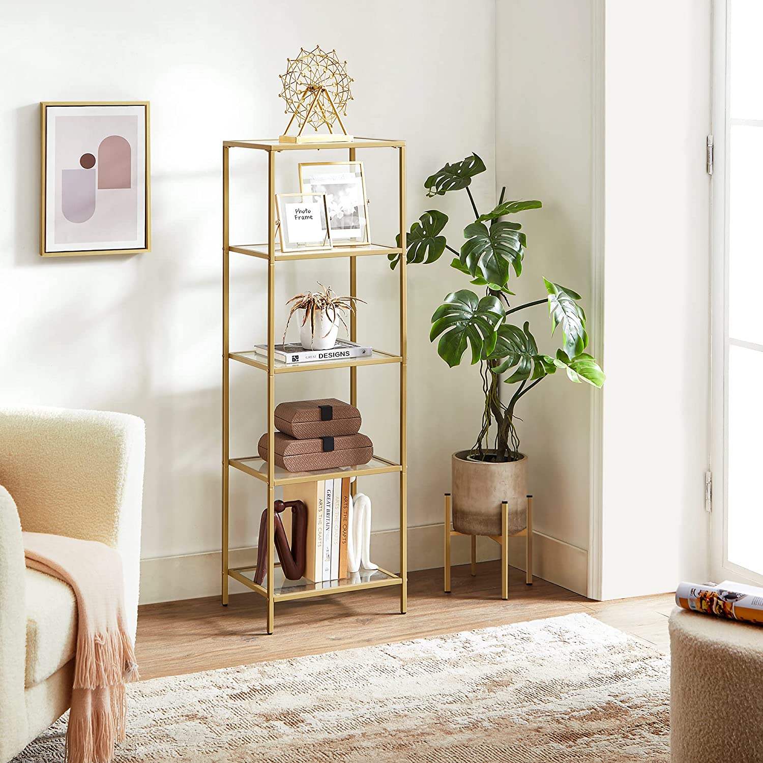 Moderni ja ylellinen, silti pelkistetty hyllykkö, jossa on kullanvärinen pulverimaalattu teräsrunko ja karkaistusta lasista valmistetut hyllytasot. Viisi tasoa tarjoaa runsaasti tilaa kirjoille, maljakoille, koriste-esineille, leluille ja valokuvakehyksille. Sopii olohuoneeseen, makuuhuoneeseen, eteiseen, kotitoimistoon tai keittiöön.
