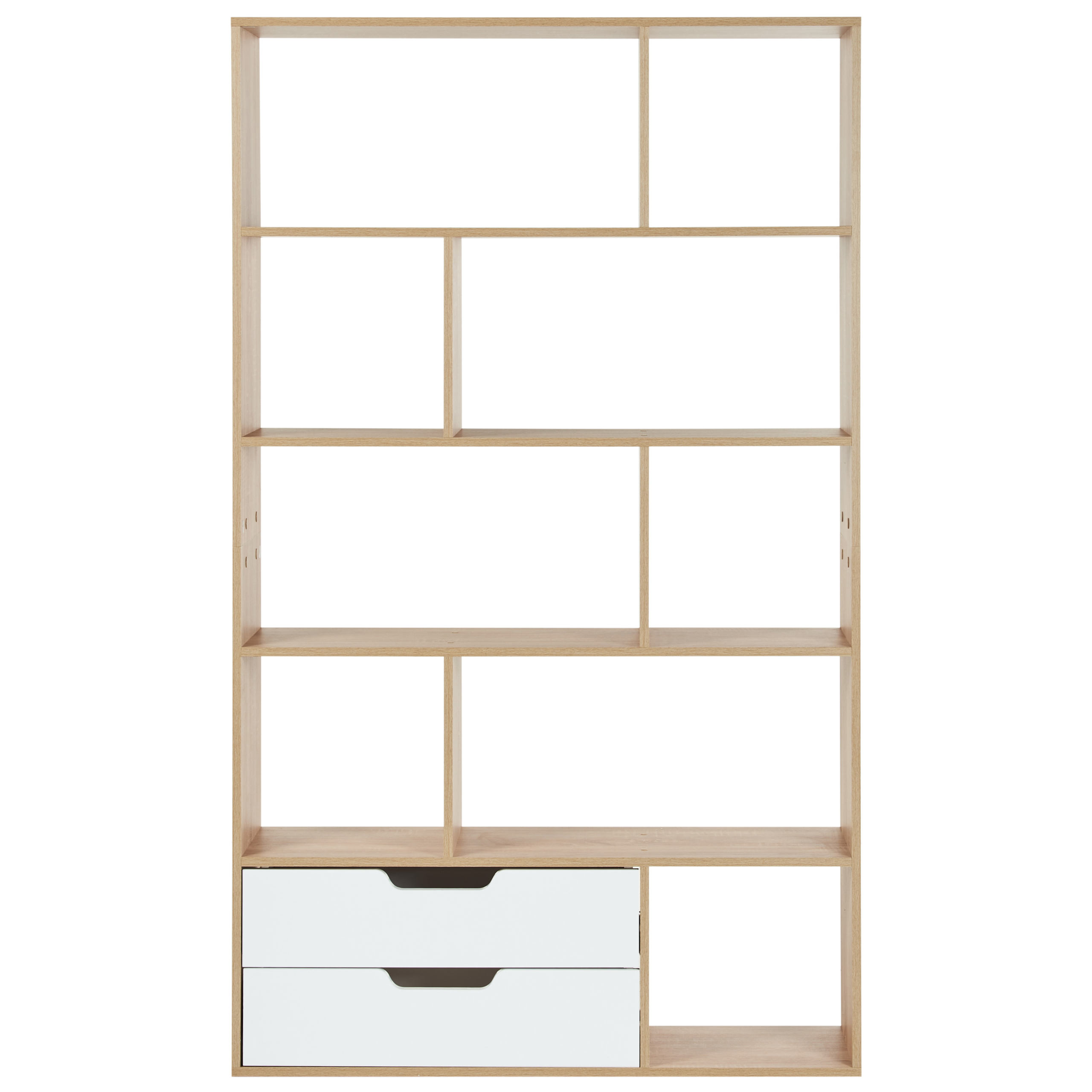 Skandinaavinen avokirjahylly laatikoilla. Tämä tyylikäs kirjahylly yhdistää vaivattomasti luonnolliset puun sävyt ja raikkaan valkoisen, luoden modernin mutta lämpimän kokonaisuuden. Avohyllyt tarjoavat runsaasti tilaa kirjoille, koristeille ja muistoesineille, kun taas laatikot tarjoavat piilotettua säilytystilaa pienemmille tavaroille. Hylly on valmistettu laminoidusta lastulevystä, mikä tekee siitä käytännöllisen ja elegantin lisän mihin tahansa olohuoneeseen, kotitoimistoon tai lukunurkkaukseen.