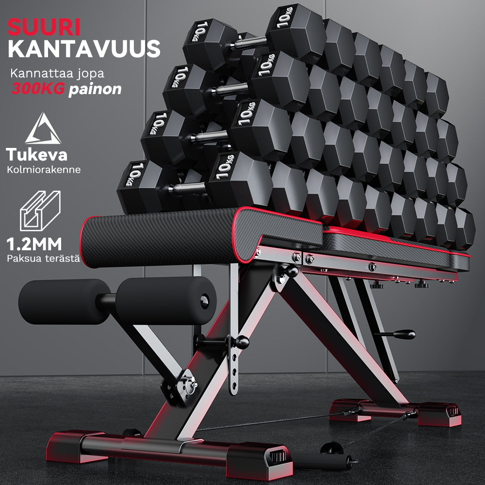 Kokoontaitettava harjoittelupenkki säädettävillä selkänojan ja istuimen tasoilla kotitreeniin ja voimanrakennukseen
