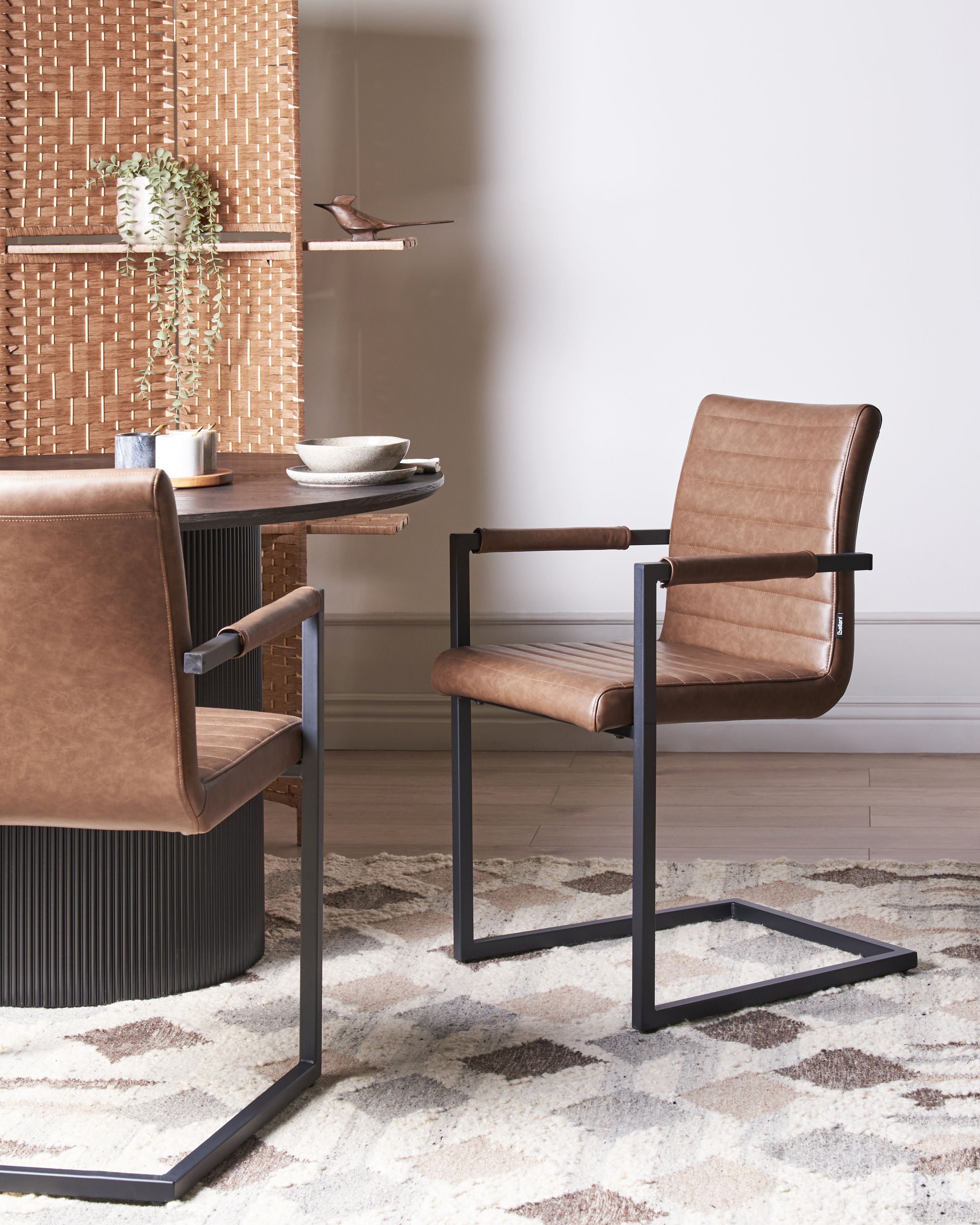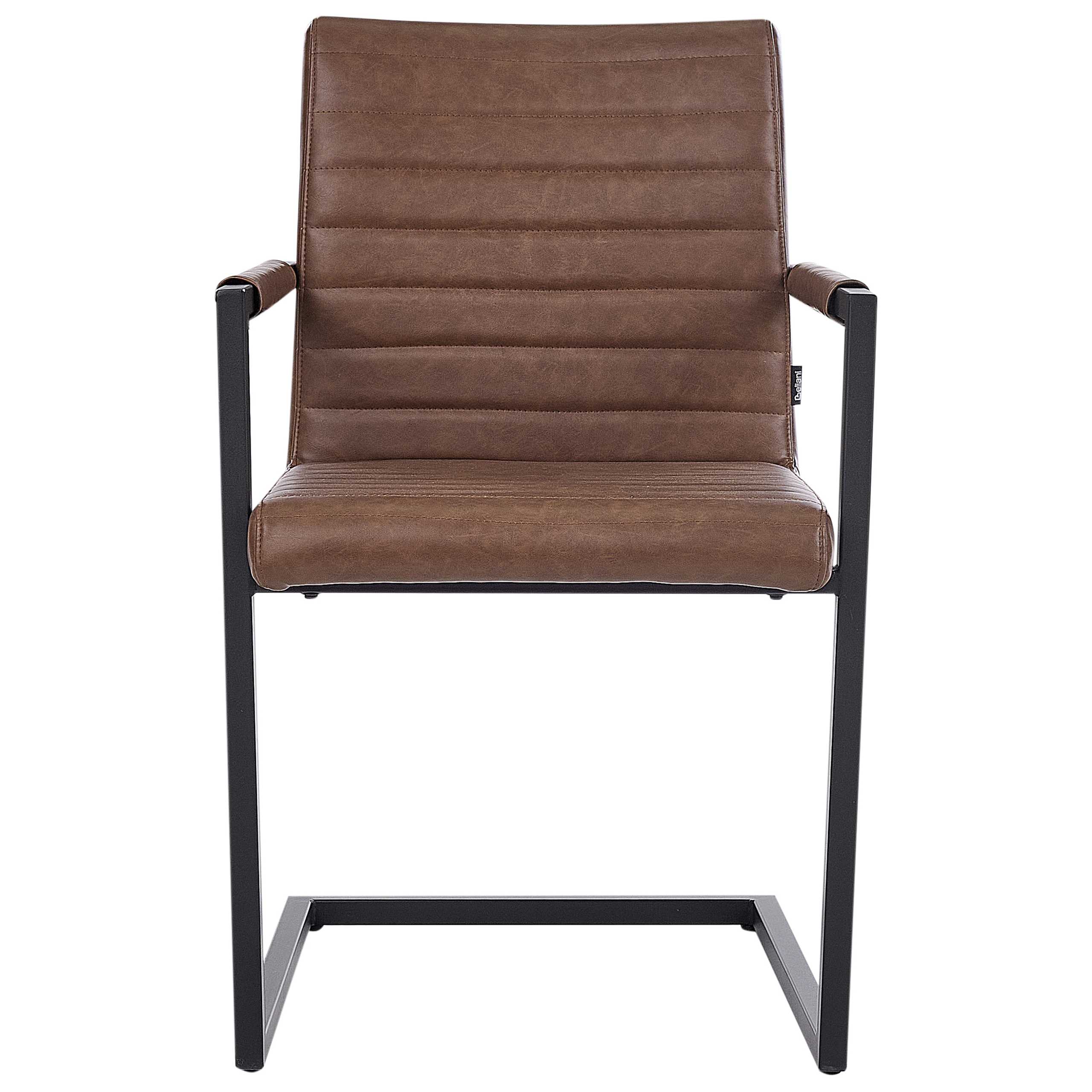 Kauniit verhoillut kokoushuoneen cantilever-tuolit. Tämä tyylikäs kahden tuolin setti sulautuu sekä moderneihin että retrotyylisiin sisustuksiin. Tuolien mattapintainen cantilever-runko takaa vakauden ja tasapainon, ja jalkojen alla olevat suojatapit suojaavat lattiaa naarmuilta. Pehmeästi pehmustetut istuimet on verhoiltu kauniin ruskealla keinonahalla ja viimeistelty koristeellisella vakaasuoralla tikkauksella. Minimalistisen muotoilunsa ansiosta ne sopivat hyvin kokoushuoneeseen, ruokailutilaan tai keittiöön.