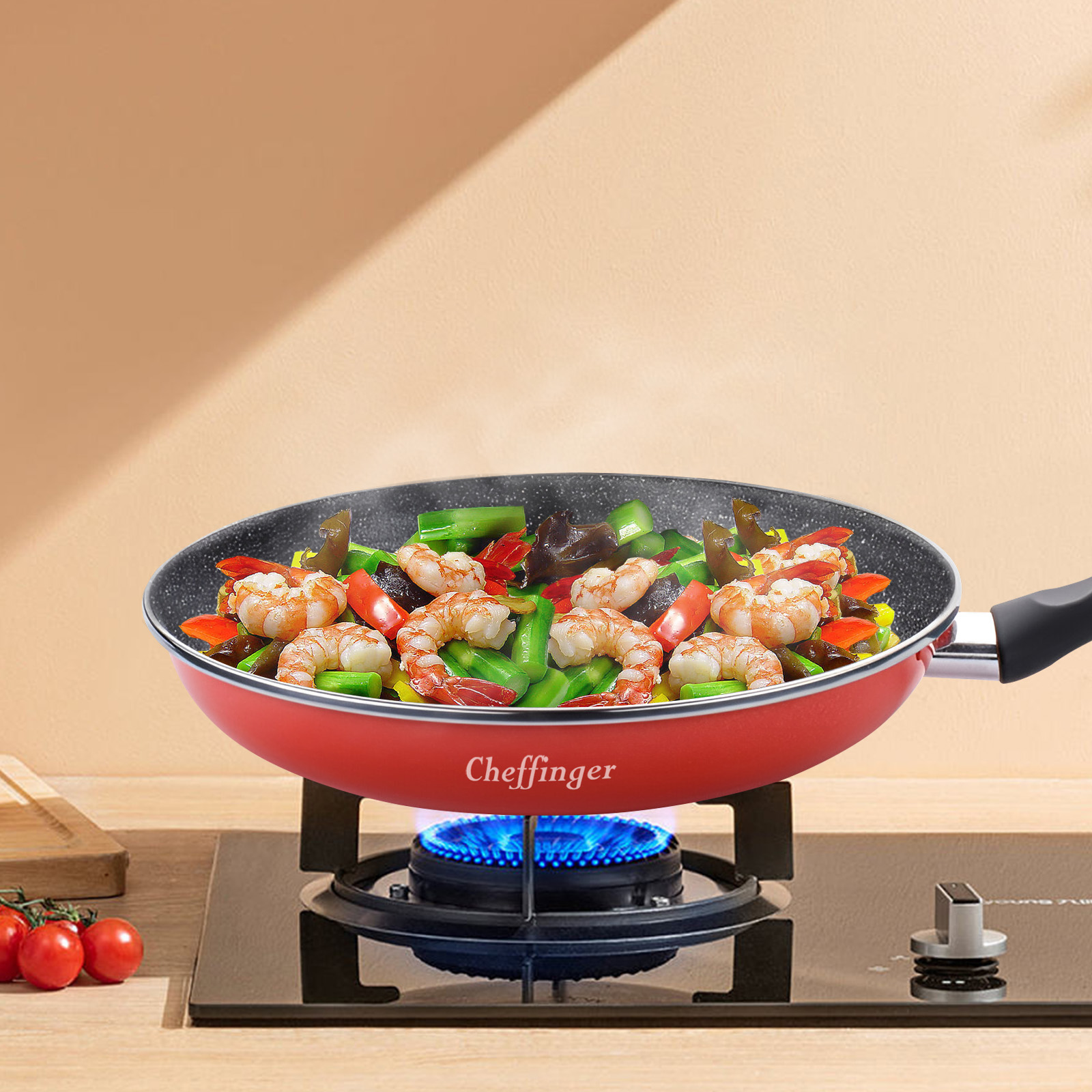 Tässä Cheffingerin kolmikokoisessa (20 cm, 24 cm ja 28 cm) pannusarjassa yhdistyvät moderni muotoilu ja käytännöllisyys. Musta marmoripinnoite antaa niille tyylikkään ja naarmuuntumattoman ulkonäön. Ergonomiset pehmeäkahvaiset silikonikahvat takaavat turvallisen ja mukavan otteen. Paksu pohja takaa tasaisen lämmönjakautumisen täydellisiä ruoanlaittotuloksia varten.